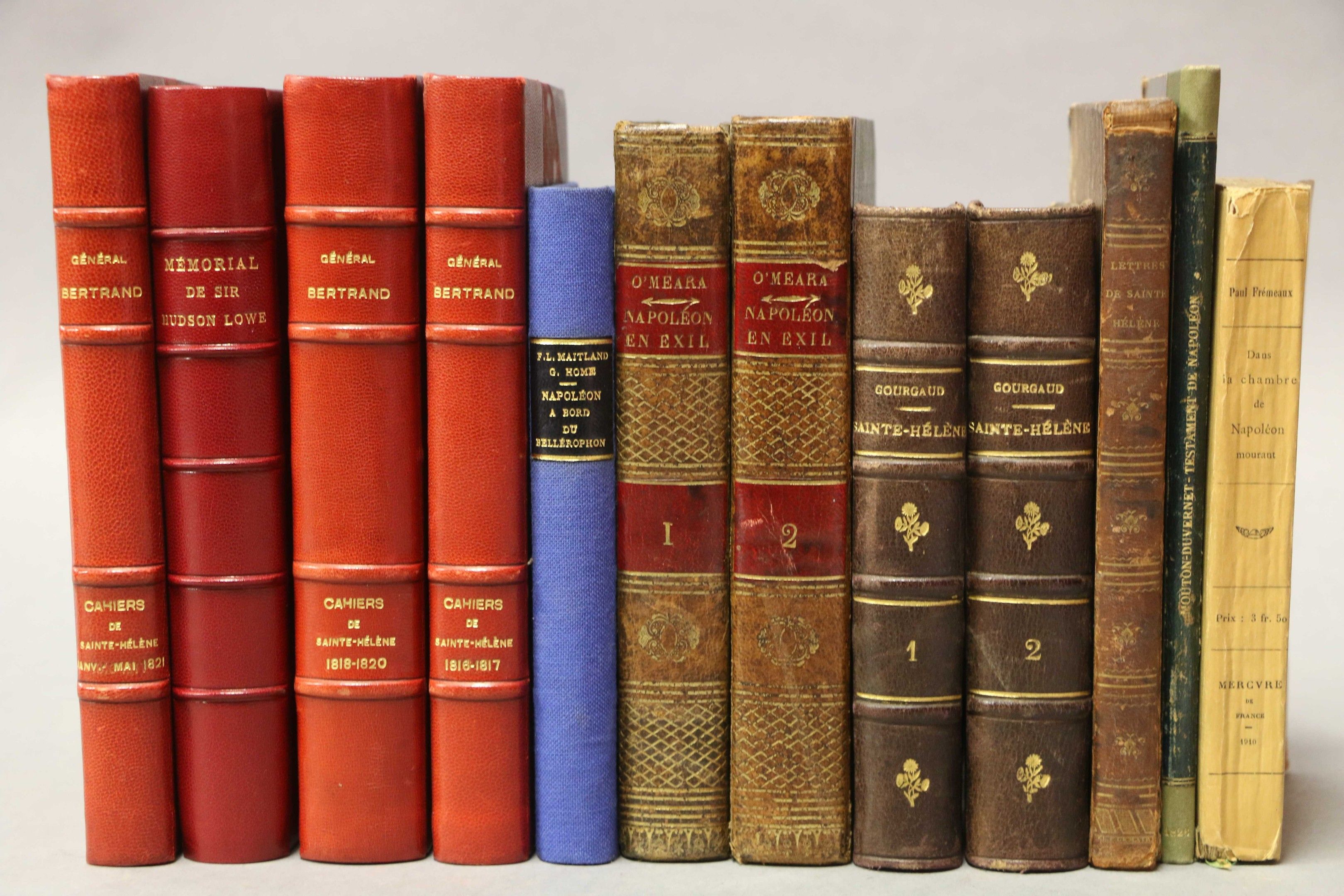 SAINTE-HELENE - O' MEARA (Barry). Napoleon in exile or the echo of Saint Helena. Paris, De l'imprimerie de Constant, 1822, 2 vol. in-8, half calf, smooth spine, ornamented, red title-piece (contemporary binding). Without facsimile. Damage to upper spine. - CORRESPONDENCE of William Warden, surgeon, on board of his british majesty's vessel the Northumberland which took Napoleon Buonaparte to the island of St. Helena. Second edition. Brussels, Parkin, 1817, in-8, half calf, smooth spine with mq. - MEMORIAL by Sir Hudson Lowe relating to Napoleon's captivity on St. Helena. Paris, Dureuil, 1830, in-8, red half calf, ribbed spine (mod. rel.). With a frontispiece and an engraving. - GOURGAUD (General baron). Sainte-Hélène. Journal inédit de 1815 à 1818. Paris, Flammarion, 2 vol.in-12, s.d., half calf plum, spine ribbed. - MAITLAND. Napoleon aboard the Bellérophon. Memoirs of Captain Maitland. Paris, Plon, s.d., in-12, full blue cloth (mod. rel.). Illustrated. - FREMEAUX. Dans la chambre de Napoléon mourant. Paris, Mercure de France, 1910, in-12, br. - BERTRAND (General). Cahiers de Sainte-Hélène.1816-1821. Paris, Sulliver, s.d., 3 vol. in-8, half-rel. with red chag. corners, ribbed spine, cover preserved, gilt head (mod. rel.). - TESTAMENT of Napoleon Bonaparte. J.C. Mouton Duvernet legatee of Napoleon and son of the lieutenant general condemned and put to death in Lyon in 1815 to count de Montholon and general Bertrand. Paris, Fanjat, 1826, in-8, green silk half-rel. Plaquette. Set of 12 vol.