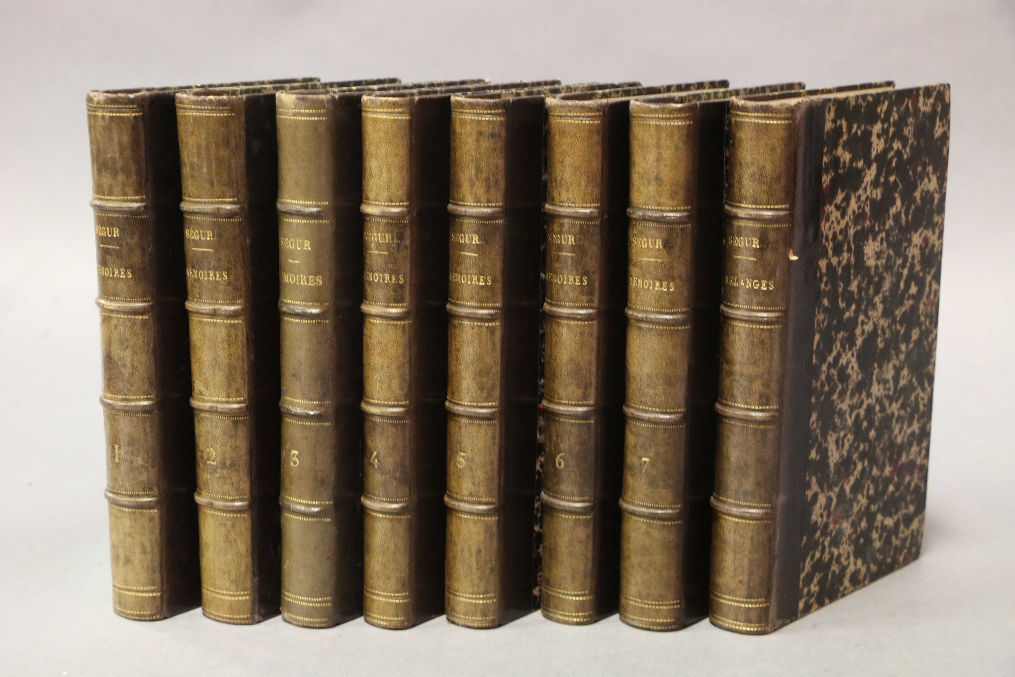 SEGUR (General Cte de). Histoire et mémoires. Paris, Firmin-Didot, 1873, 8 vol. in-8, half calf plum, spine ribbed, decorated and sunned. FIRST EDITION. The 8th volume Mélanges comprises the memories and musings of an octogenarian. Without the portrait and facsimile which are often lacking.