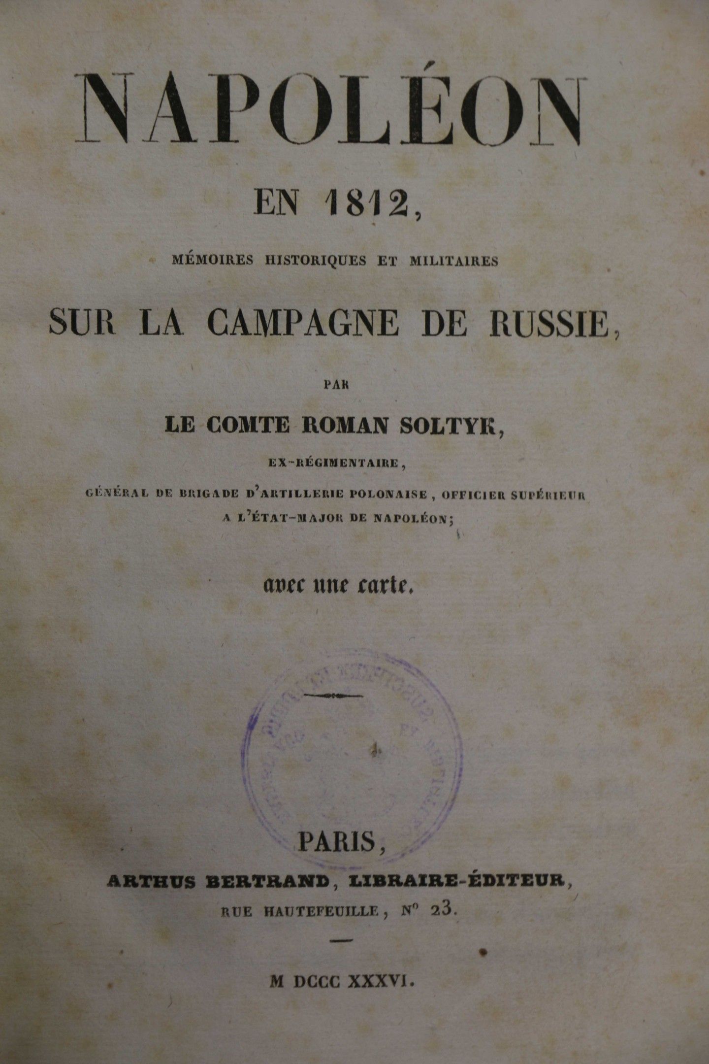 SOLTYR (Count Roman). Napoleon in 1812. Historical and military memoirs on the Russian campaign. Paris, Arthus-Bertrand, 1836, in-8, half calf plum, smooth spine, richly decorated, stamp on title. With a folded hors-texte map.