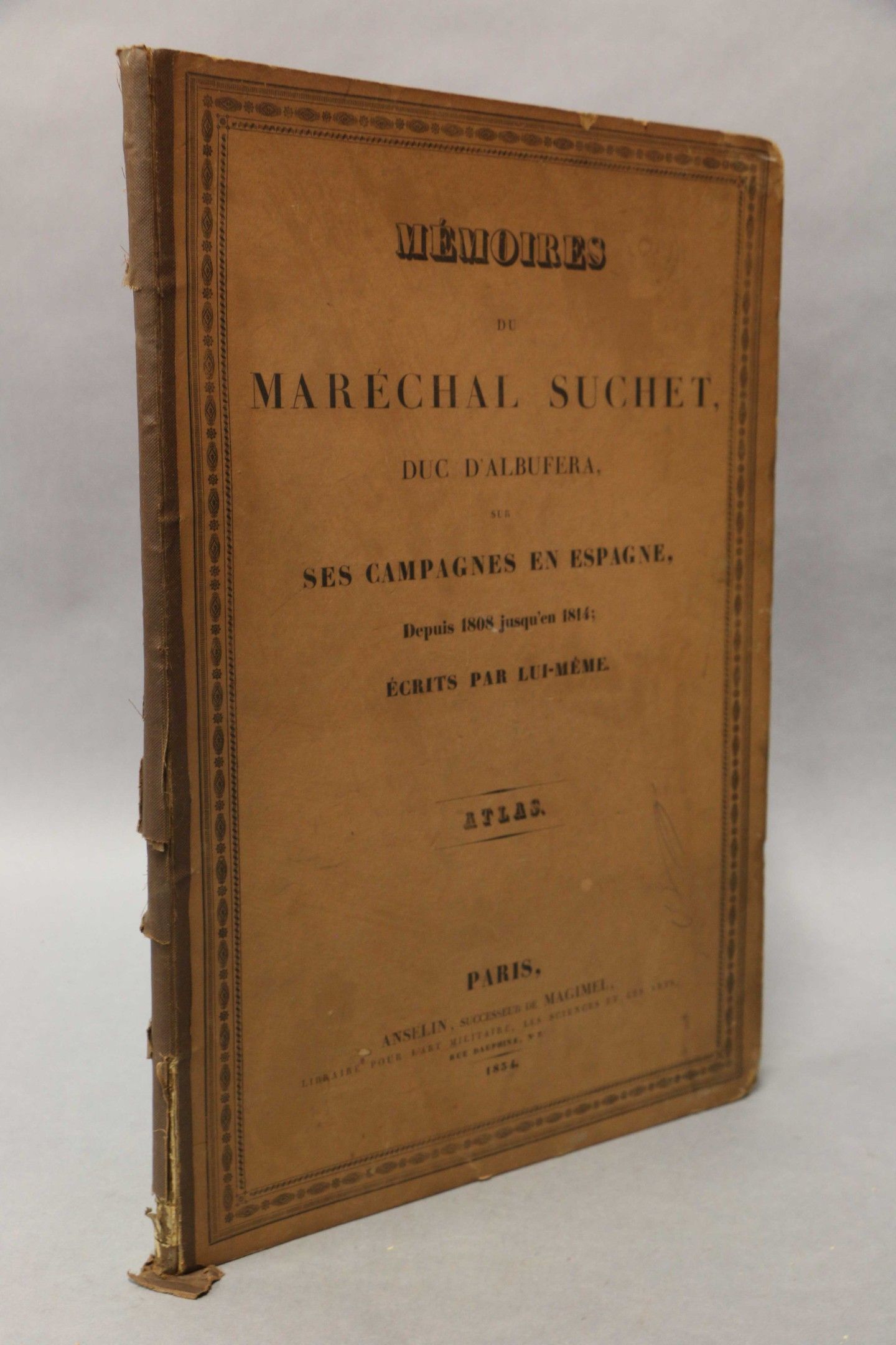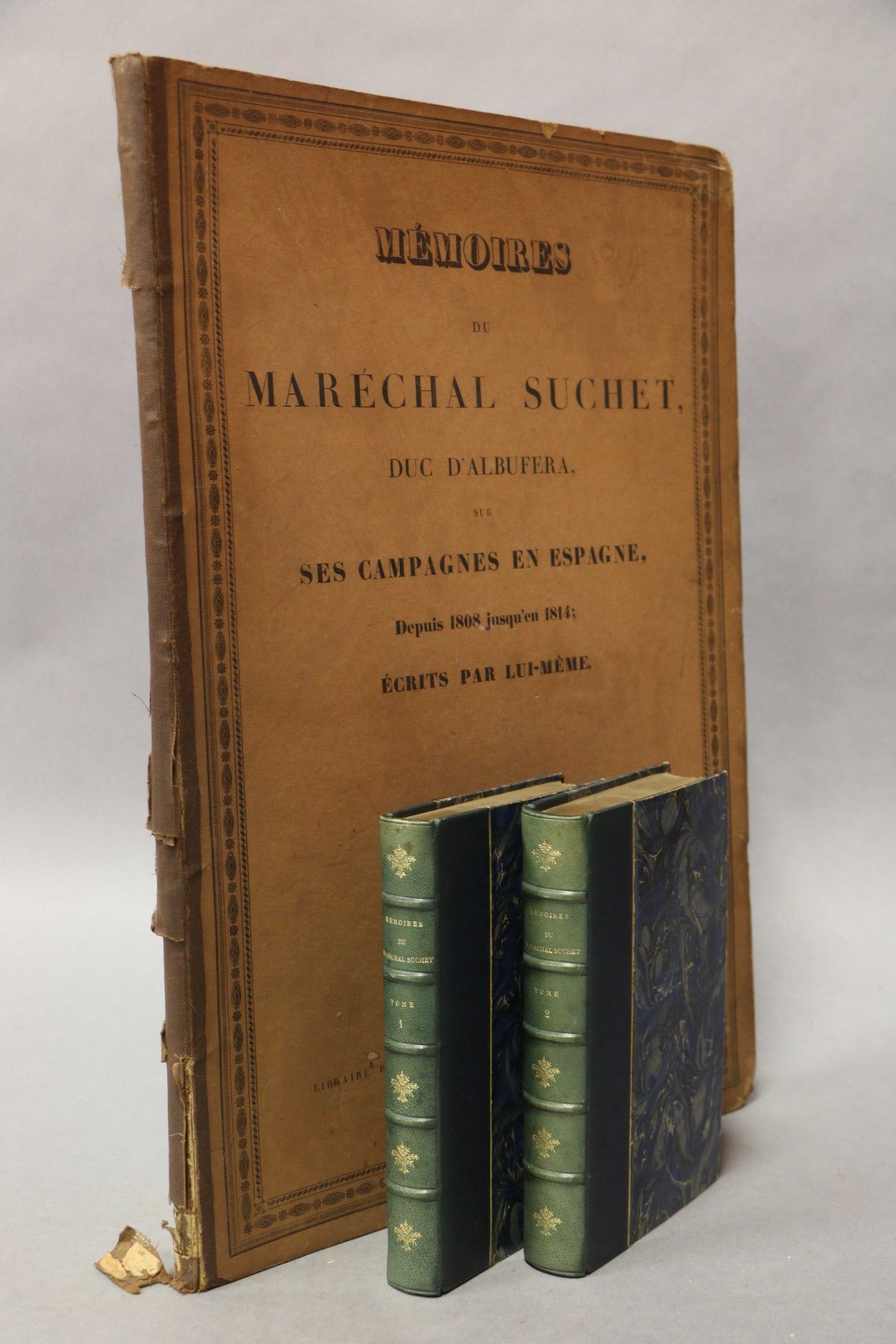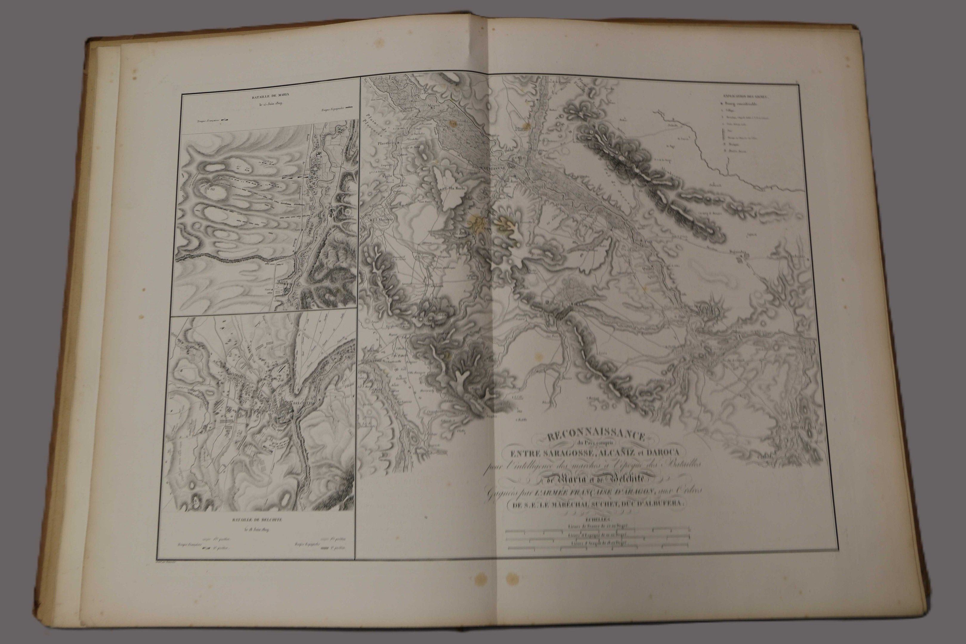 SUCHET (Marshal). Mémoires sur ces campagnes en Espagne depuis 1808 jusqu'en 1814. Paris, Bossange, 1828, 2 vol. in-8, blue half calf, spines ribbed, decorated and sunned, gilt head, covers preserved. FIRST EDITION. With a portrait and 2 tables + an ATLAS : Mémoires du Maréchal Suchet, duc d'Albufera sur ses campagnes en Espagne. Paris, Anselin, 1834, fol. half-rel. brown cloth (worn binding, spine loose). With 16 maps mounted on tabs. Some spotting and foxing.