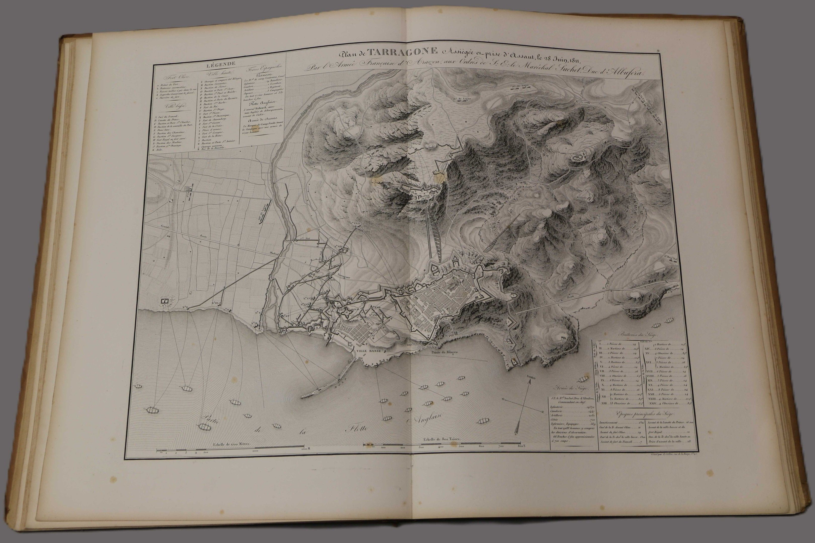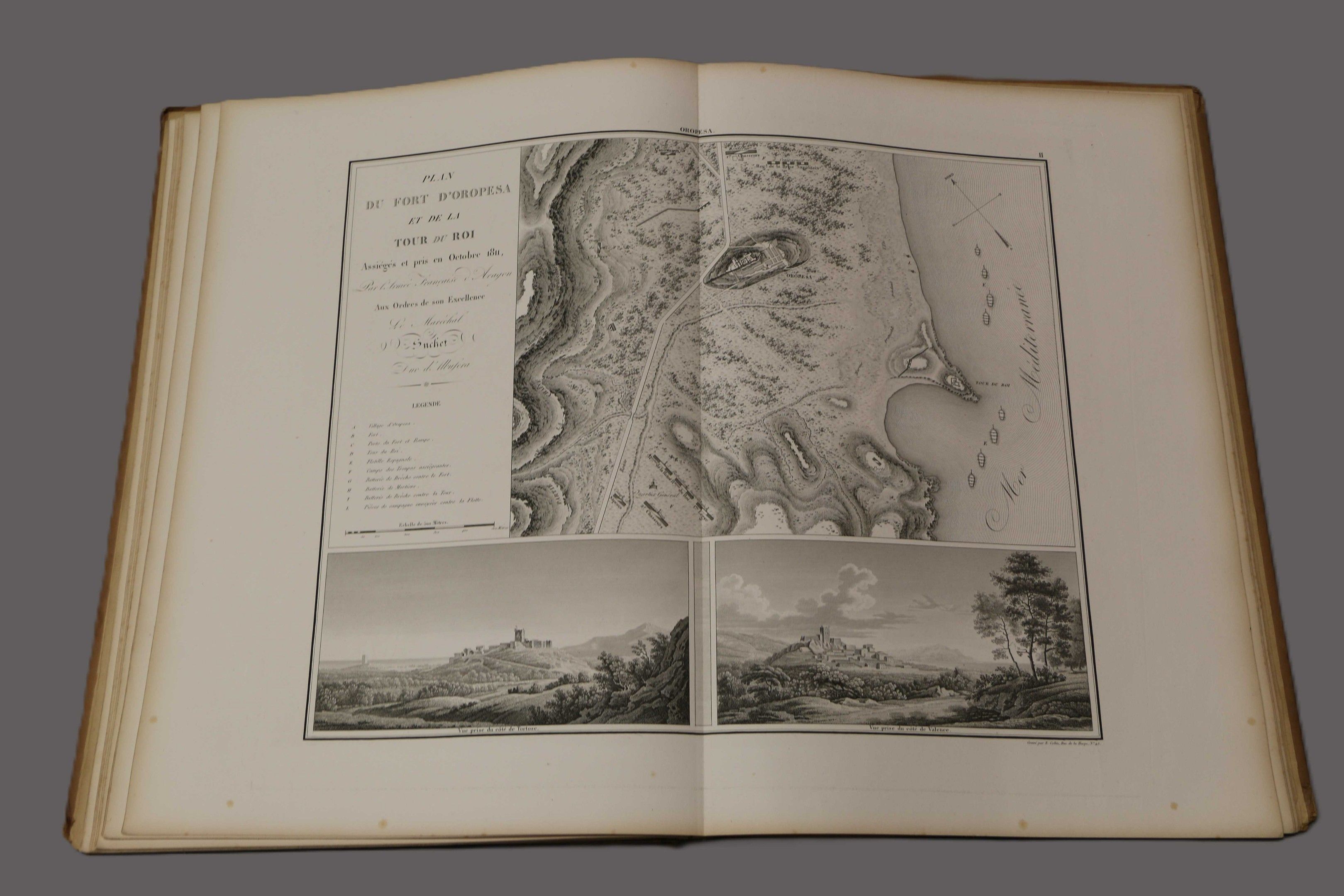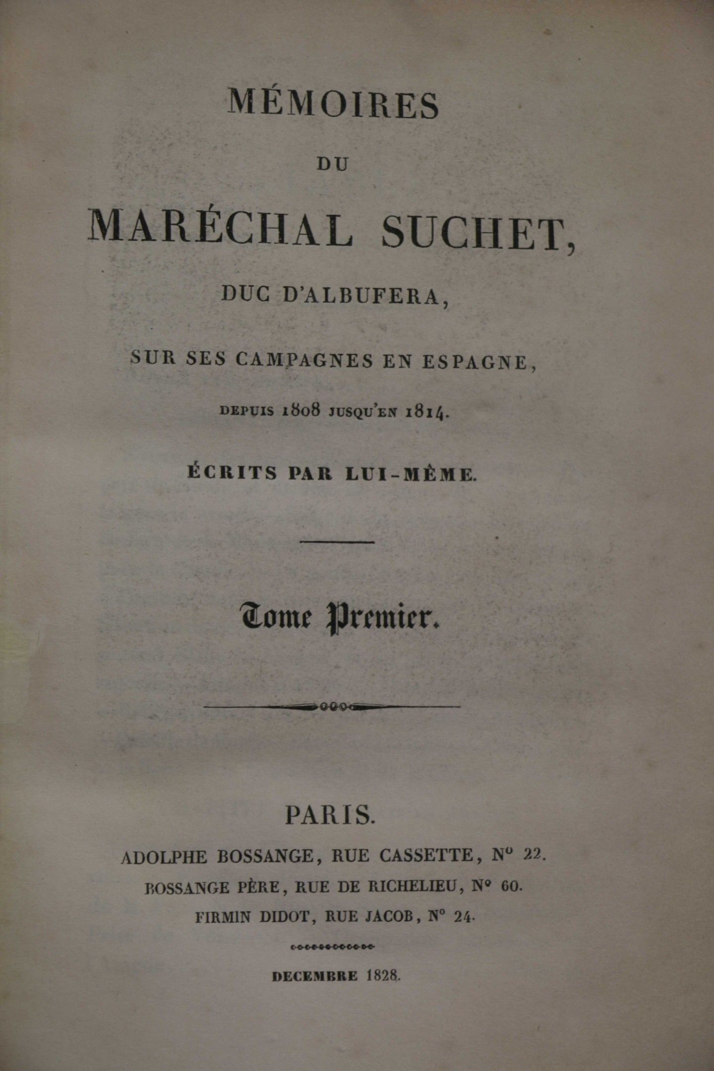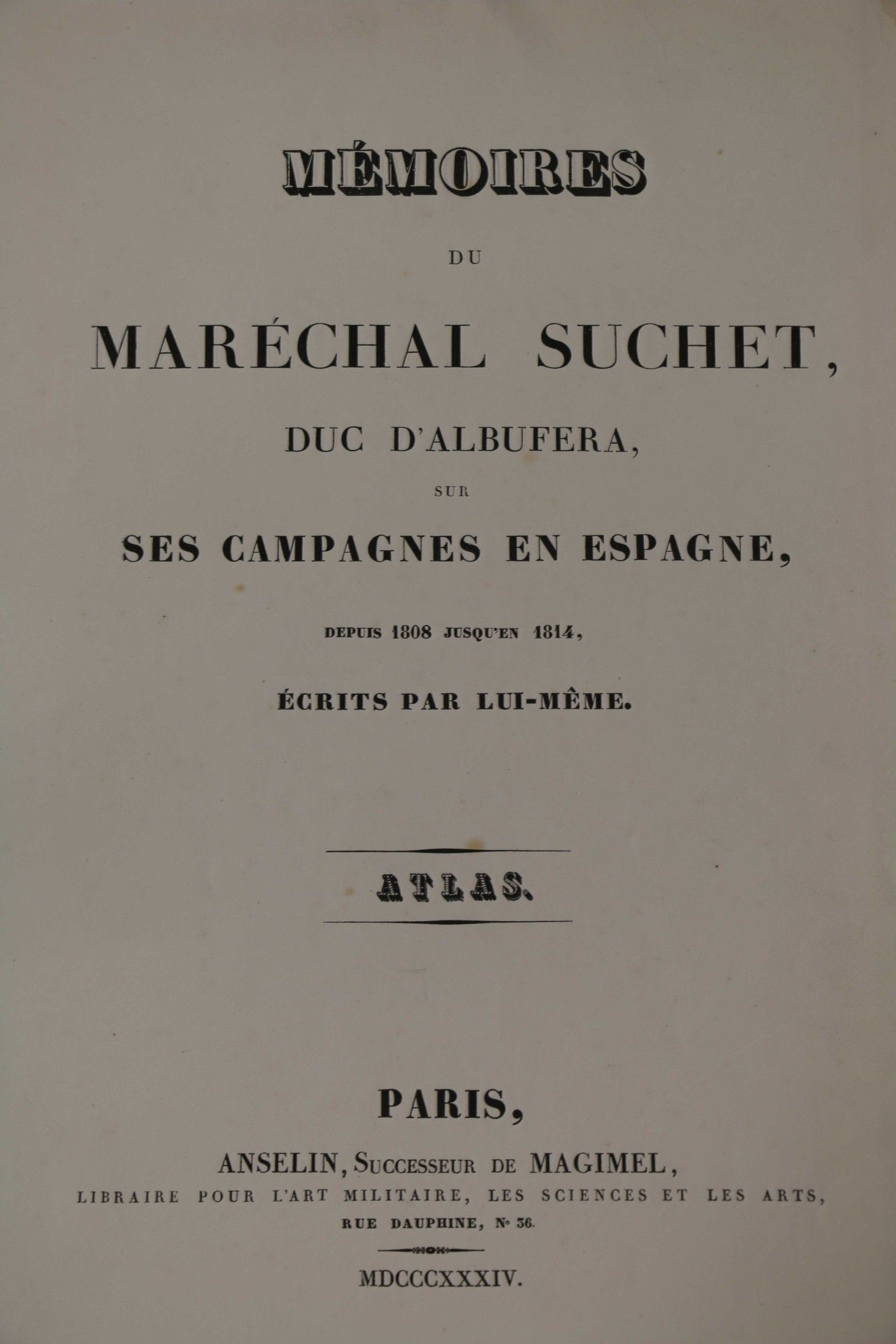 SUCHET (Marshal). Mémoires sur ces campagnes en Espagne depuis 1808 jusqu'en 1814. Paris, Bossange, 1828, 2 vol. in-8, blue half calf, spines ribbed, decorated and sunned, gilt head, covers preserved. FIRST EDITION. With a portrait and 2 tables + an ATLAS : Mémoires du Maréchal Suchet, duc d'Albufera sur ses campagnes en Espagne. Paris, Anselin, 1834, fol. half-rel. brown cloth (worn binding, spine loose). With 16 maps mounted on tabs. Some spotting and foxing.