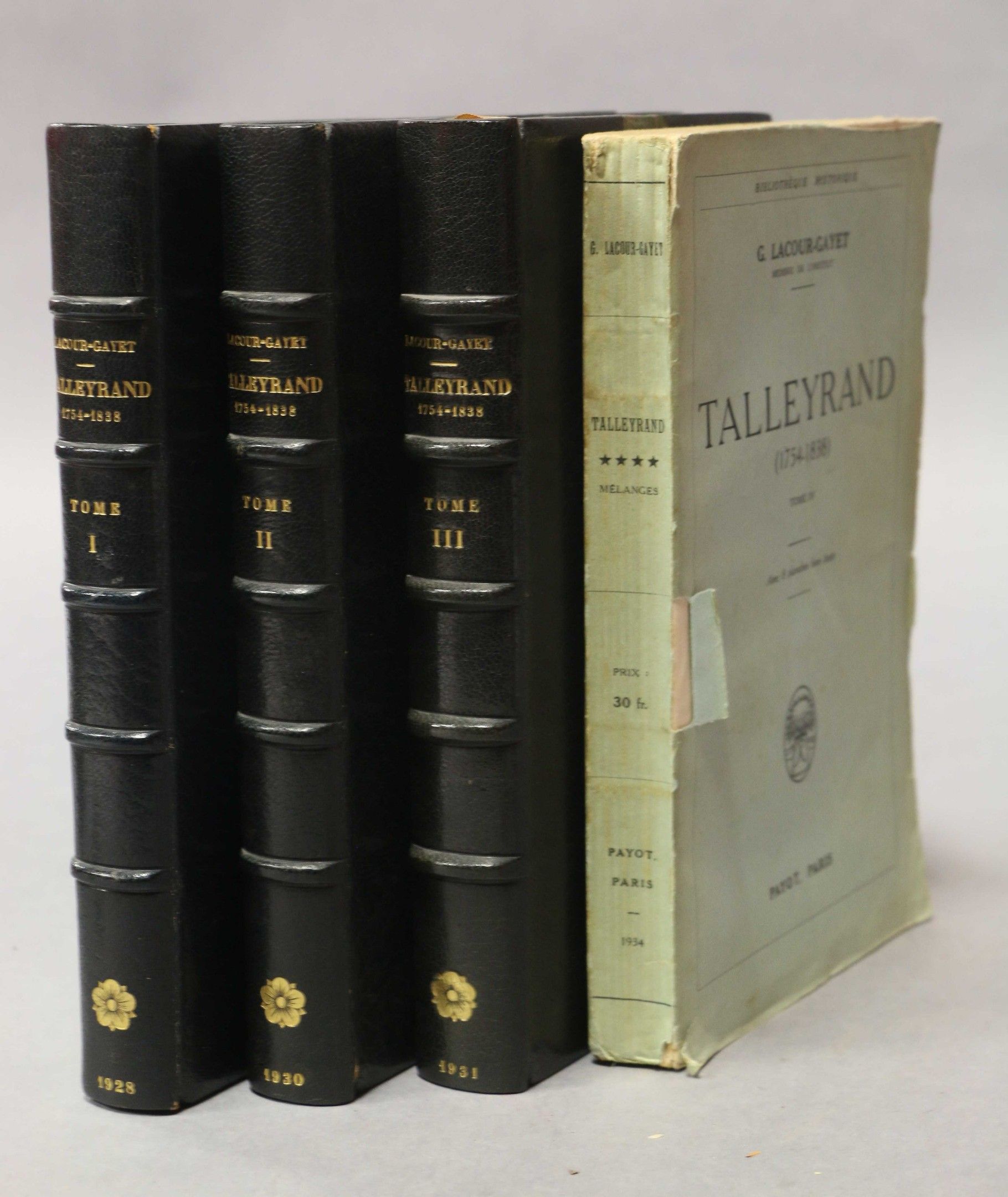 TALLEYRAND - LACOUR-GAYET. 1754-1838. Paris, Payot, 1928-1931, 3 vol. in-8, navy blue half-rel. with corners, ribbed spine, gilt head, covers preserved (Yseux, successor of Thierry-Simier). With 8 hors-texte plates. Also included: LACOUR-GAYET. Talleyrand (1754-1838). Paris, Payot, 1934, in-8, br. cover, a little worn. Set of 4 vol.