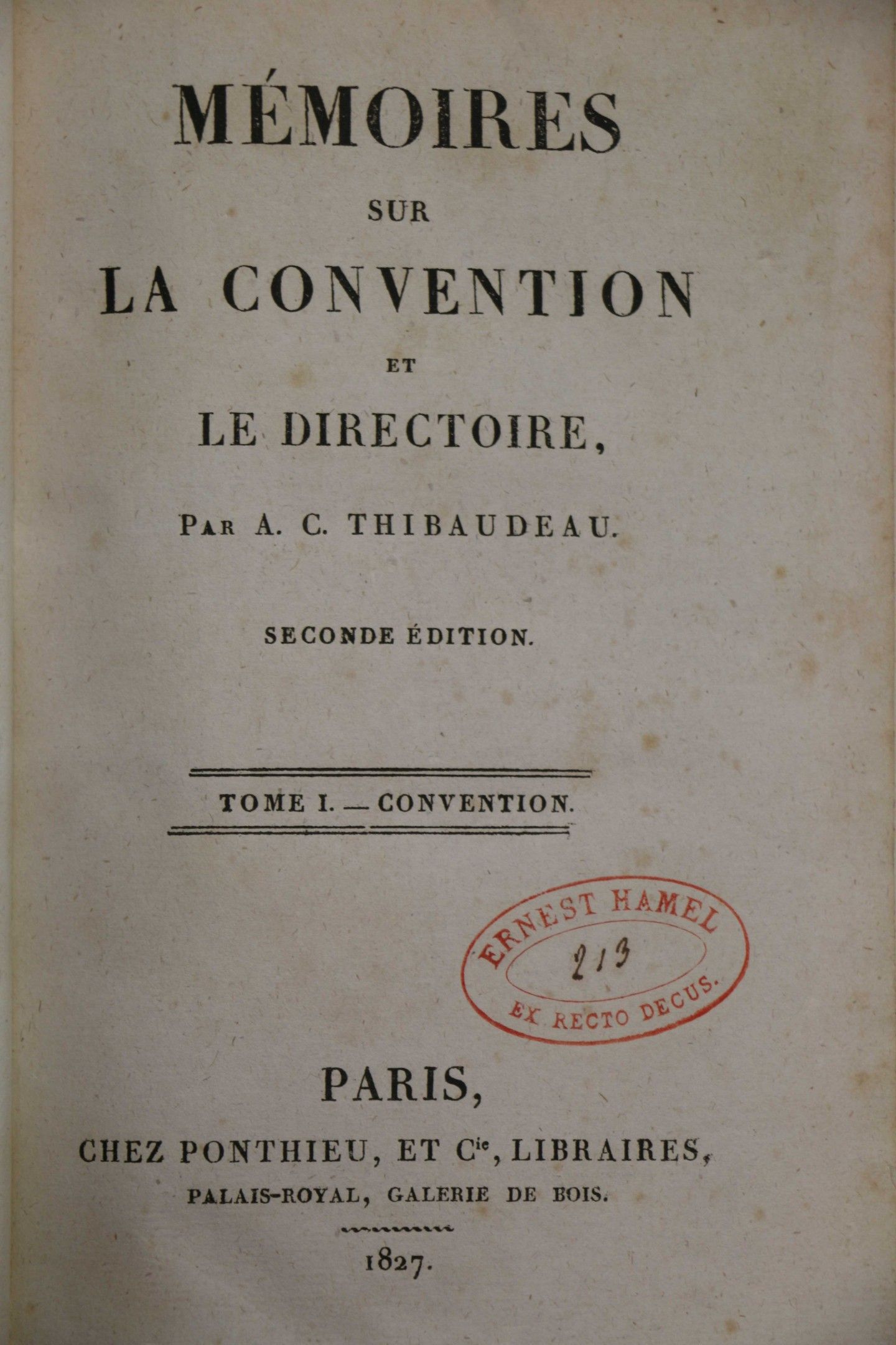 THIBAUDEAU (A.C.). Memoirs on the Convention and the Directoire. Second edition. Paris, Ponthieu, 1827, 2 vol. in-8, red half calf, spine ribbed, stamp.