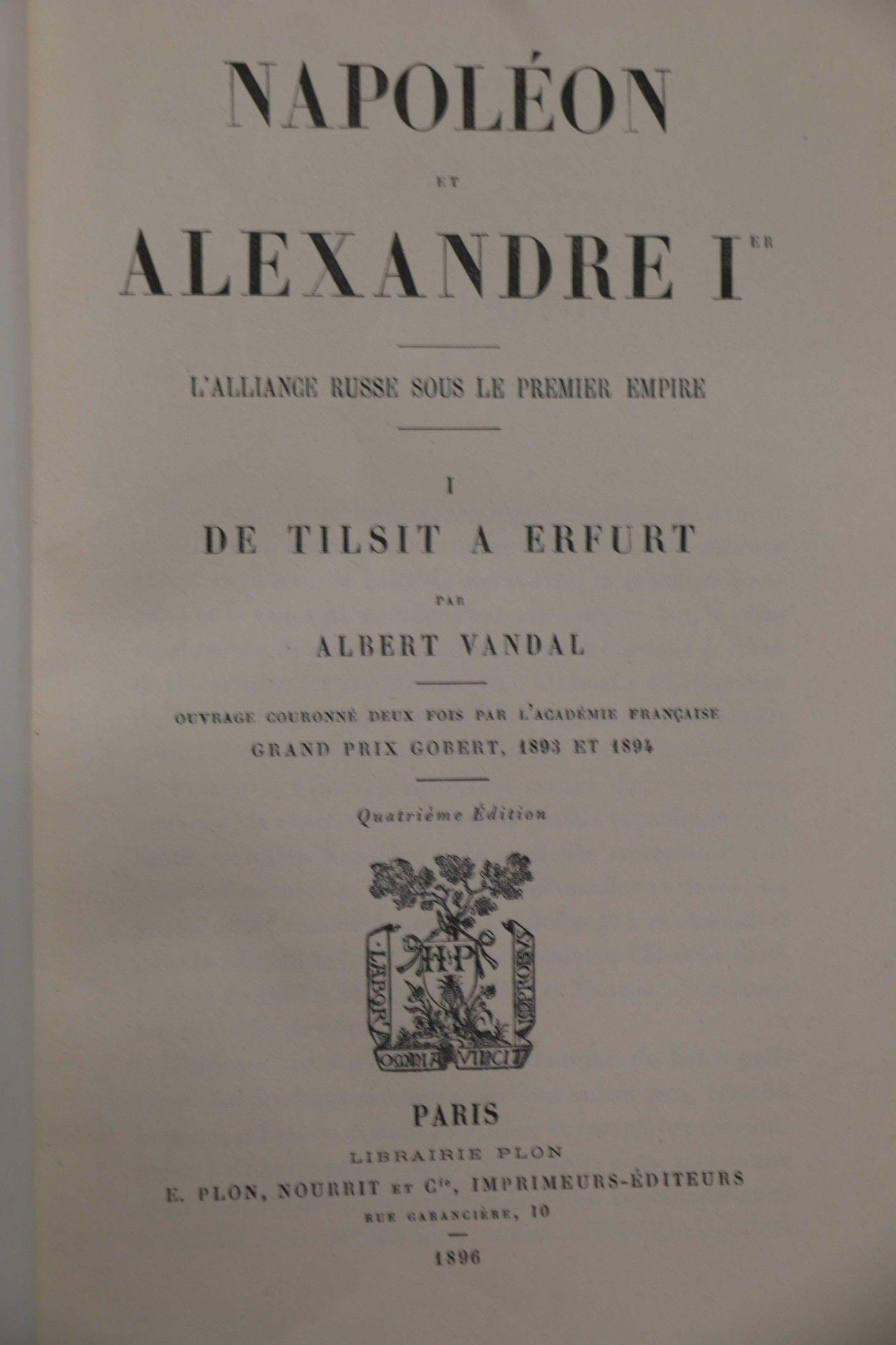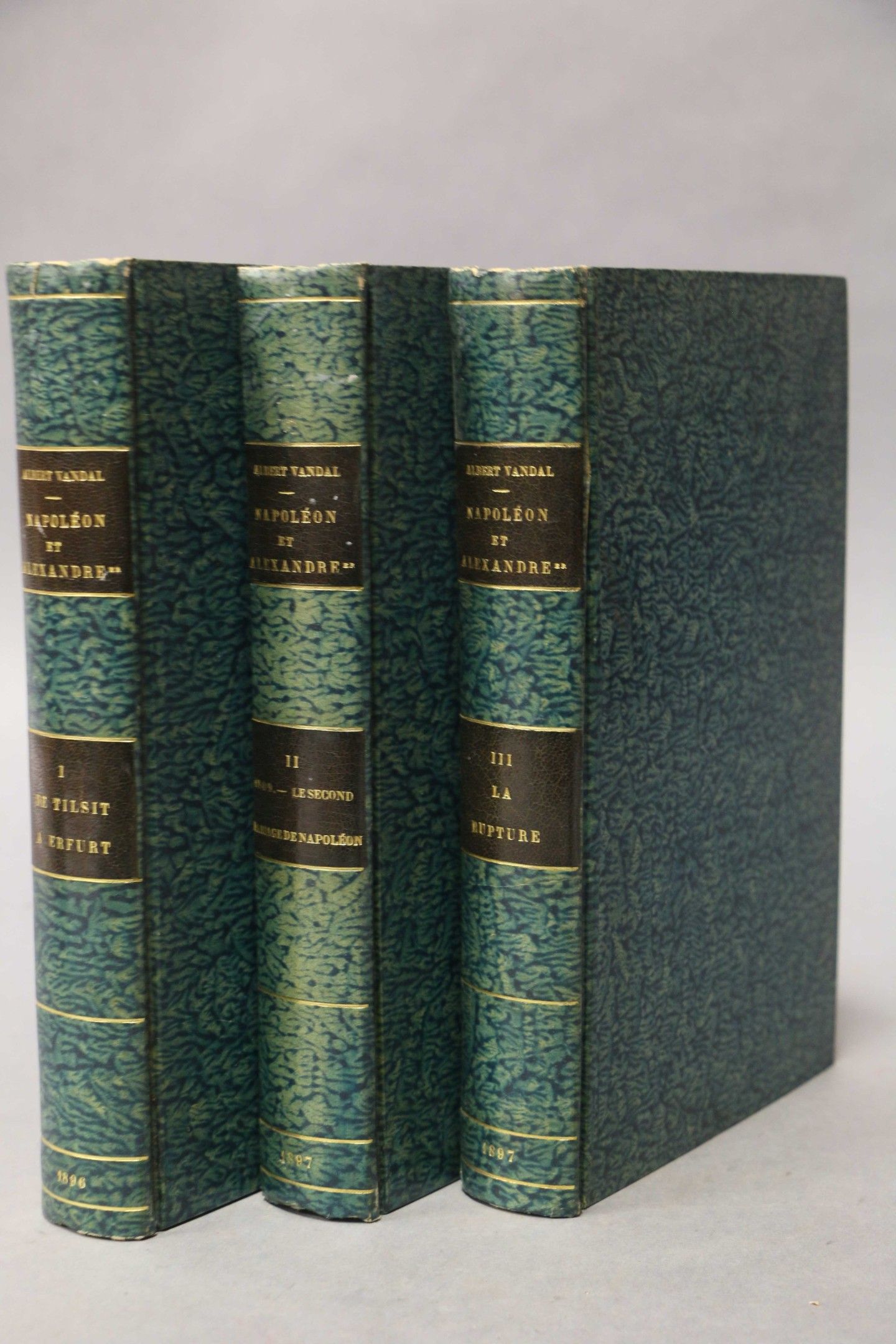 VANDAL (Albert). Napoleon and Alexander I. The Russian alliance under the first empire. Third edition. Paris, Plon, 1897, 3 vol. gd. in-8, bradel, blue marbled paper, smooth spine, decorated, garnet-red title page, covers preserved. With a frontispiece.