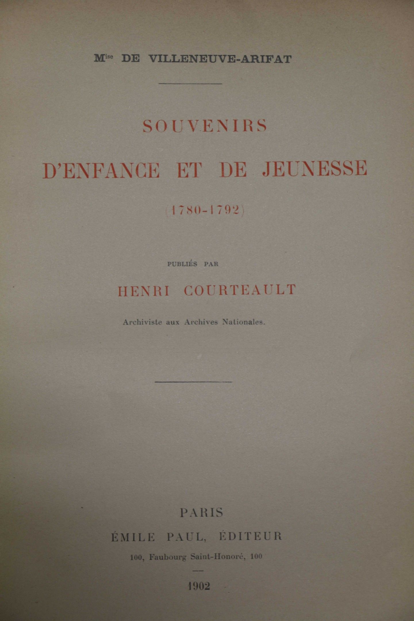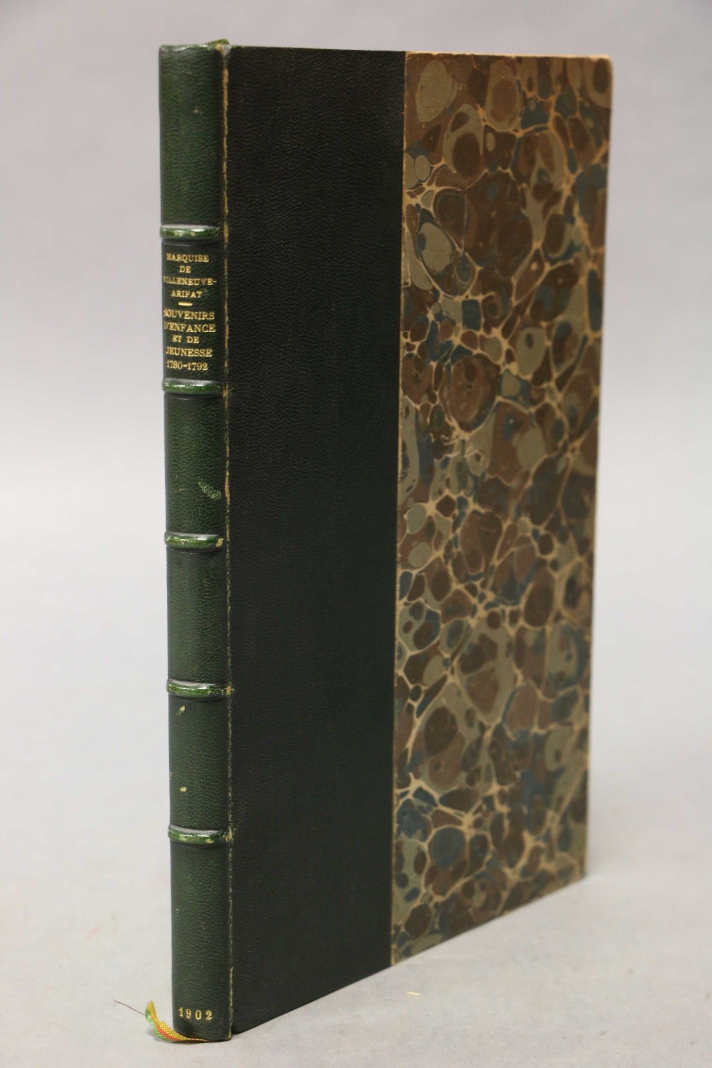 VILLENEUVE-ARIFAT (Mis de). Souvenirs of childhood and youth (1780-1792). Paris, Emile-Paul, 1902, in-4, green half marl, ribbed spine, gilt head, cover preserved (Lemardeley). FIRST EDITION.
