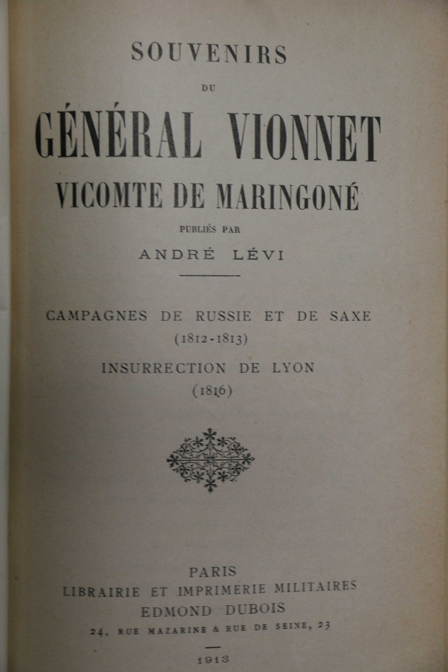 VIONNET (General). Memoirs of General Vionnet, viscount of Maringoné. Published by André Lévi. Paris, Dubois, 1913, in-8, green cloth boards. With a frontispiece portrait.