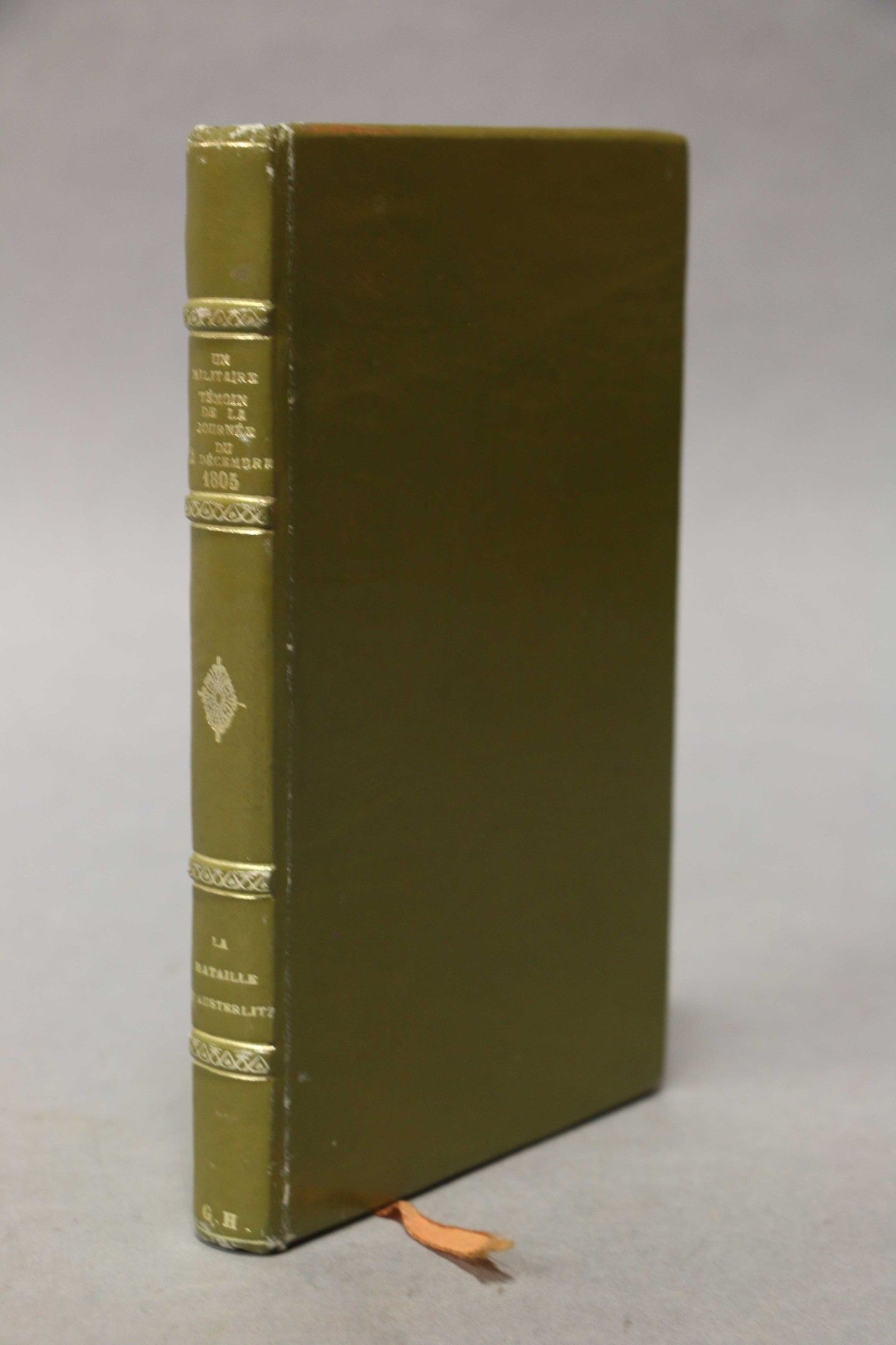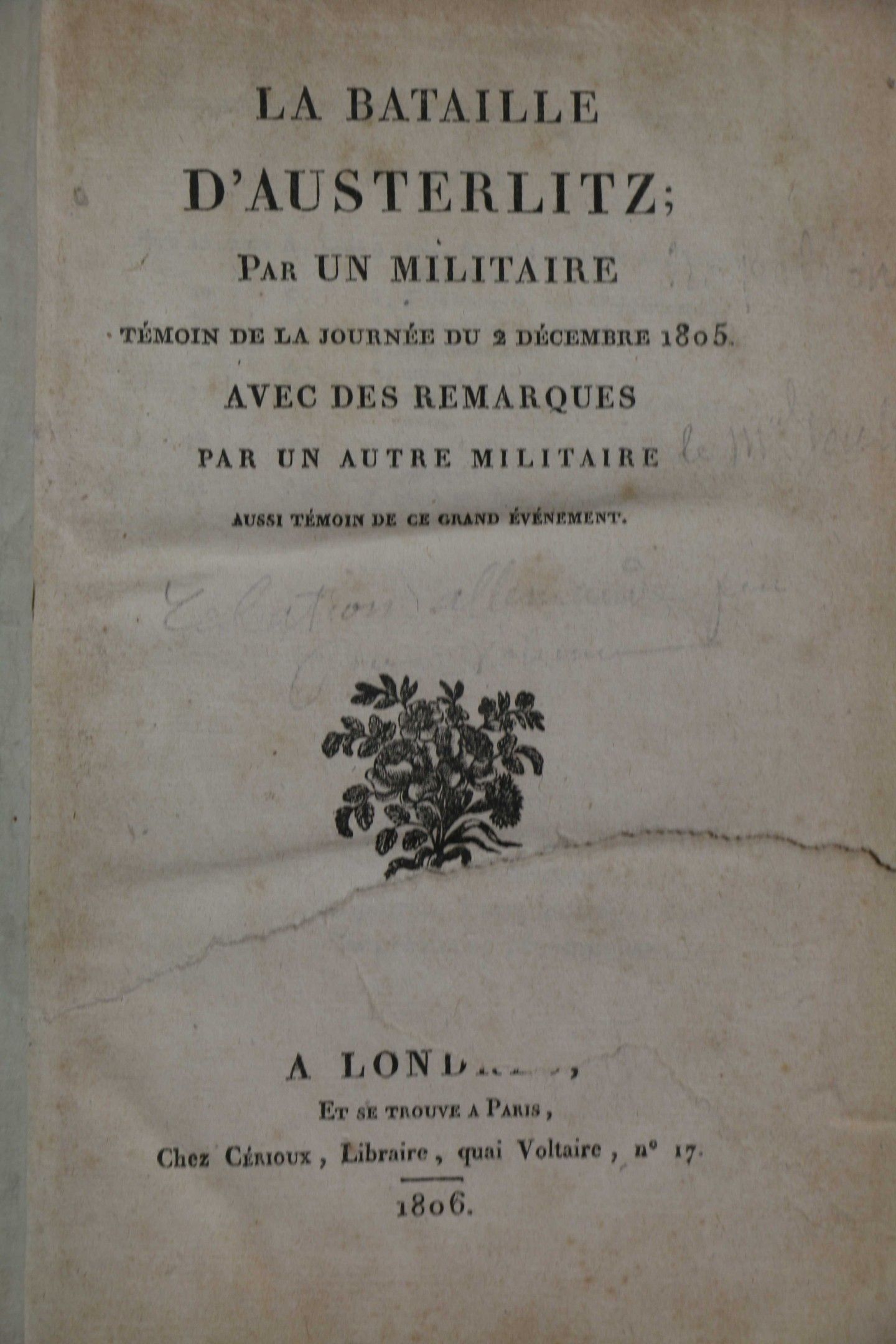 AUSTERLITZ STUTTERHEIM. The battle of Austerlitz by a soldier who witnessed the day of 2 December 1805. With remarks by another soldier, also a witness to this great event. London, Cérioux, 1896, in-8, 123 pp. bound with: Die Schlacht bei Austerlitz. S.l., 1806. With a full bas. mustard map, spine ribbed (mod.rel.). Title torn with mq.