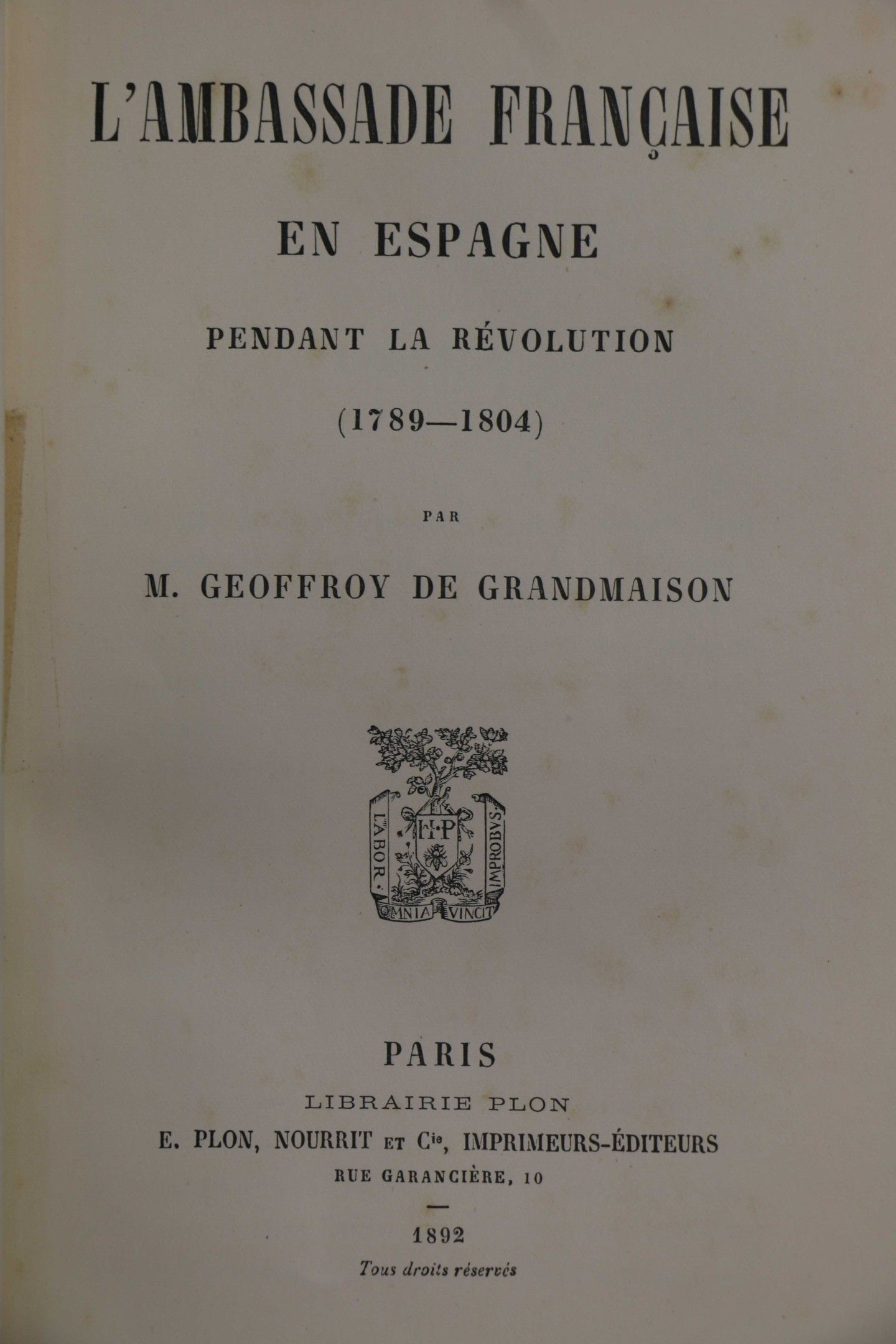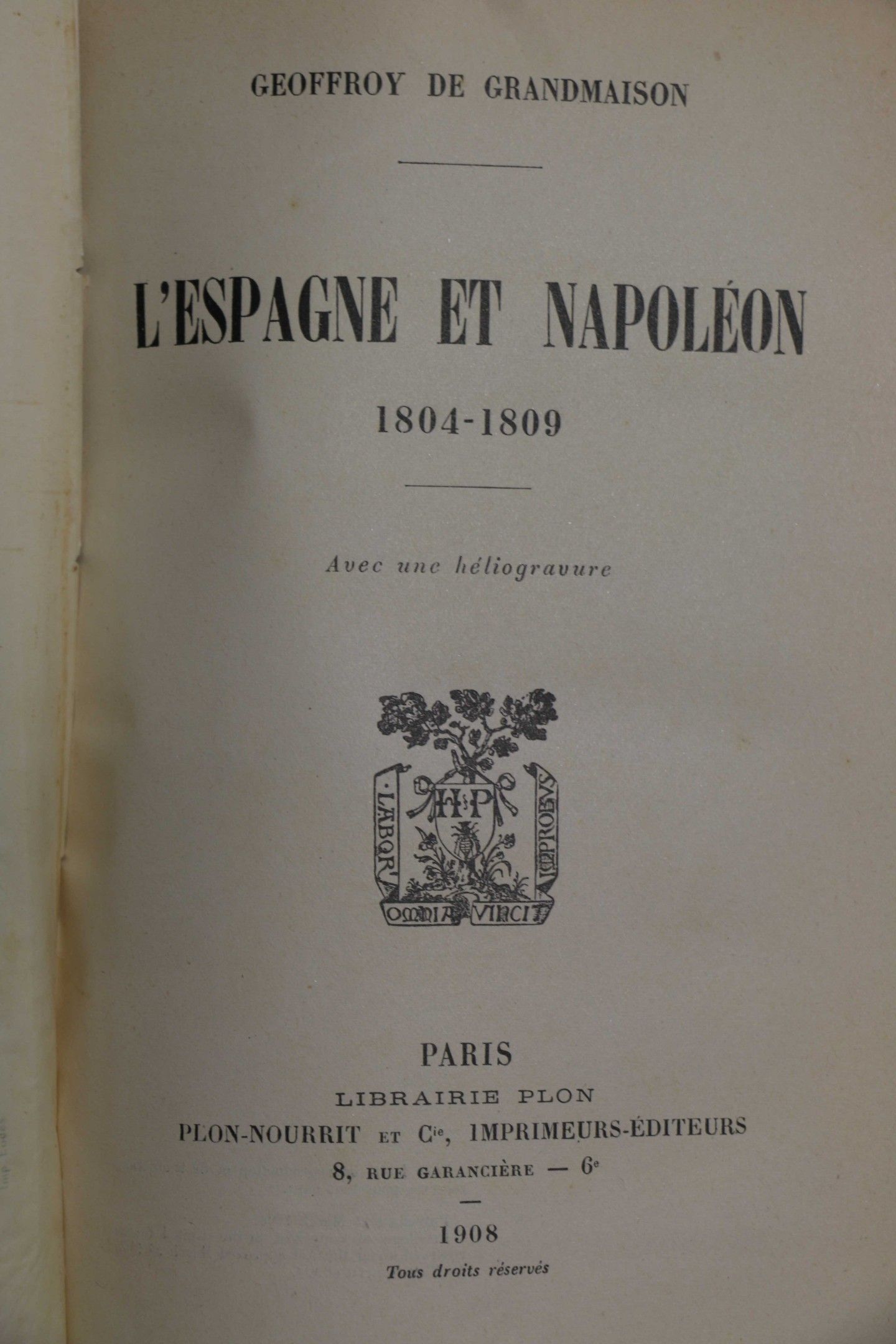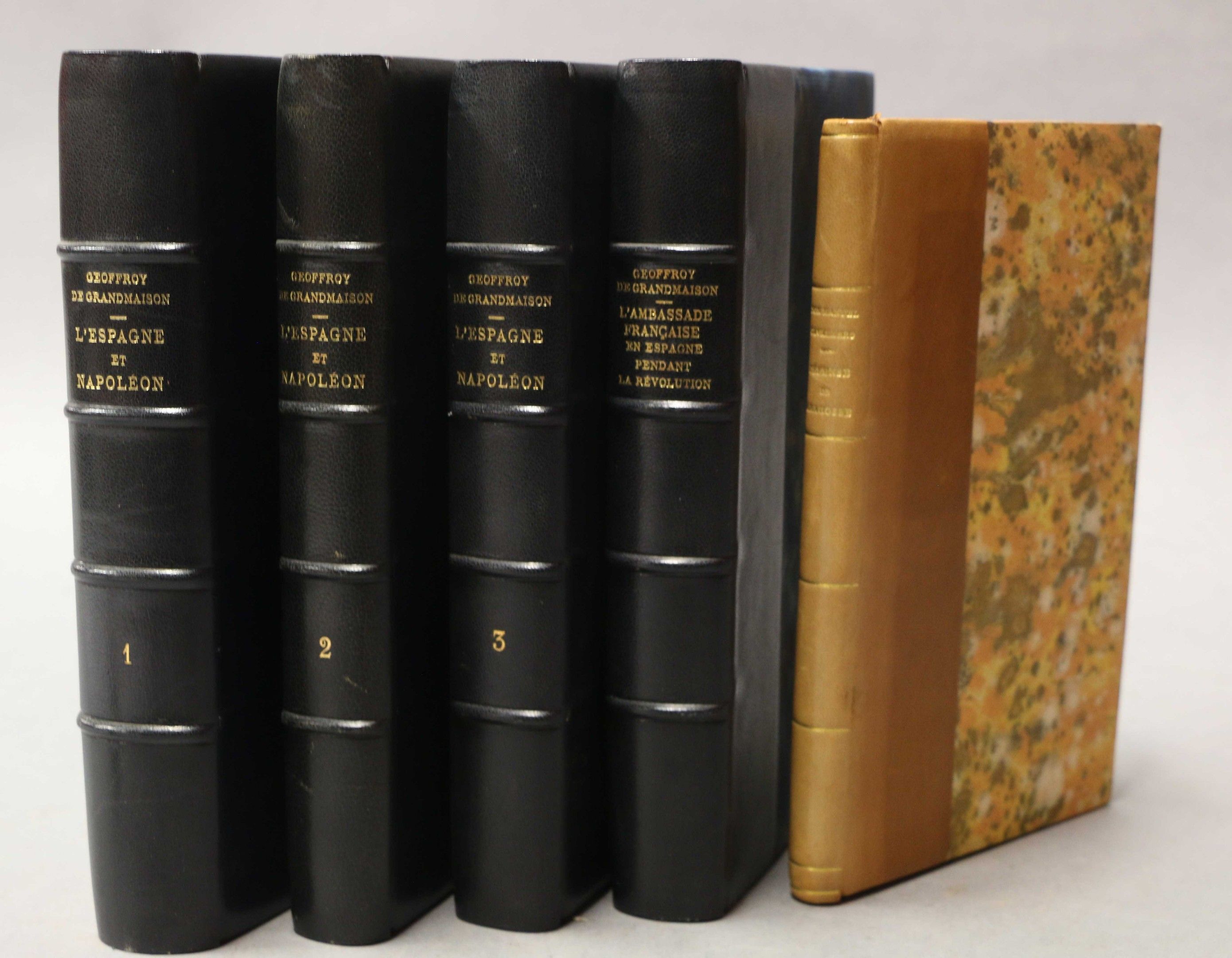 CAVALLERO (Don Manuel). Défense de Saragosse ou relation des deux sièges soutenus par cette ville en 1808 et 1809. Paris, Magimel, 1815, in-8, half bas. bas. fawn, smooth spine, ornamented and unsealed (mod. rel.). GEOFFROY DE GRANDMAISON. Spain and Napoleon. 1804-1809-1811-1814. Paris, Plon, 1908-1931, 3 vol. in-8, navy blue half calf chag. spine, covers preserved (modern binding). With 2 frontispieces. GEOFFROY DE GRANDMAISON. L'ambassade française en Espagne pendant la Révolution (1789-1804). Paris, Plon, 1892, in-8, navy blue half calf chag. spine, covers preserved (modern binding). Set of 5 vol.