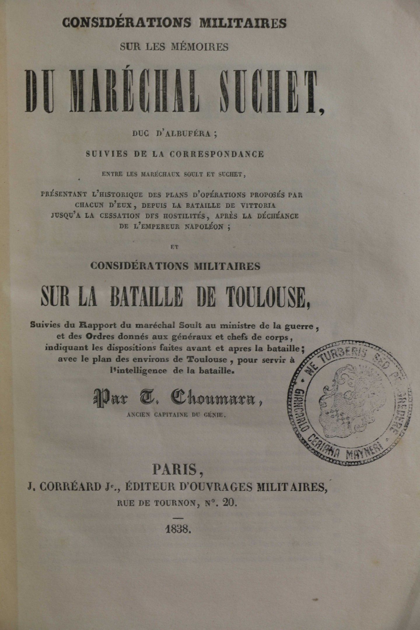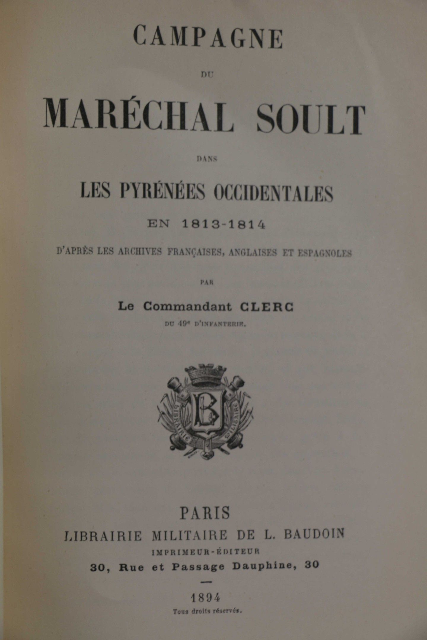 CHOUMARA. Considérations militaires sur les mémoires du maréchal Soult et considérations militaires sur la bataille de Toulouse. Paris, Corréard, 1838, in-8, 278 pp, navy blue half calf, ribbed spine, stamp bibliotheca della Marmora (modern binding). With a large hors-texte map. CLERC. Campagne du maréchal Soult dans les Pyrénées occidentales en 1813 et 1814. Paris, Baudoin, 1894, in-8, full green cloth (modern binding). With 2 maps. Set of 2 vols.