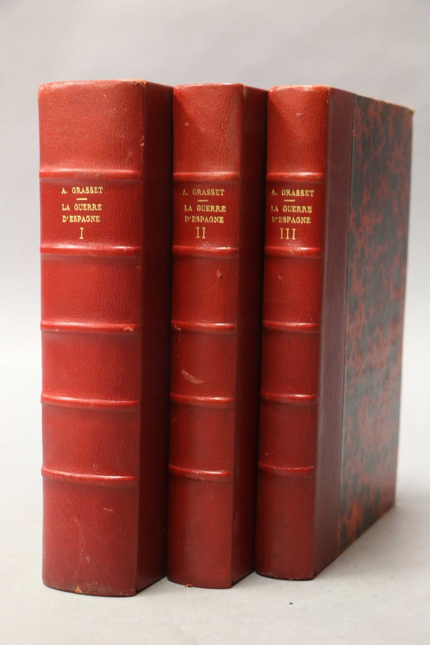 GRASSET (Capt. A.). La guerre d'Espagne (1807-1813). Paris, Berger-Levrault, 1914-1932, 3 vol. in-8, half-rel. red chag. spine, covers preserved (modern binding). FIRST EDITION. Volume 1 : With a map, a frontispiece, 7 tables, 3 sketches. Volume 2: With 4 sketches and a map. Volume 3: With 18 sketches in and out of the text, 4 portraits, 1 plan and a map.