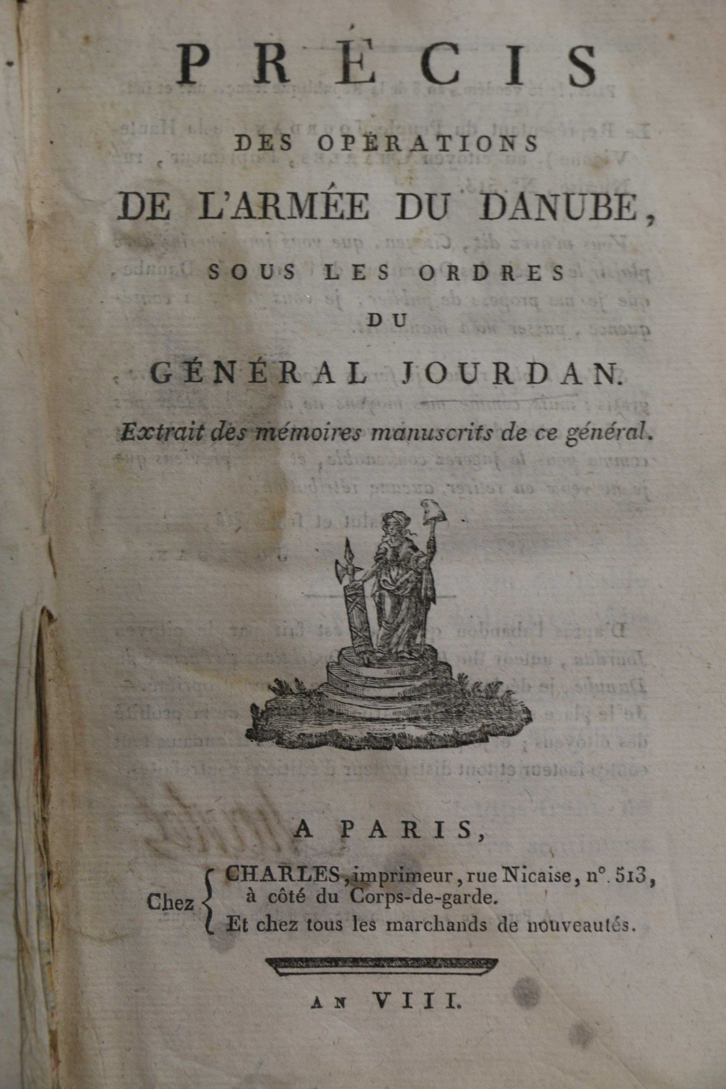 JOURDAN. Précis des opérations de l'armée du Danube sous les ordres du Général Jourdan. Paris, Charles, an VIII, in-8, bas. fawn (very worn binding, epidermures on the boards). It is bound in the suite DUMAS. Campagnes du comte Suwarow-Rymnisky et du prince Charles, Archiduc d'Espagne pendant l'année 1799. Hamburg, n.d.