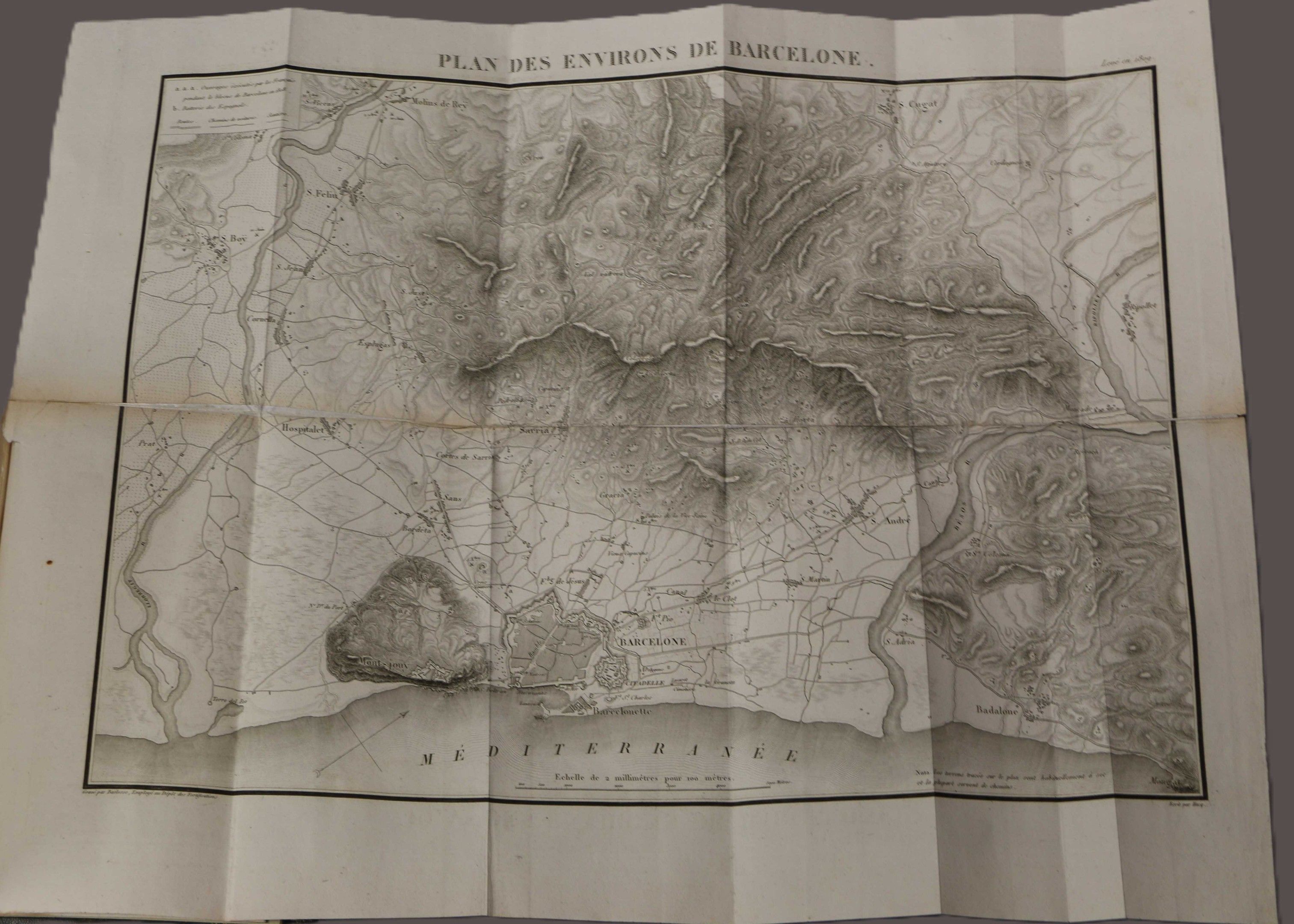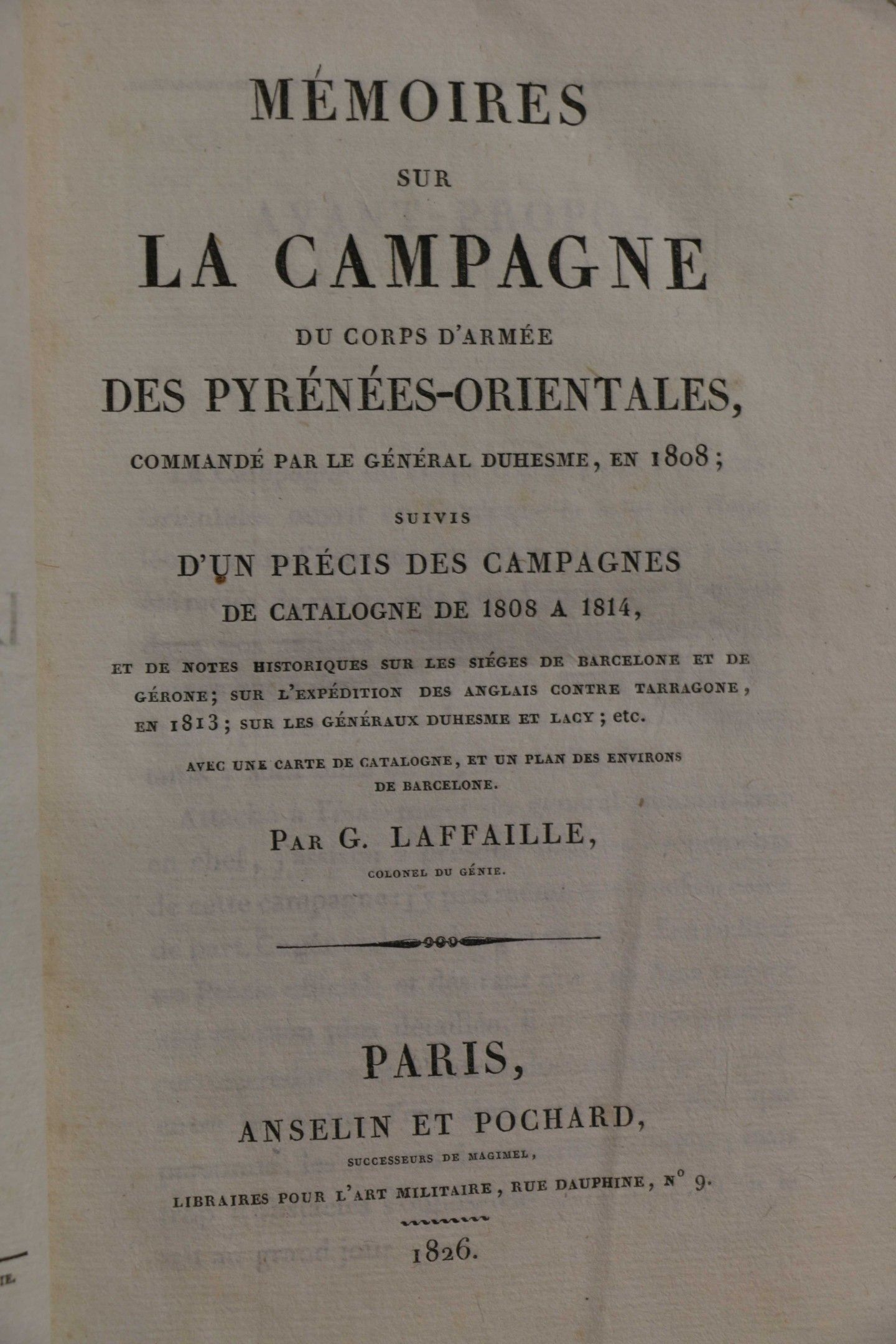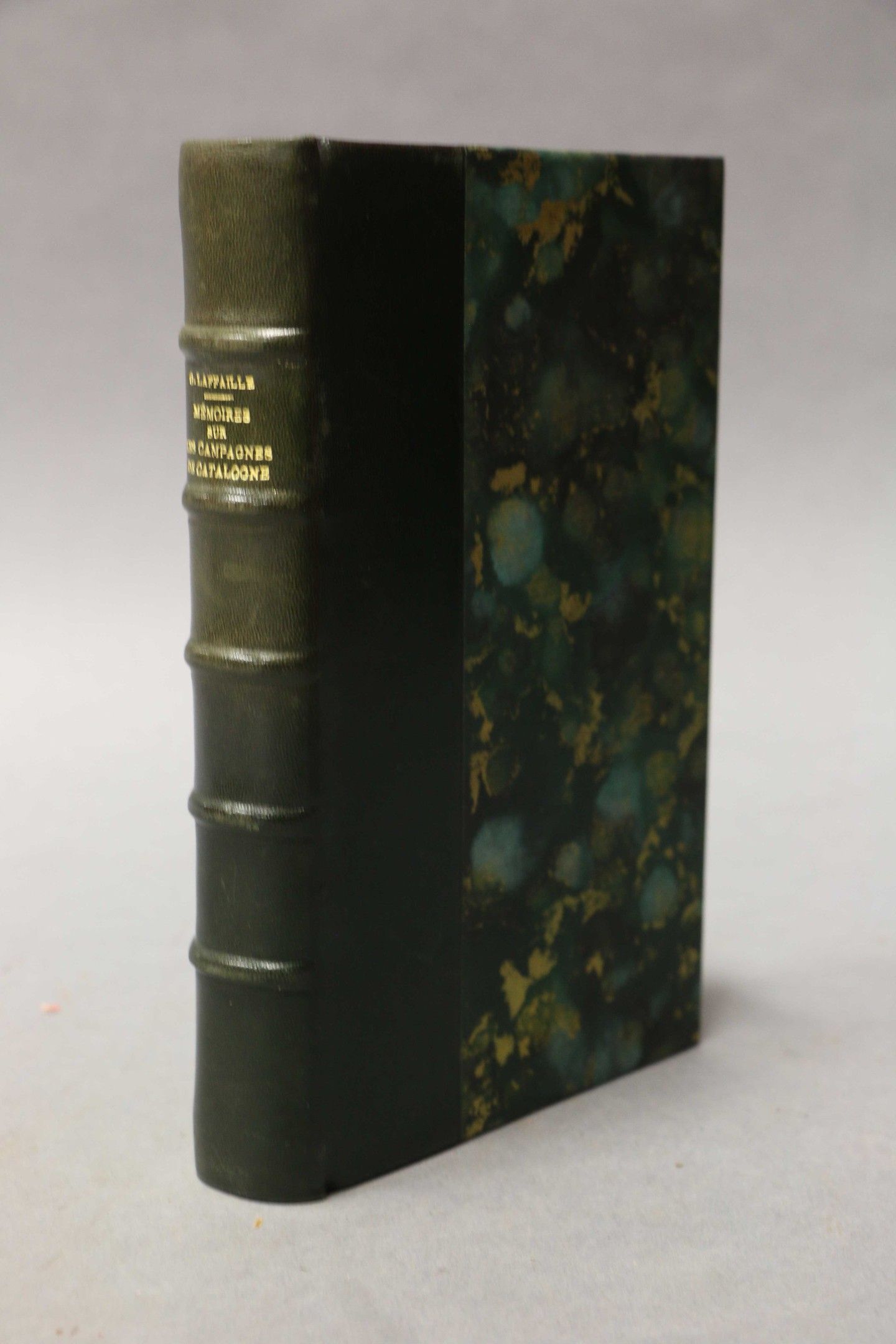 LAFFAILLE (G.). Mémoires sur la campagne du corps d'armée des Pyrénées orientales commanded by General Duhesme in 1808. Followed by a précis of the campaigns in Catalonia from 1808 to 1814. Paris, Anselin & Pochard, 1826, in-8, navy blue half calf, ribbed spine, covers preserved (mod. binding) with 2 folded hors-texte maps.