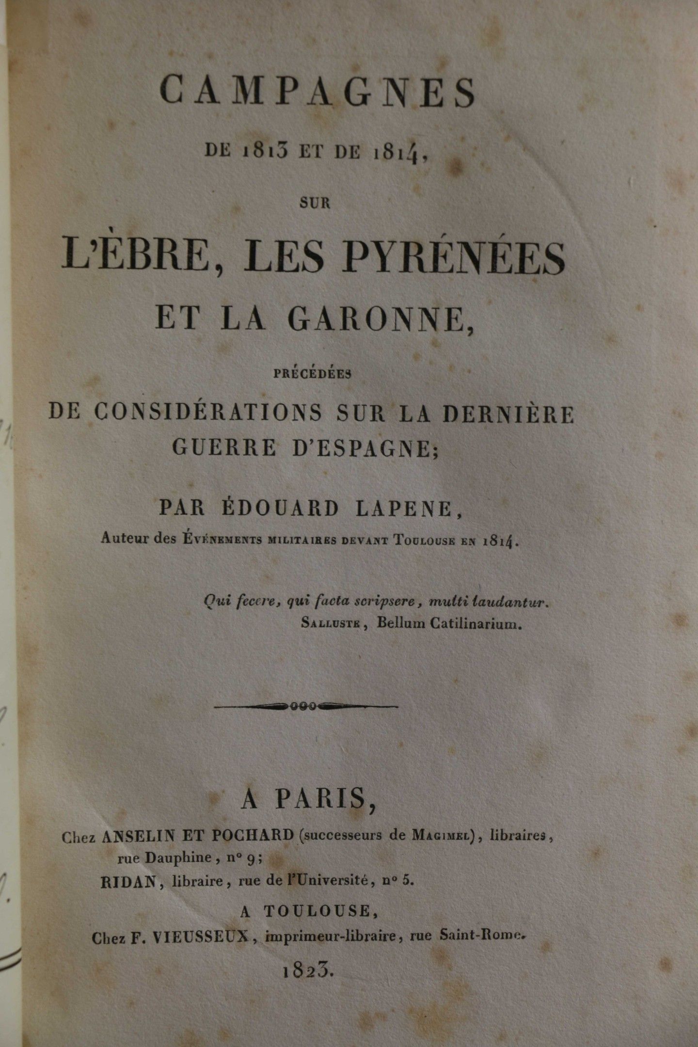 LAPENE (Edouard). Campagnes de 1813 et de 1814 sur l'Ebre, les Pyrénées et la Garonne précédées de considération sur la dernière guerre d'Espagne. Paris, Anselin & Pochard, 1823, in-8, in-8, 442 pp. half calf, red chag. spine (mod. rel.). FIRST EDITION. Heavy spotting. Without the 2 maps.