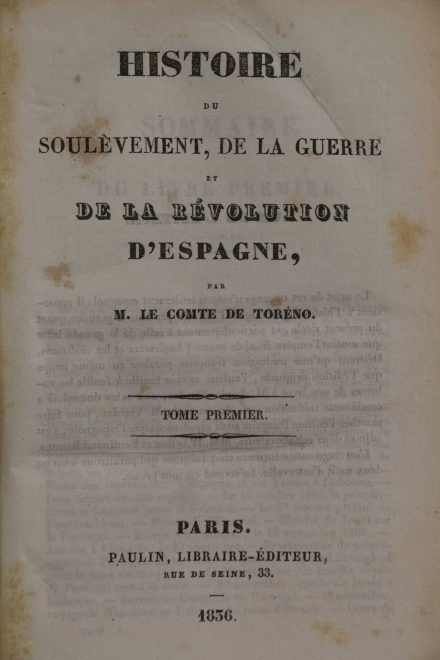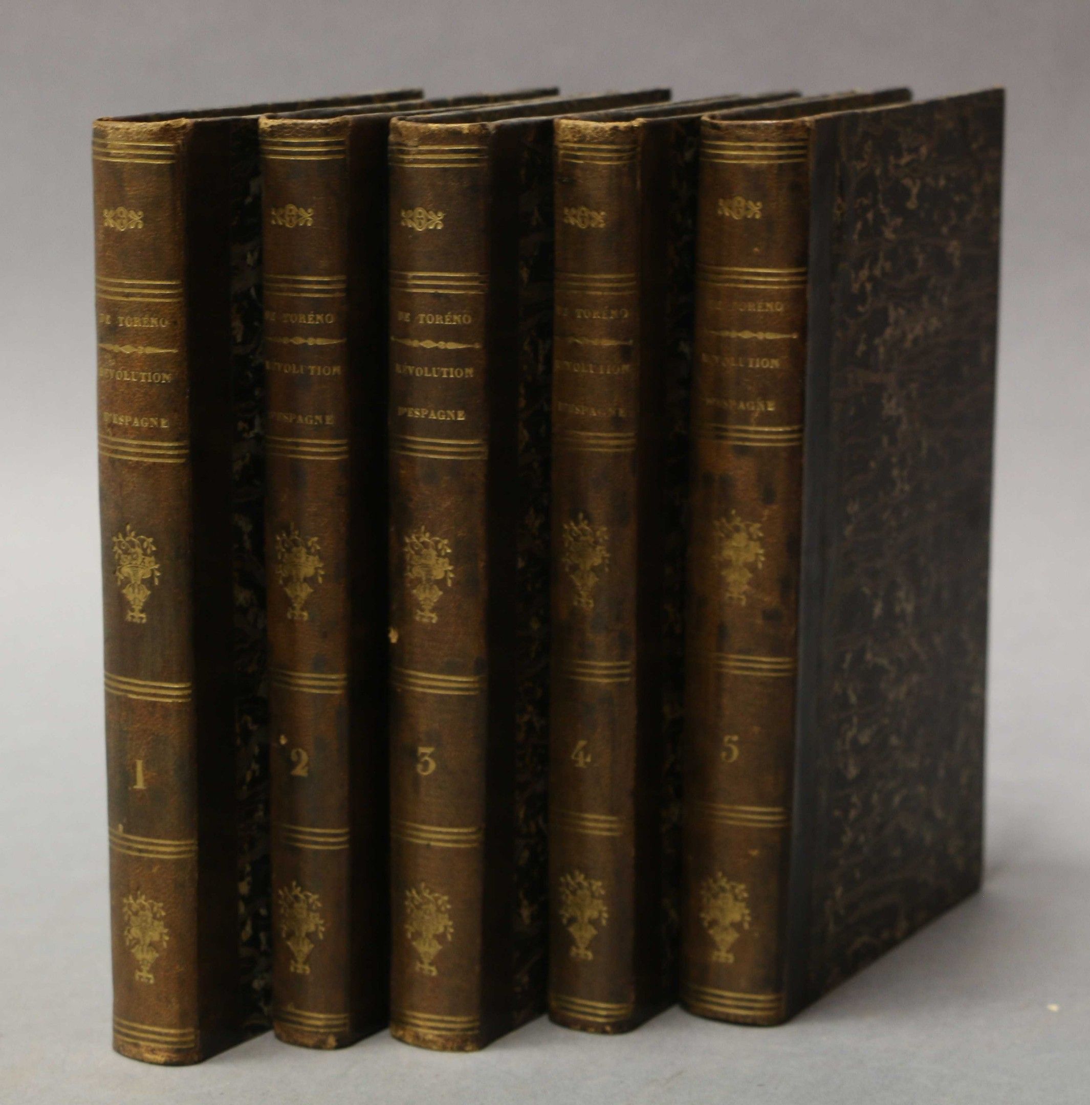 TORENO (Cte de). Histoire du soulèvement, de la guerre et de la révolution d'Espagne. Paris, Paulin, 1836-1838, 5 vol. in-8, half calf plum, smooth spine, decorated (contemporary binding). With a hors-texte map. Heavy brown spotting.