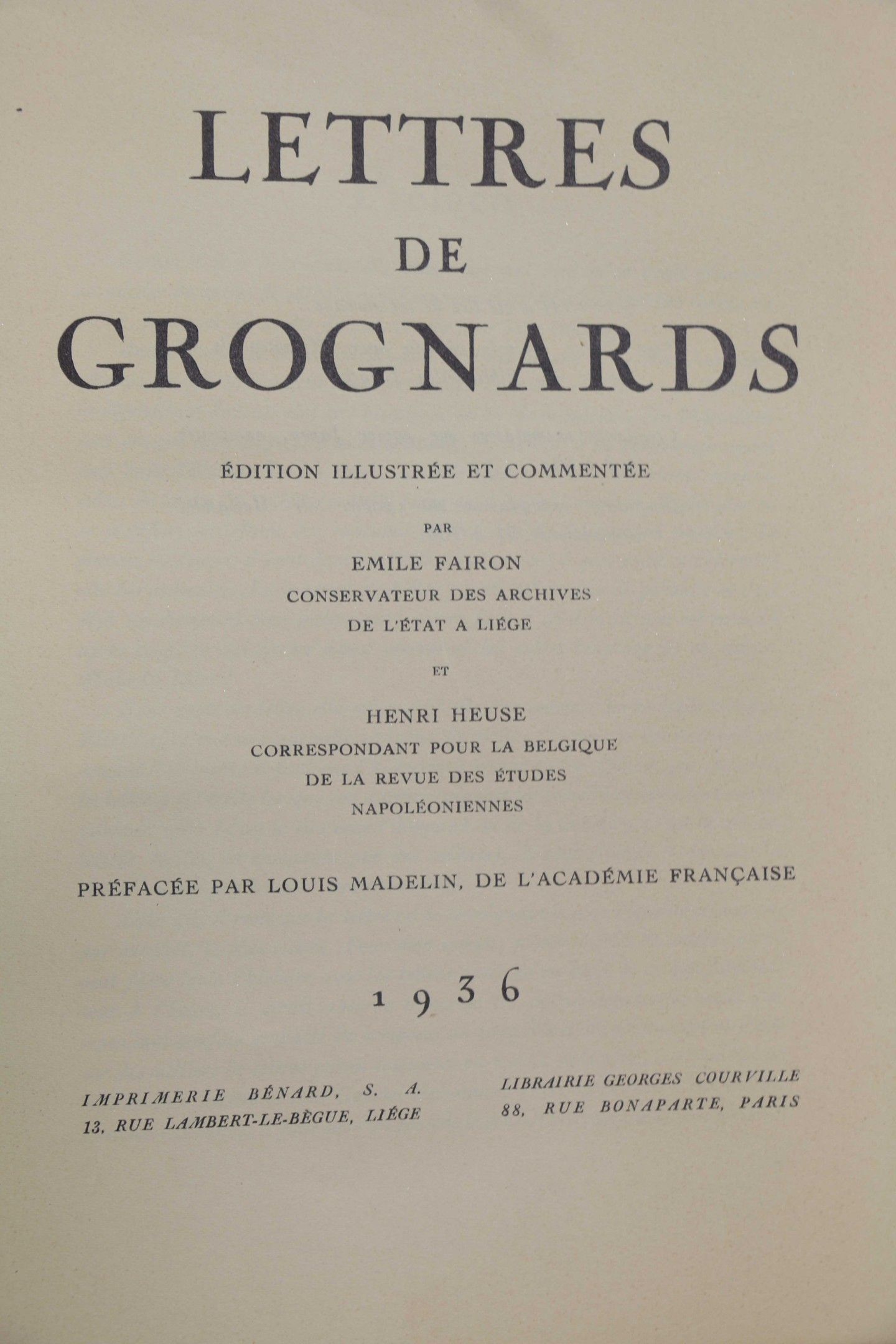 FAIRON & HEUSE. Lettres de grognards. Liège, Bénard, 1936, in-4, red half calf, ribbed spine, cover preserved (modern binding). With 15 off-text colour illustrations.