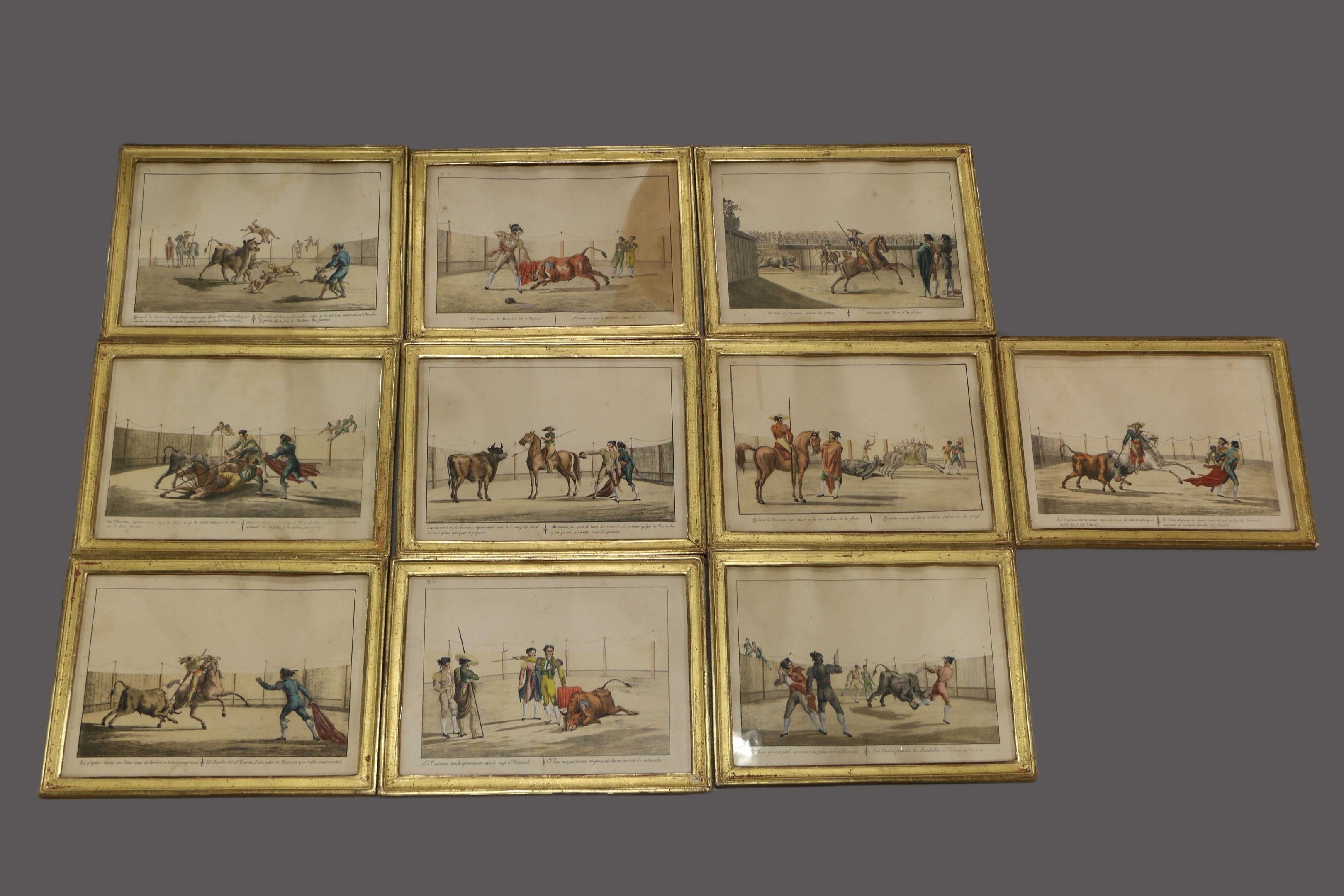 TAUROMACHY. Bullfighting scenes showing the different phases of the bullfight. Set of 10 lithographed and coloured engravings, signed (signature illegible). Legends in French and Spanish.