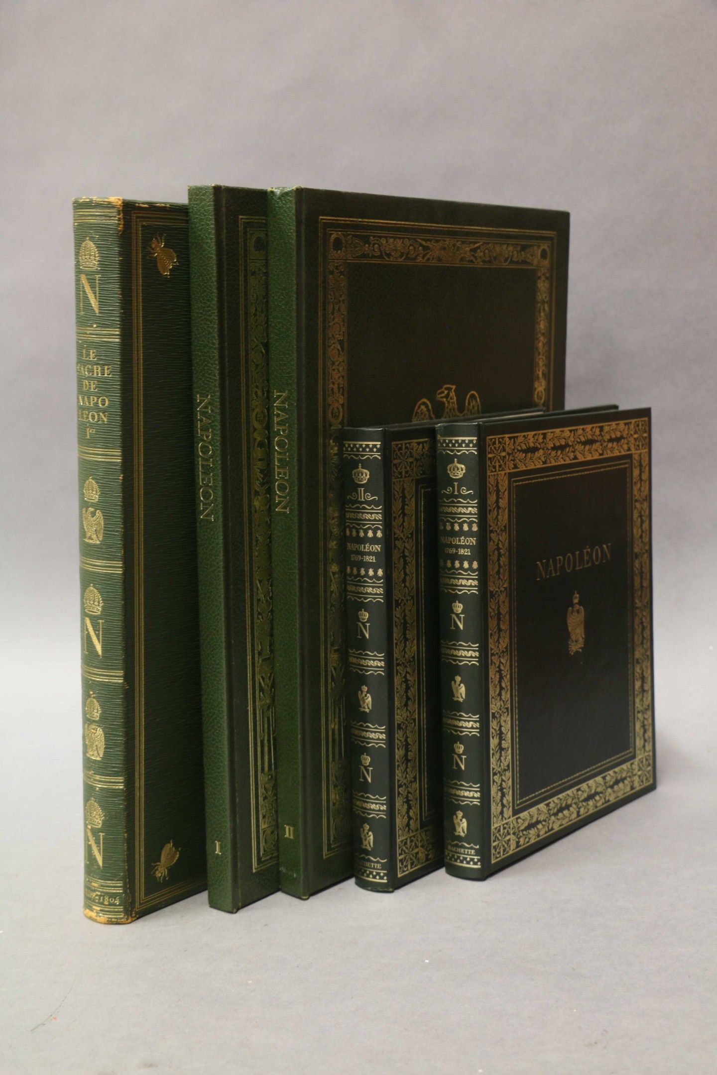 LE SACRE DE S.M. L'EMPEREUR NAPOLEON. Paris, Edition du Palais royal,1969, in-4, publisher's paperback rubbed, corners worn. One of 1500 copies on vellum pur chiffon of the papeteries d'Arches (n°224). - VERNET. Campagnes des français sous le Consulat et l'Empire. Paris, Editions du bicentenaire, 1969, 2 vol. in-4, hardback ed. One of 5000 numbered copies. - MISTLER. Napoléon. Paris, Hachette, 1968, 2 vol. in-4 hardback ed. Ens.5 vol.