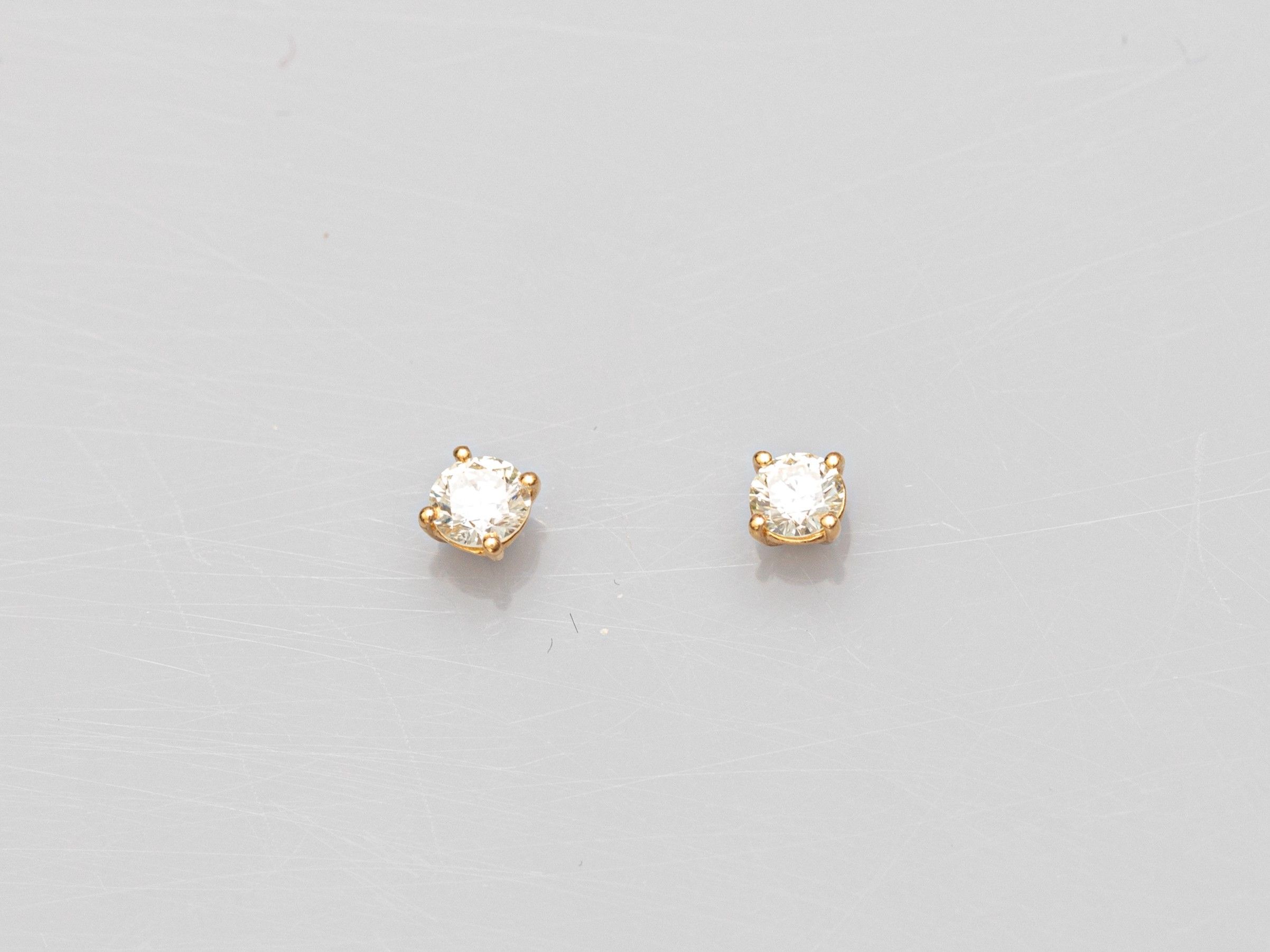 Pair of stud earrings in 18K yellow gold, each set with a brilliant-cut diamond. Silicone-coated gold push-pull clasps. 0.4 g. Diameter 3 mm. Eagle head hallmark.