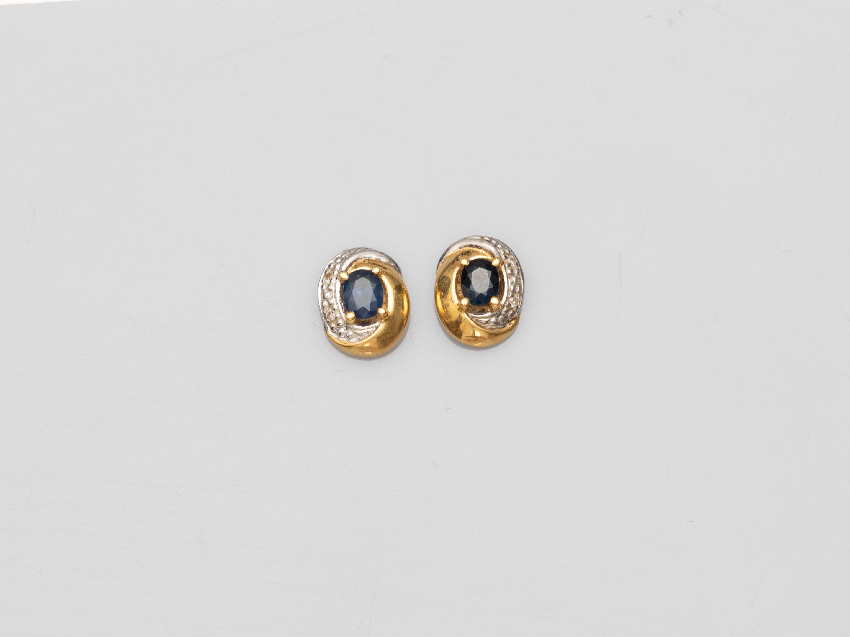 Pair of vintage earrings in two-tone 750°/°° (18K) gold, each set with an oval-cut sapphire and two tiny brilliant-cut diamonds. Alpa clasps. 2.1 g. Length: 10 mm.