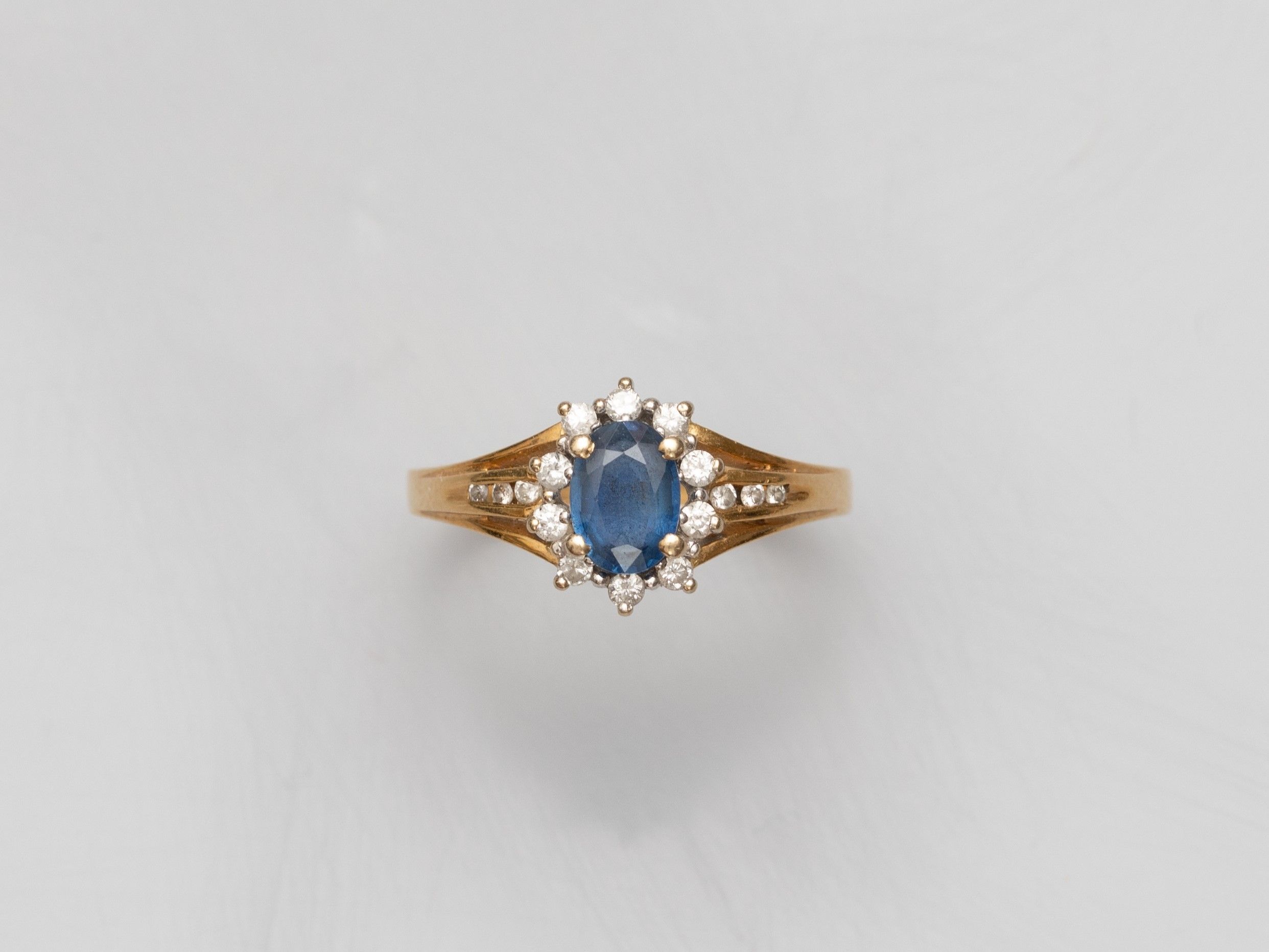 Vintage ring in two-tone 750°/°° (18K) gold, set with an oval-cut sapphire weighing approximately 0.50 ct and small brilliant-cut diamonds. 3.6 g. TDD 58. Length: . Eagle head hallmark.