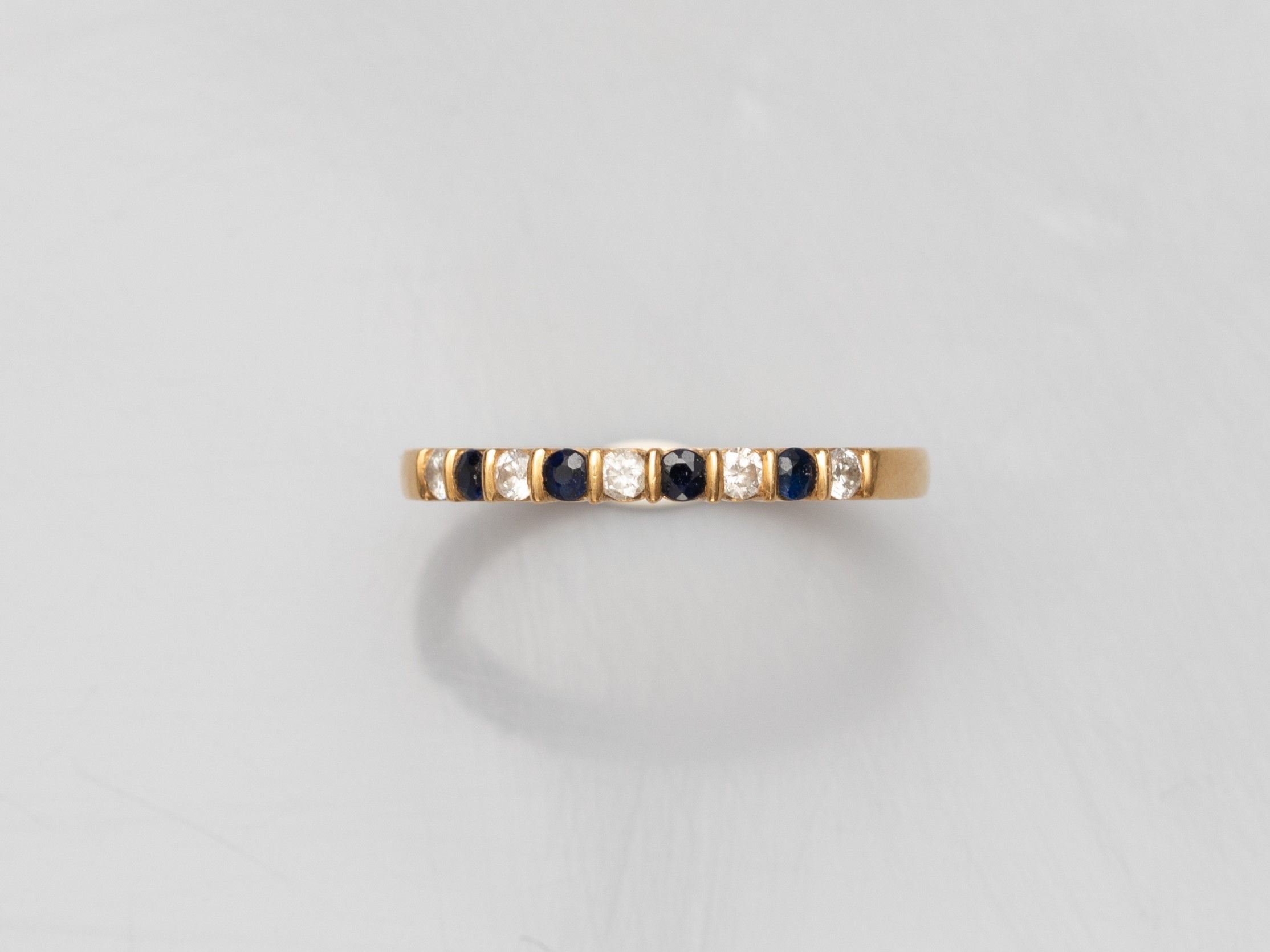 Wedding band in 750°/°° (18K) yellow gold, set with four round facetted sapphires alternating with brilliant-cut diamonds. 2.8 g. TDD 58. Width: 2.3 mm. Marked with an eagle's head.