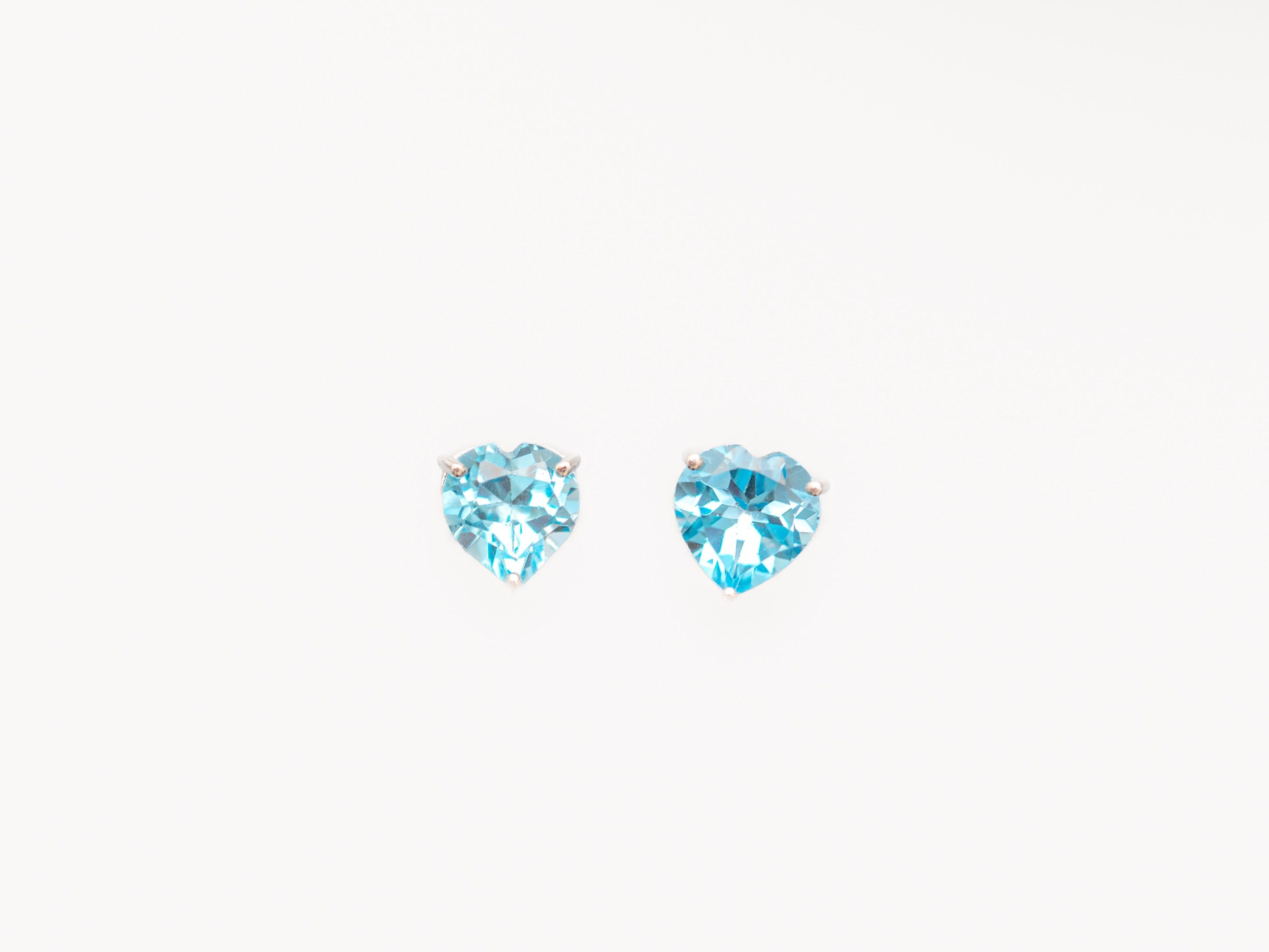 Pair of earrings in 750°/°° (18K) white gold, each set with a heart-cut blue topaz (approx. 1 ct). Silicone-coated gold push-pull clasps. 0.9 g. Length: 6.4 mm. Marked with an eagle's head.