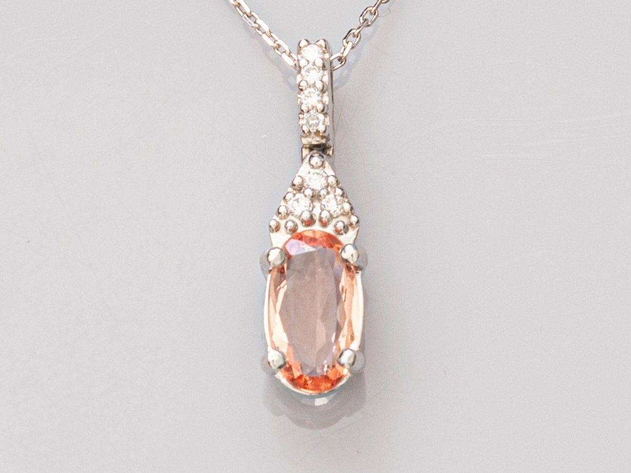 Pendant in 750°/°°(18K) white gold, set with an oval facetted orange pink topaz weighing approximately 1 ct, set off with brilliant-cut diamonds, accompanied by its 750°/°°(18K) white gold chain with fine forçat link. 2.3 g. Length: 45 cm. Pendant height: 2 cm. Eagle head hallmark