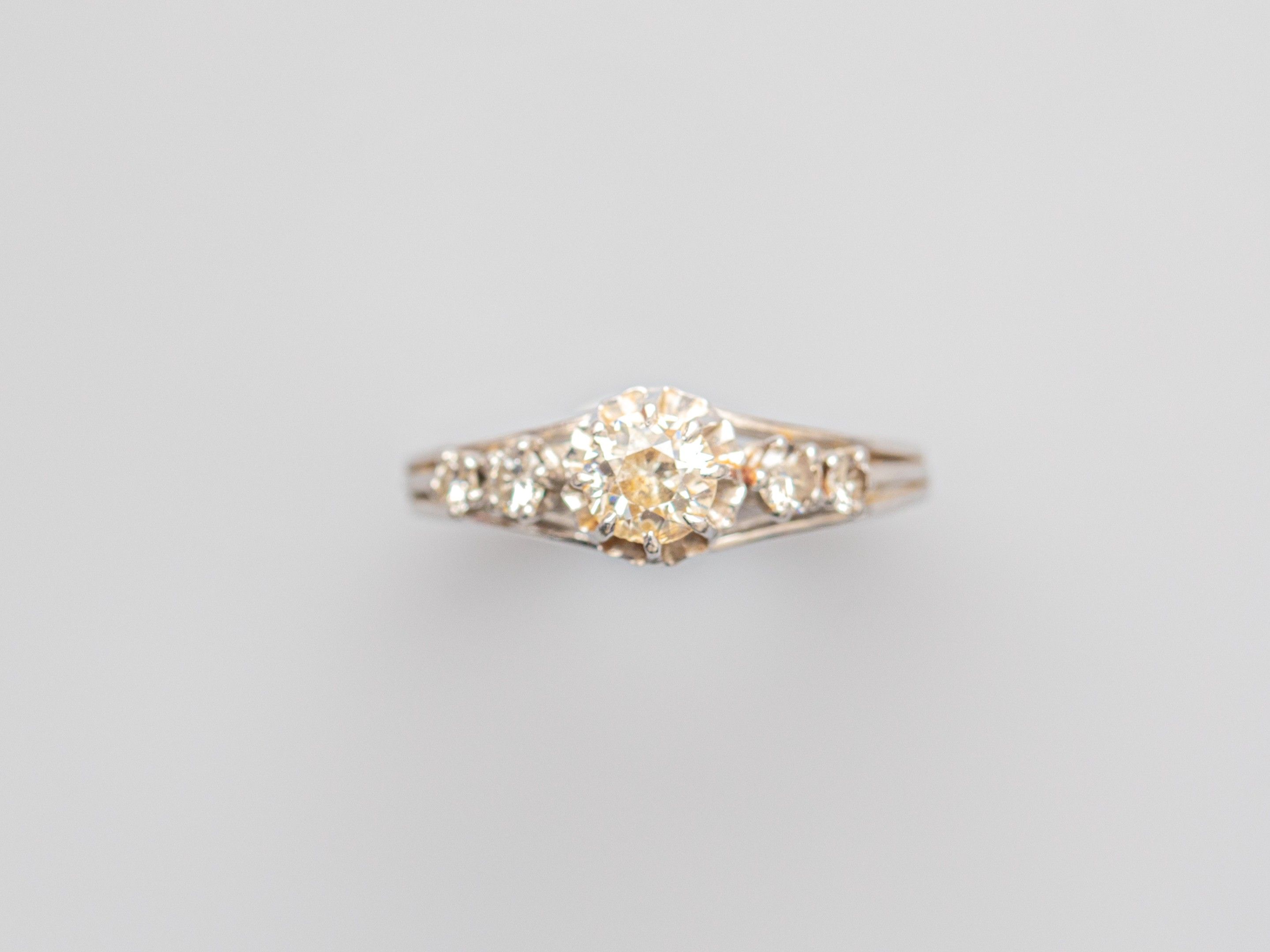 Ring in 750°/°° (18K) white gold, set with a 0.45/0.50 ct old-cut diamond set with four small brilliant-cut diamonds. 4.4 g. TDD 57. Width: 7 mm.