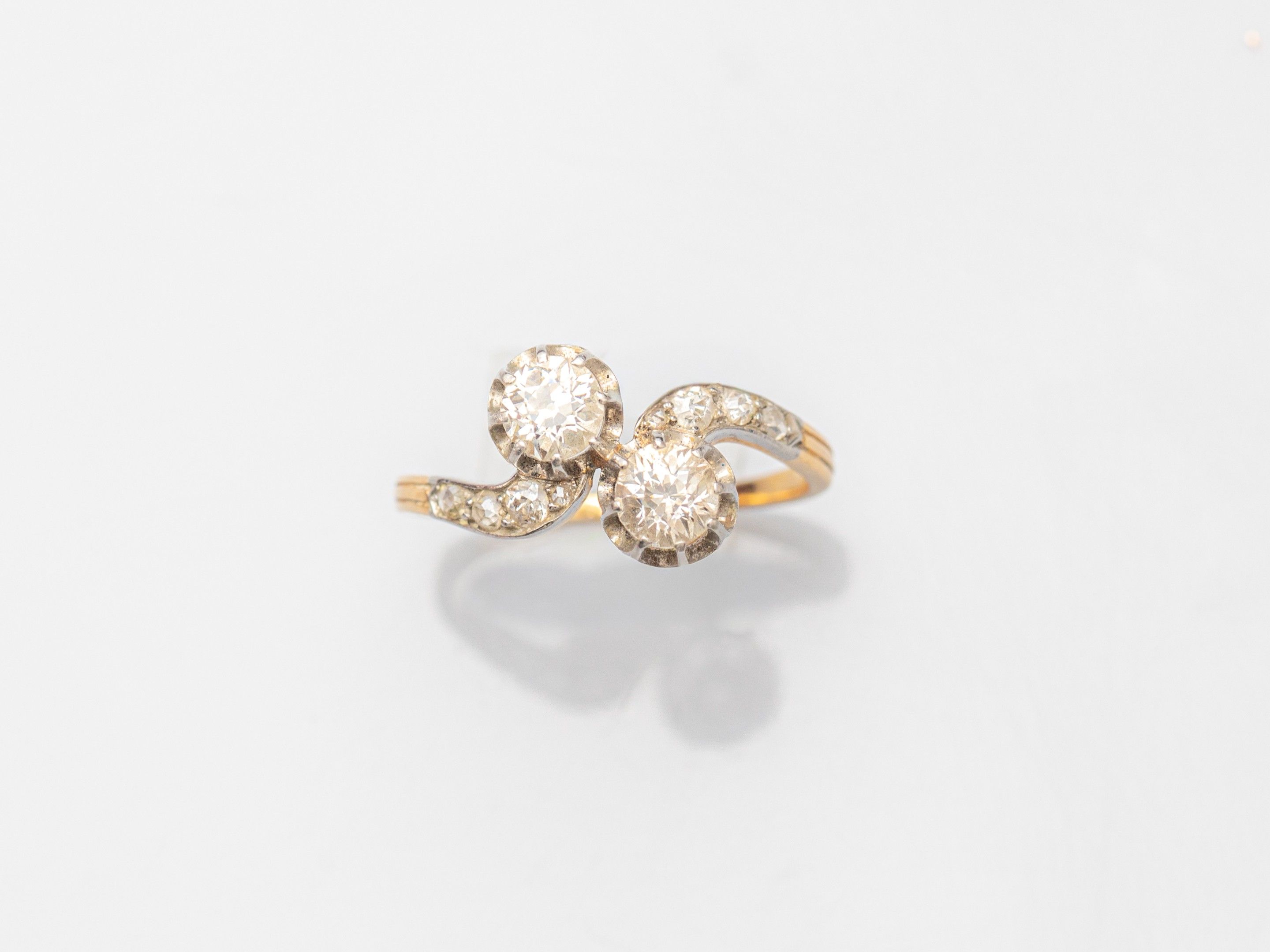 Antique toi et moi ring in two-tone 750°/°° (18K) gold, set with two old-cut diamonds (approx. 0.30/0.40 ct each), and six diamonds on the mounting (old-cut and rose-cut). Work circa 1900. 2.9 g. TDD 57. Width: 9.2 mm.