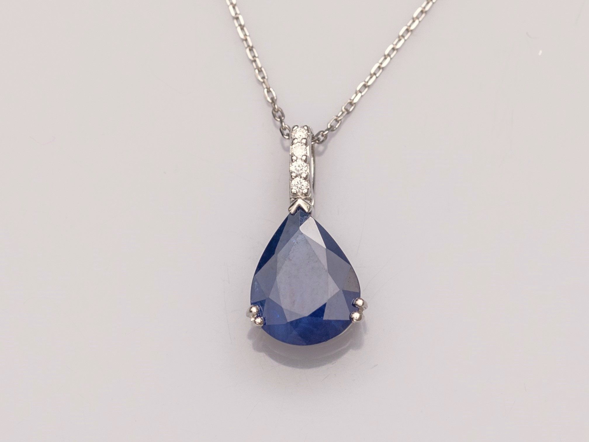 Pendant in 750°/°°(18K) white gold, set with a pear-cut sapphire weighing approximately 2.5 ct, enhanced with brilliant-cut diamonds. Chain in 750°/°°(18K) white gold, with fine forçat link. 2.4 g. Length: 45 cm. Pendant height: 1.7 cm. Marked with an eagle's head.