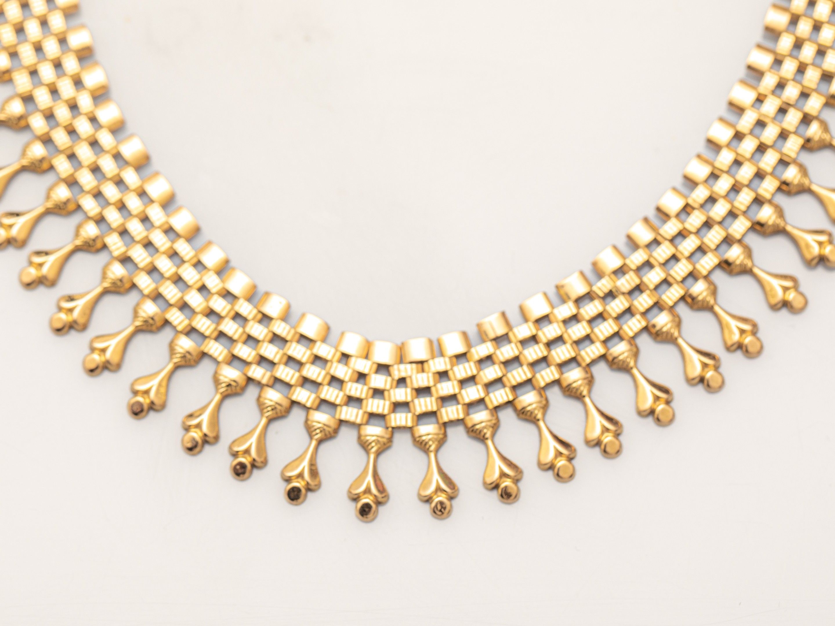 Drapery necklace in 18K yellow gold, with hinged links adorned with fleur-de-lis pendants. Work circa 1950. 45.2 g. Length: 45 cm.
