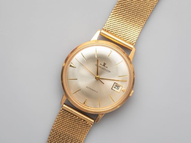 JAEGER-LECOULTRE, city wristwatch in 750°/°° (18K) yellow gold, with round case, smooth bezel, fluted crown, brushed dial with applied spiked hour markers, date window at 3 o'clock, signed automatic movement working at time of appraisal. Gold bracelet with pressed Milanese link, flap clasp (Italian work from the Venice region). Signed and numbered 157531 and hallmarked Edmond Jaeger. Gross weight: 71.2 g. Size: 34 mm. Bracelet length: 19 cm. Eagle head hallmark.