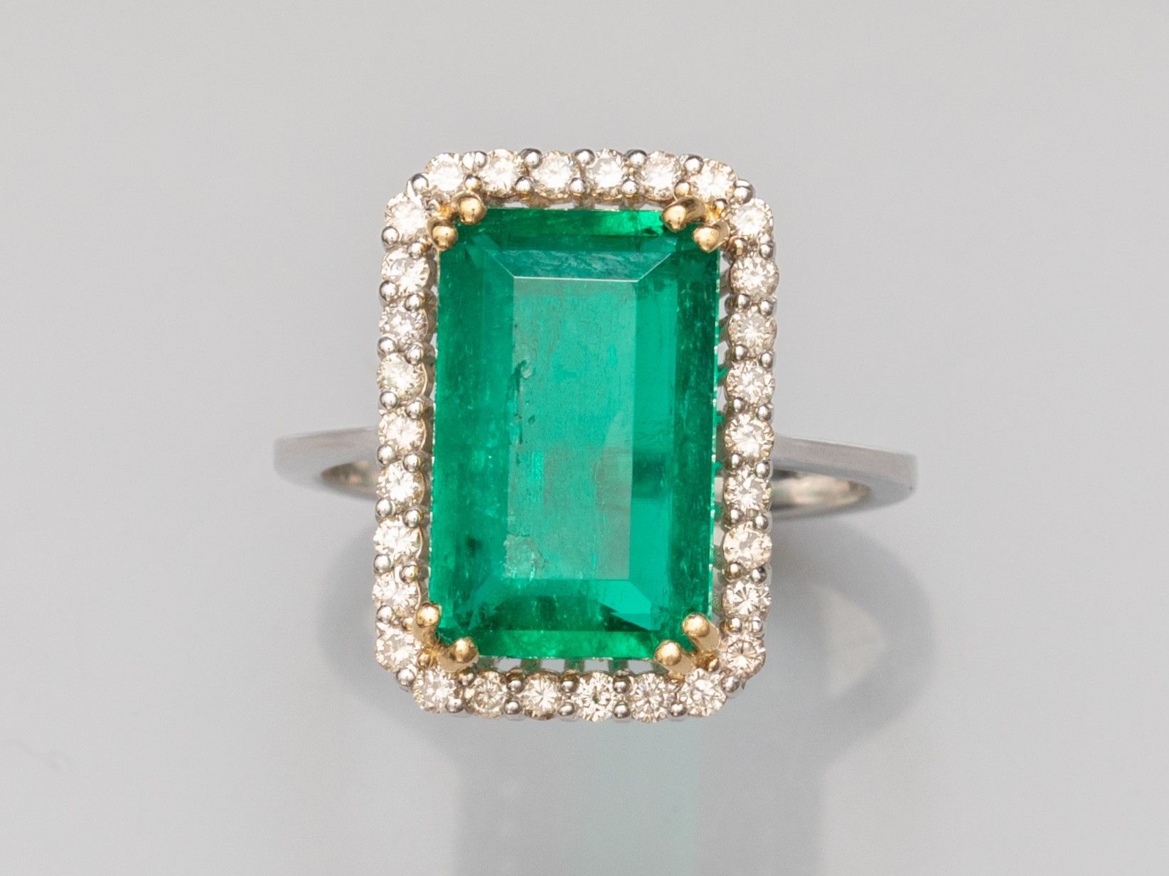Ring in two-tone 750°/°°(18K) gold, set with a large rectangular emerald weighing approx. 4.10 ct (Colombia, traces of resin), surrounded by brilliant-cut diamonds. Tiny chips. 5.9 g. TDD 54.5. Length: 18.1 mm. Eagle head hallmark.