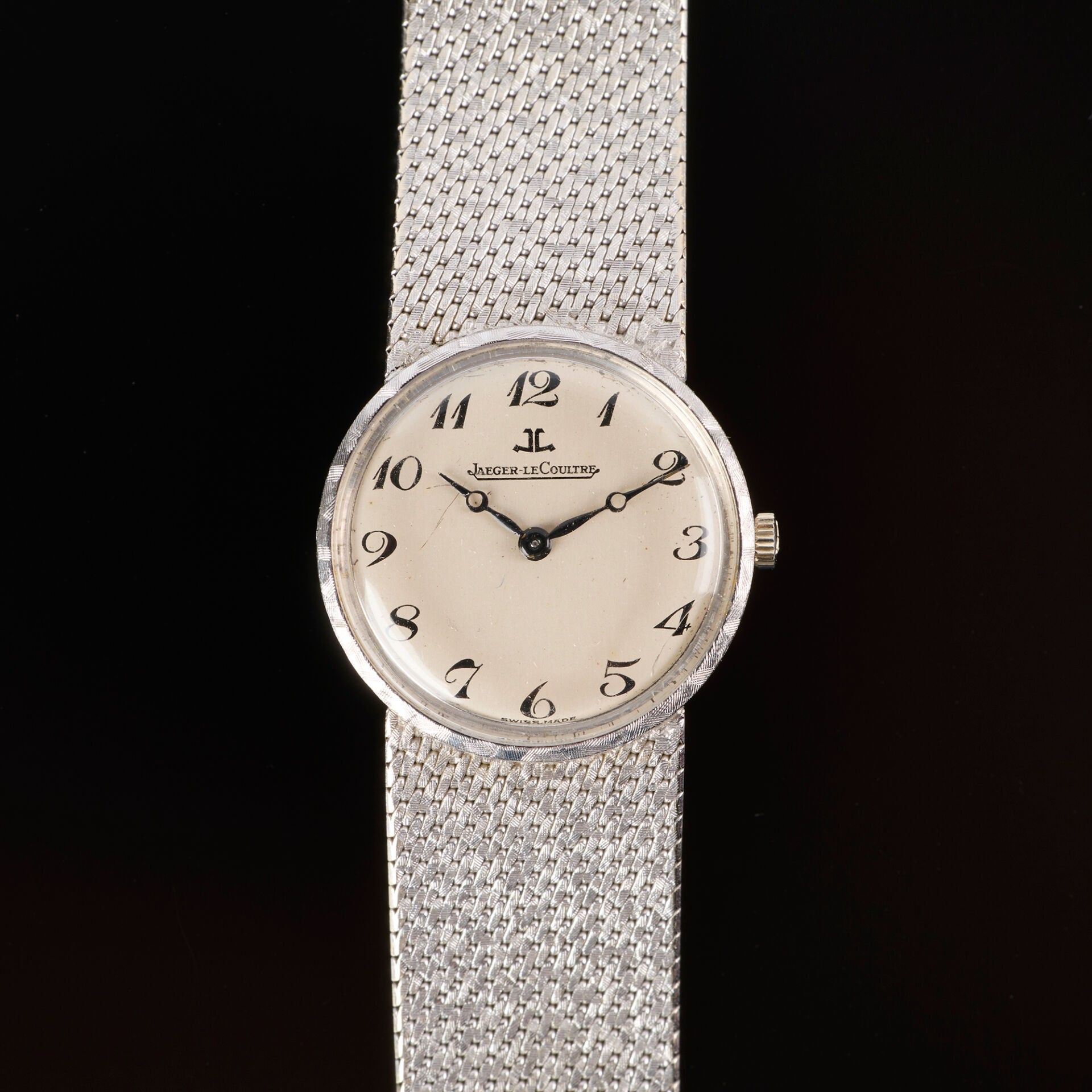 White gold cocktail watch, grey dial with Arabic numerals, marked "Jaeger - LeCoultre - Swiis Made", Breguet hands, integrated satin-brushed mesh bracelet, marked "JL" on the clasp.