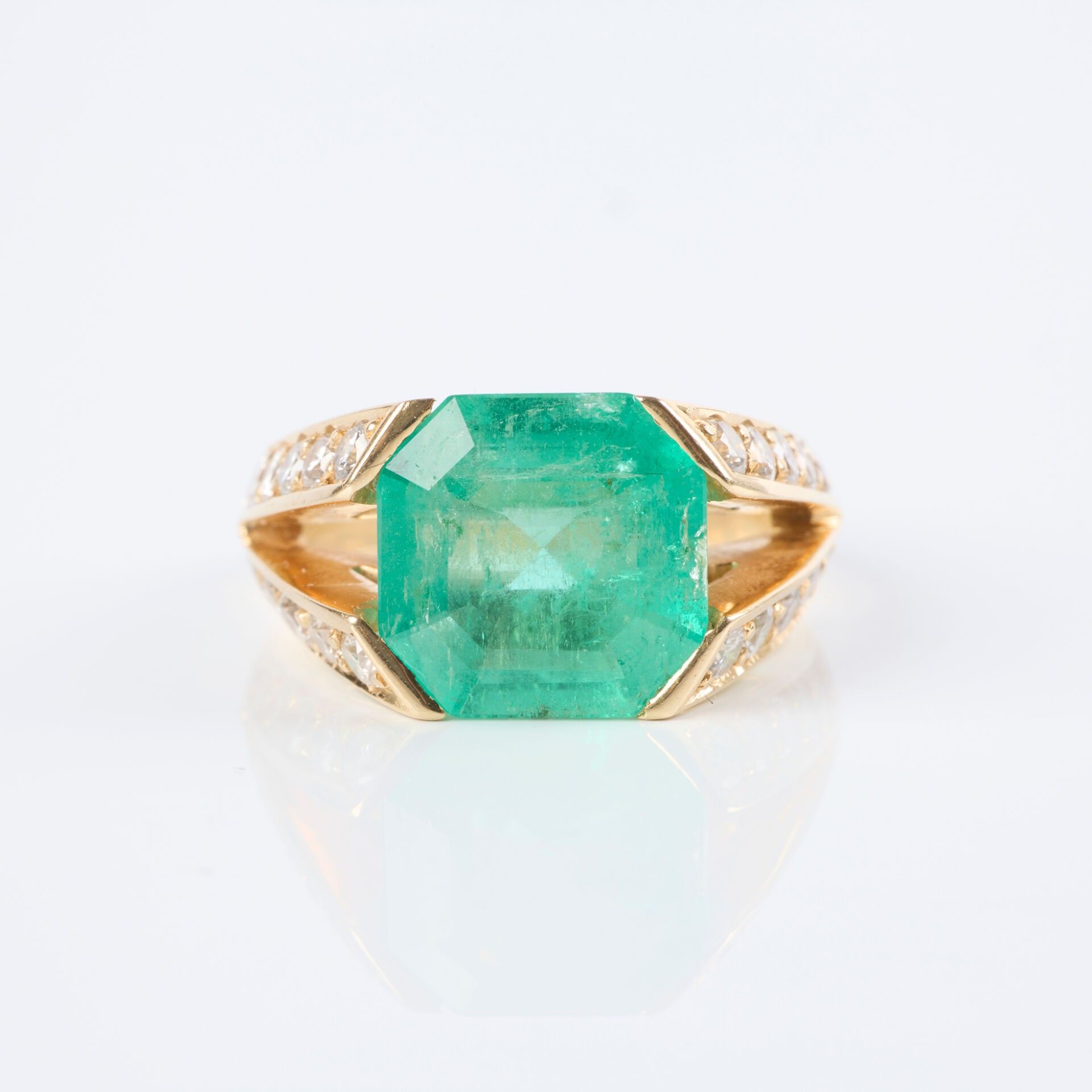 Gold ring set with an emerald-cut emerald weighing approx. 5.10 cts (10.75 x 10.70 x 5.1 mm) set with 24 brilliant-cut diamonds weighing approx. 1.20 ct. TDD 53-54. 8.90 g gross