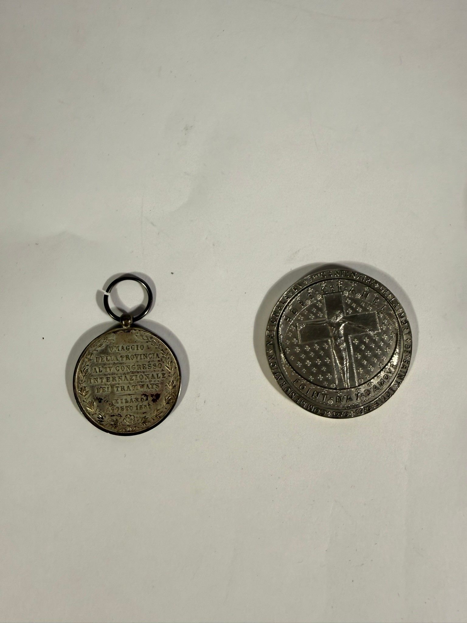 Attached is a medal in tribute to the 1889 Milan International Tramway Congress, in a case.