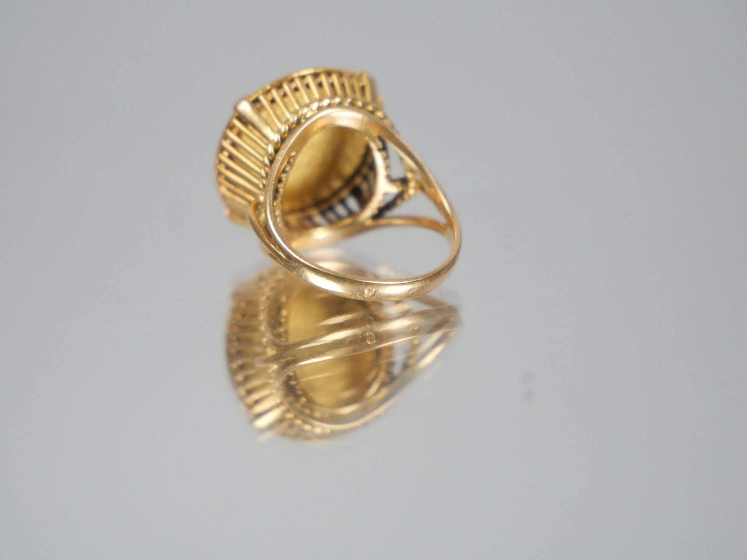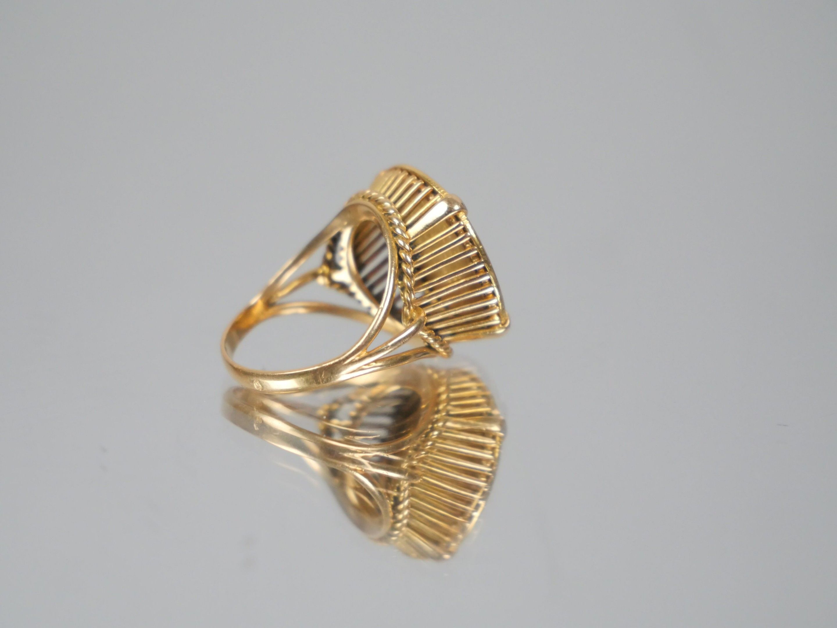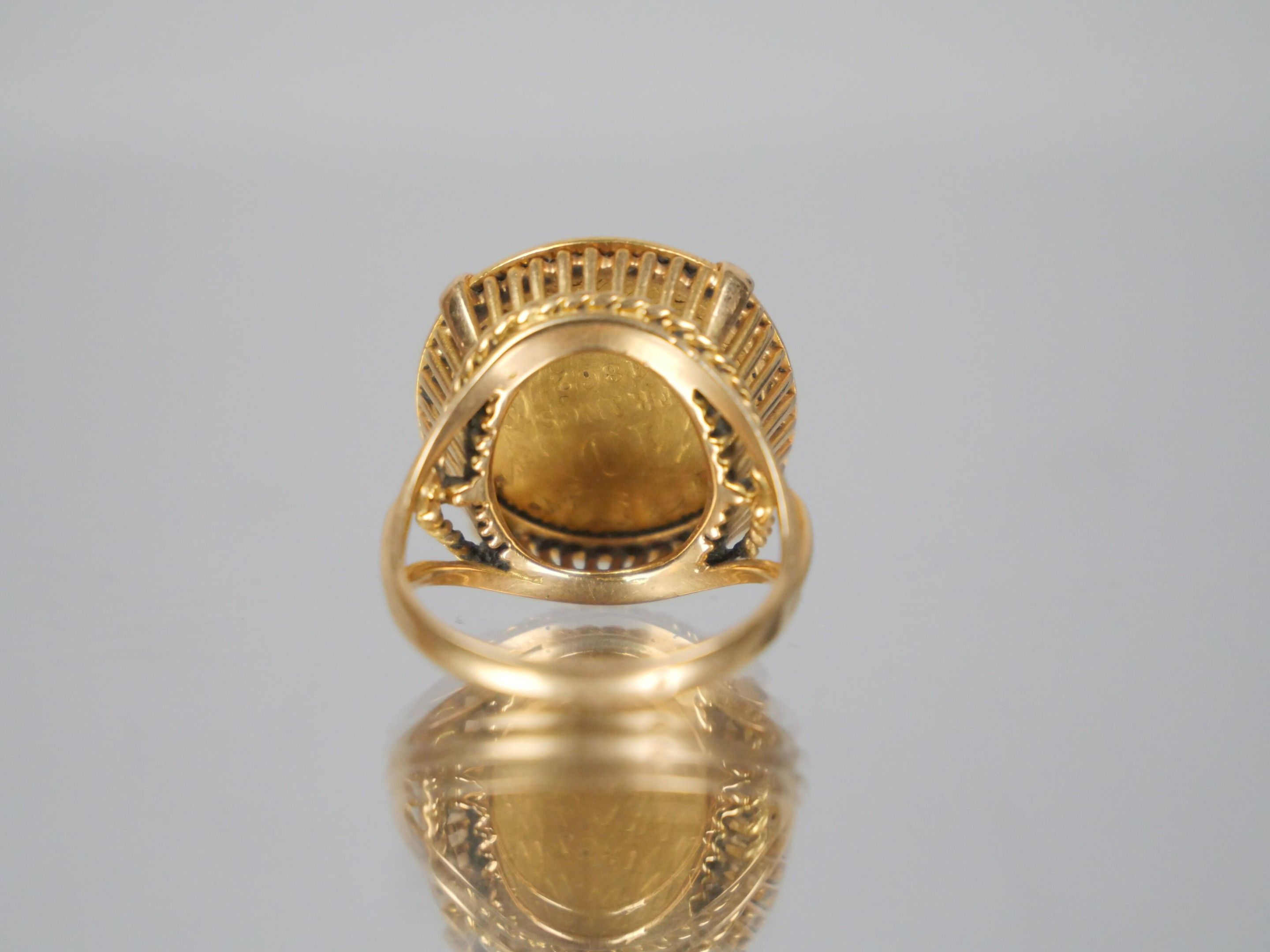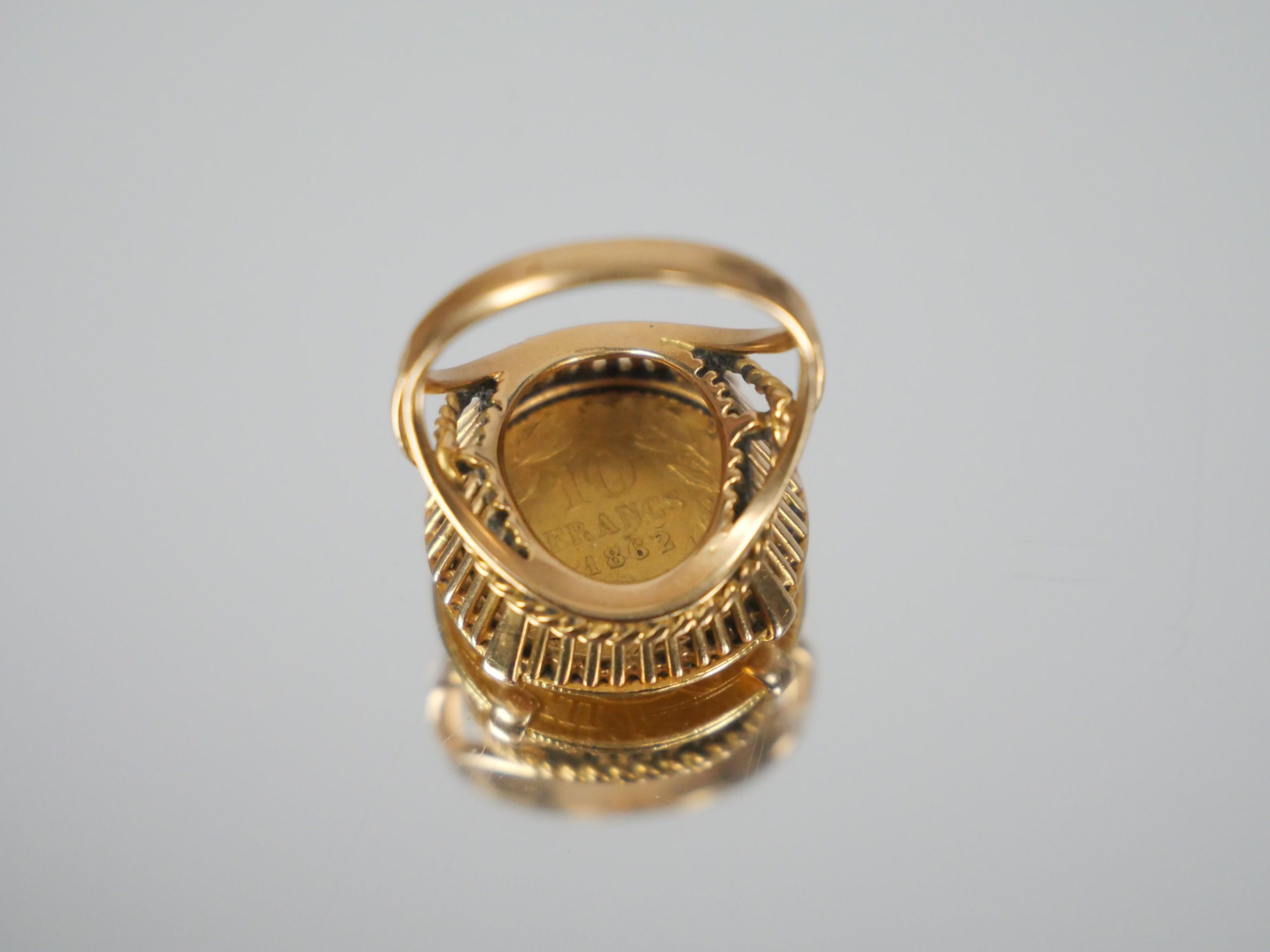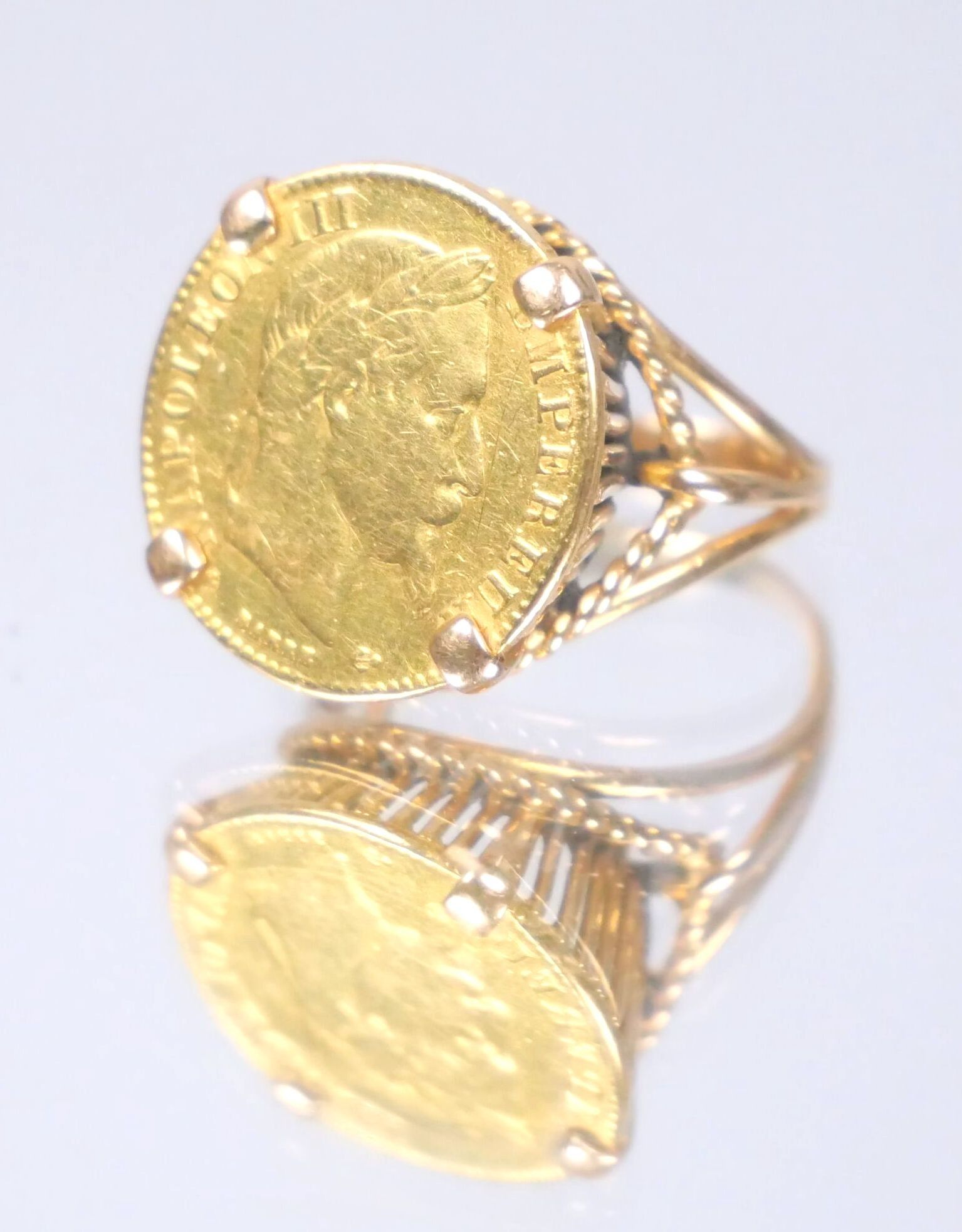 Ring in 750 thousandths yellow gold, the openwork bezel set with a 10 franc gold coin Napoléon III laureate, 1862 A.