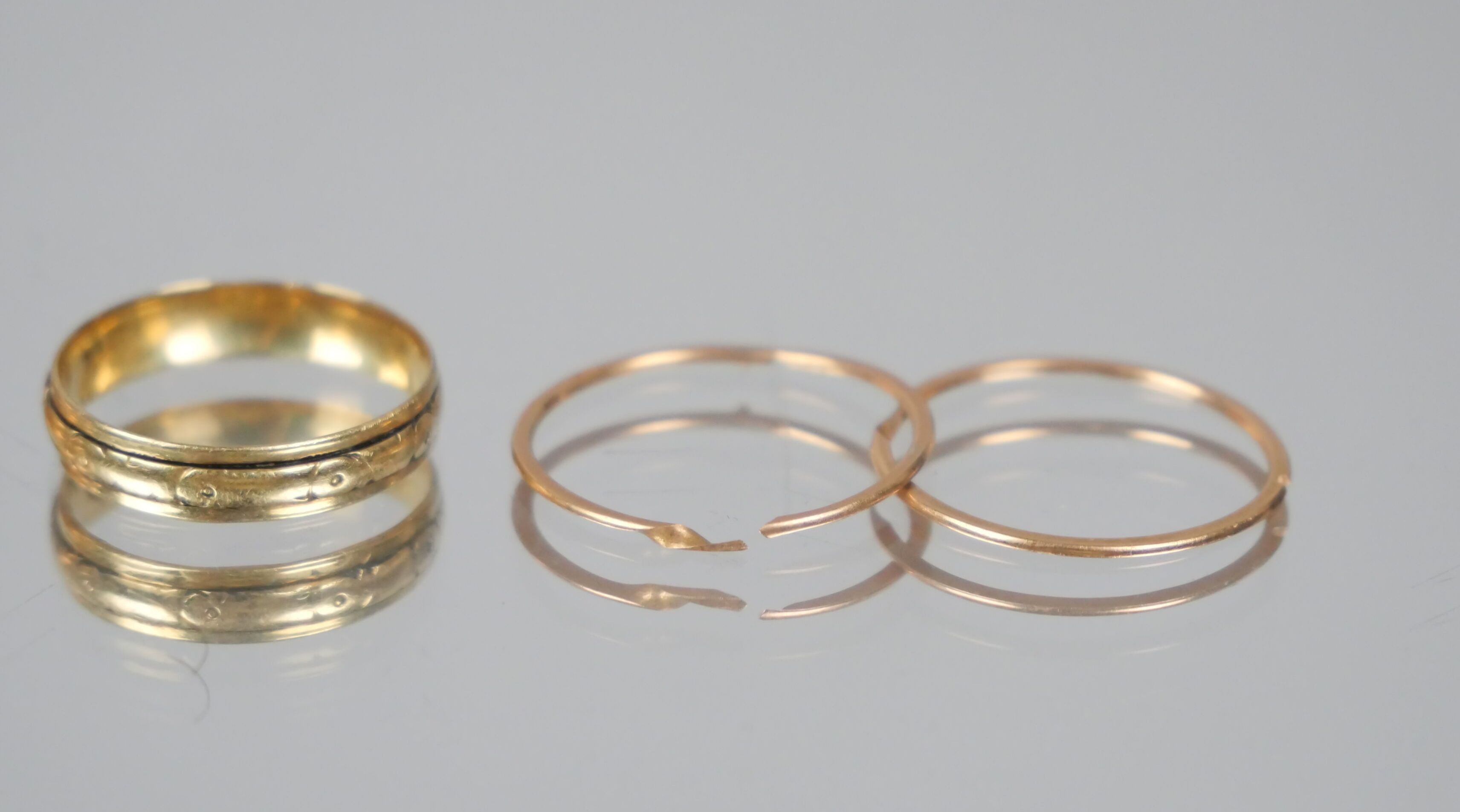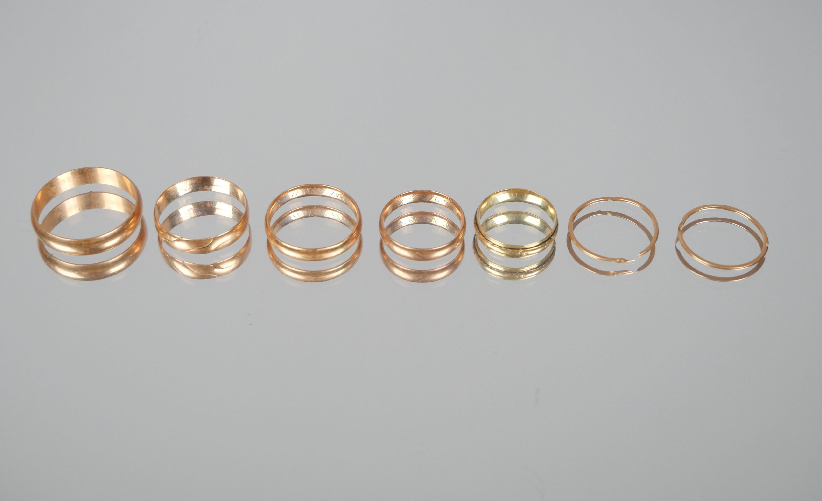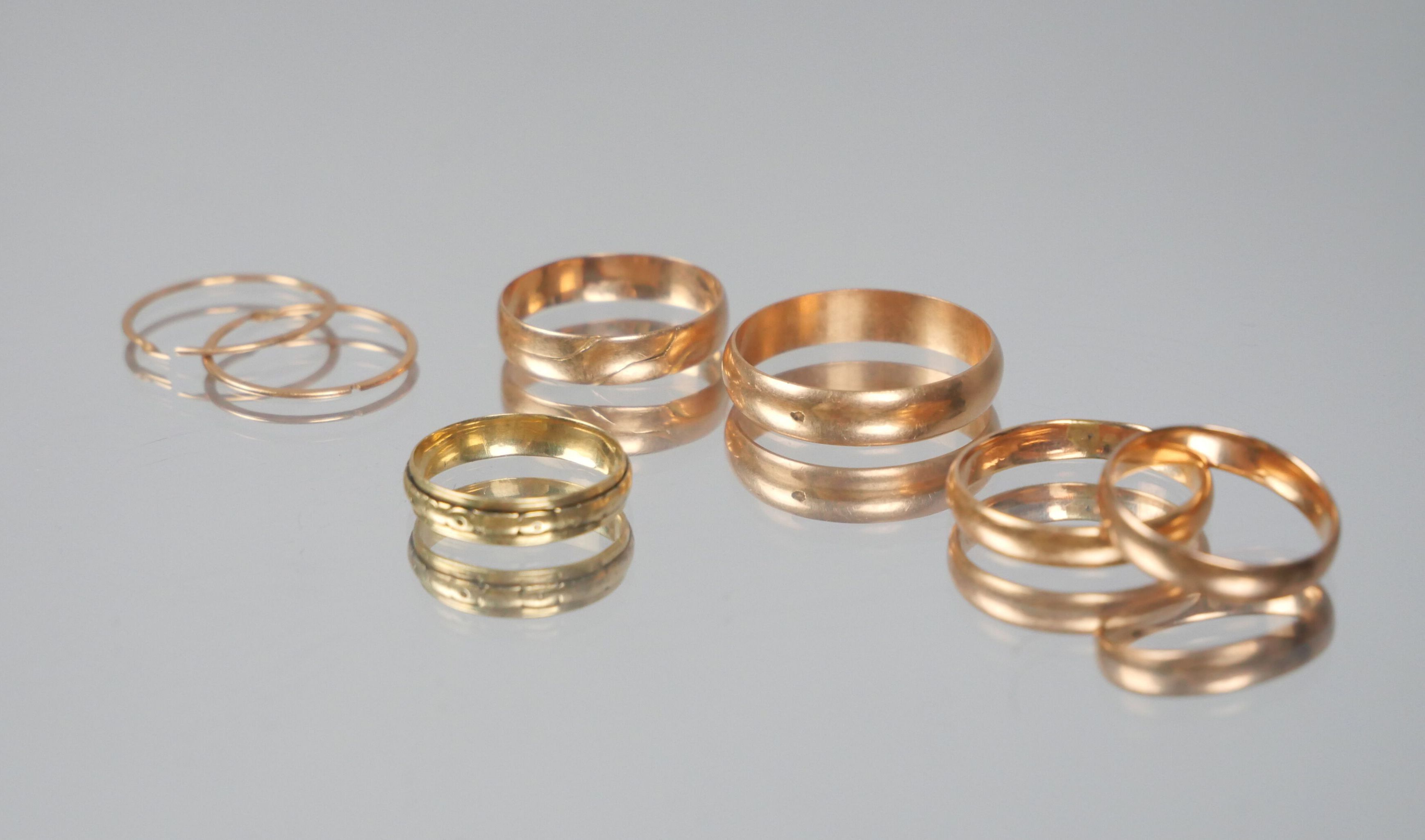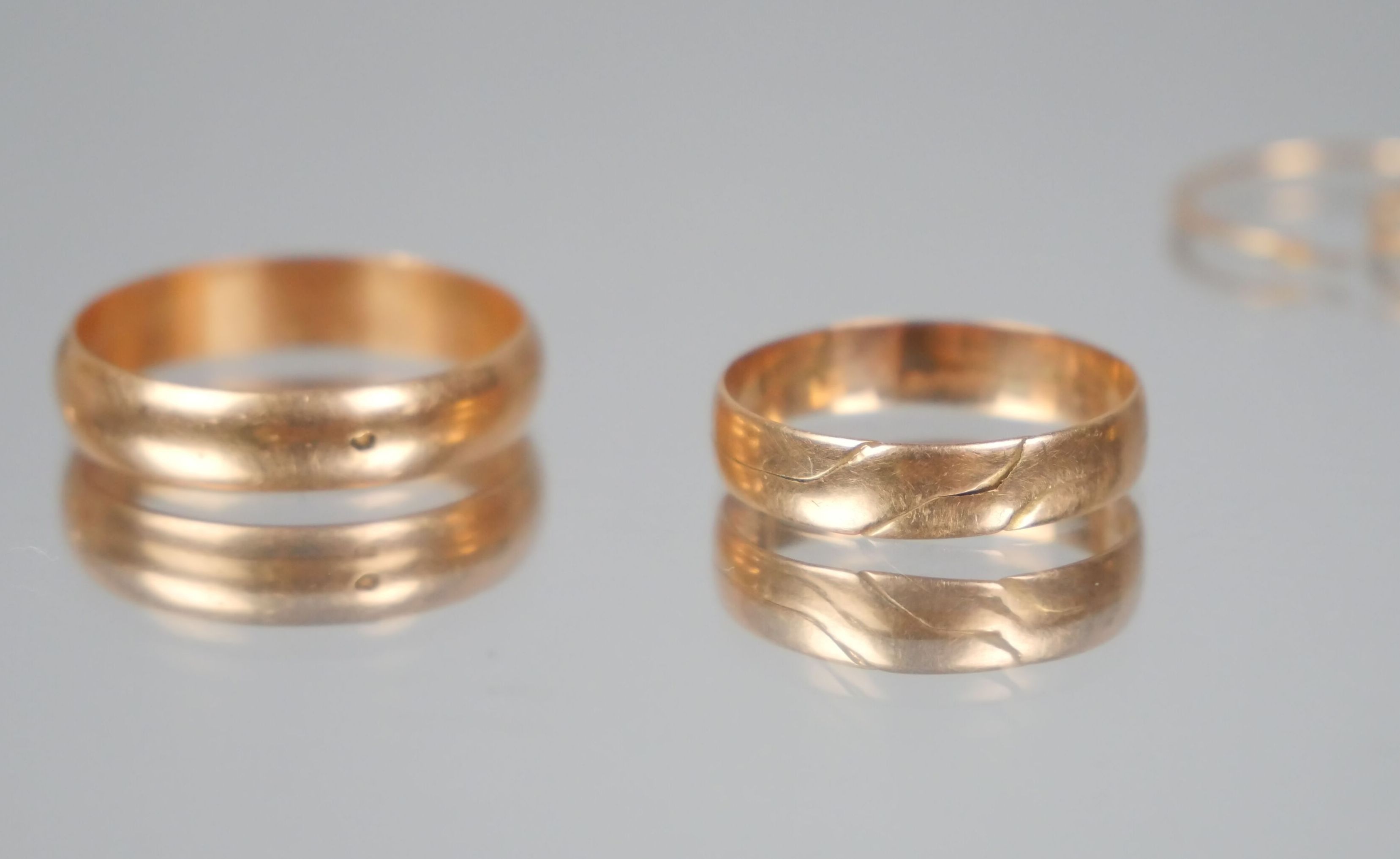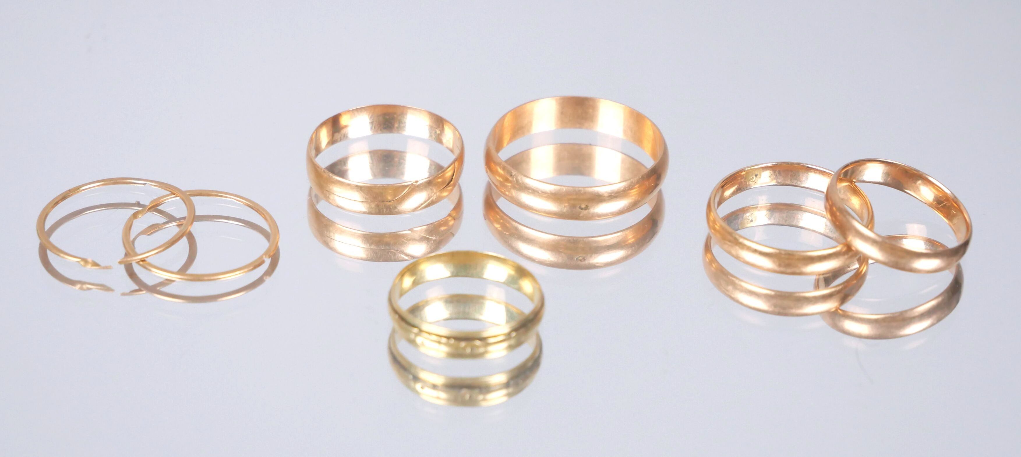 Four wedding rings and a pair of earrings in 750 thousandths yellow gold. A 585 thousandths gold wedding ring is attached.