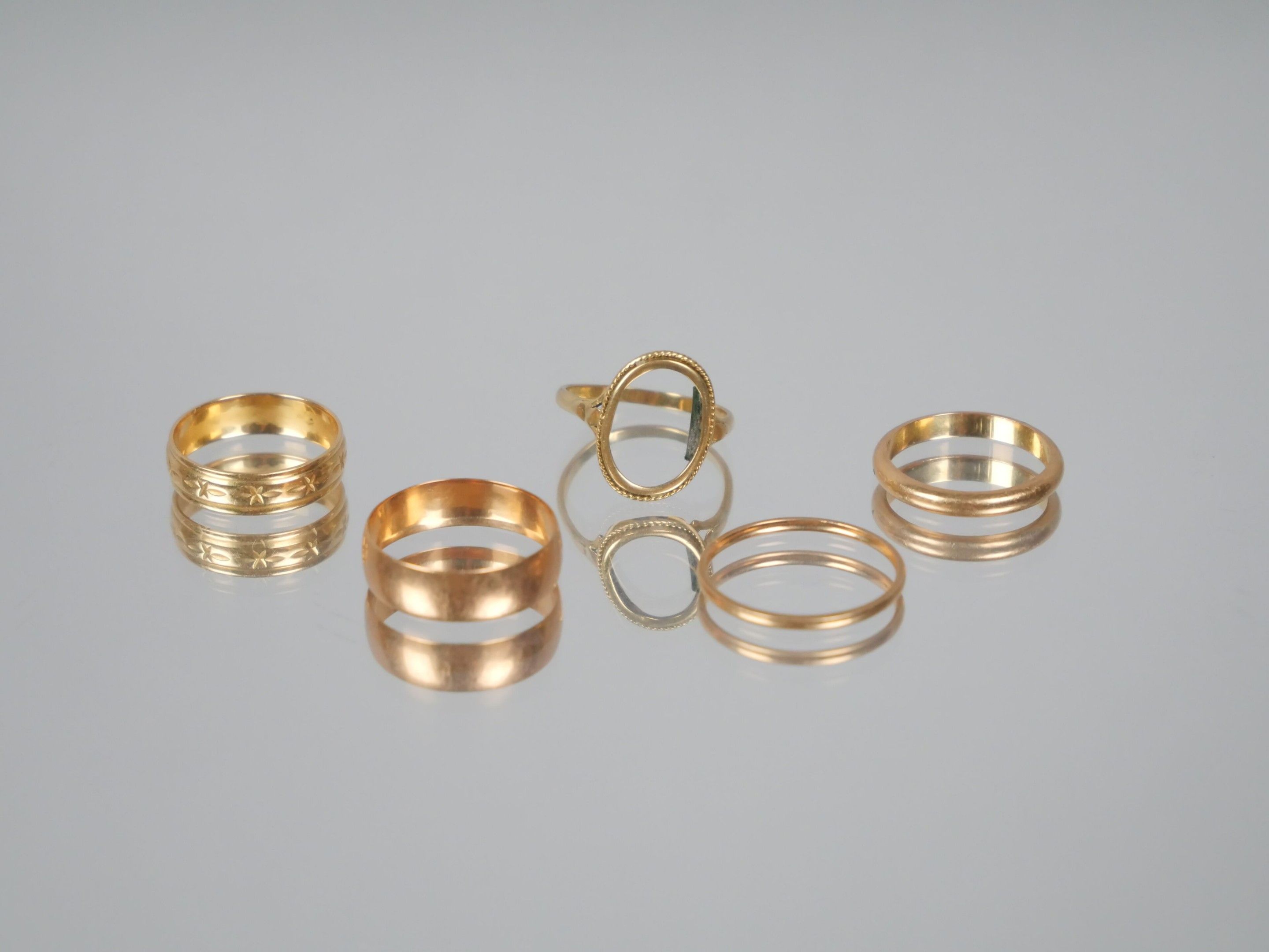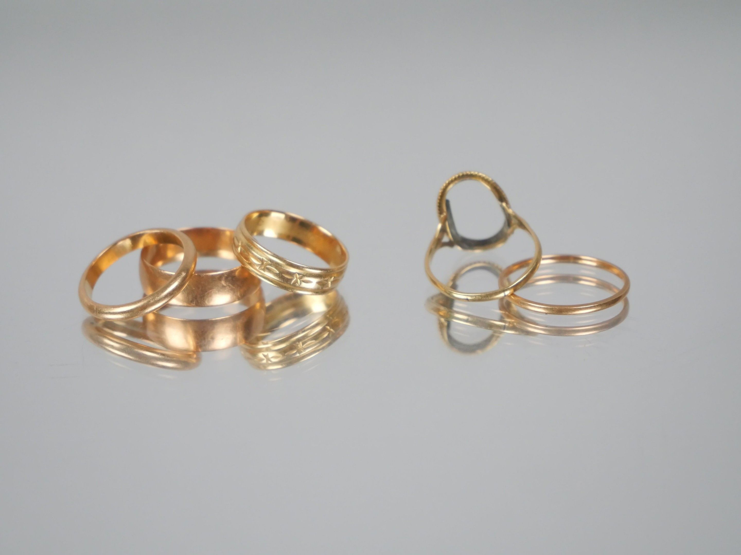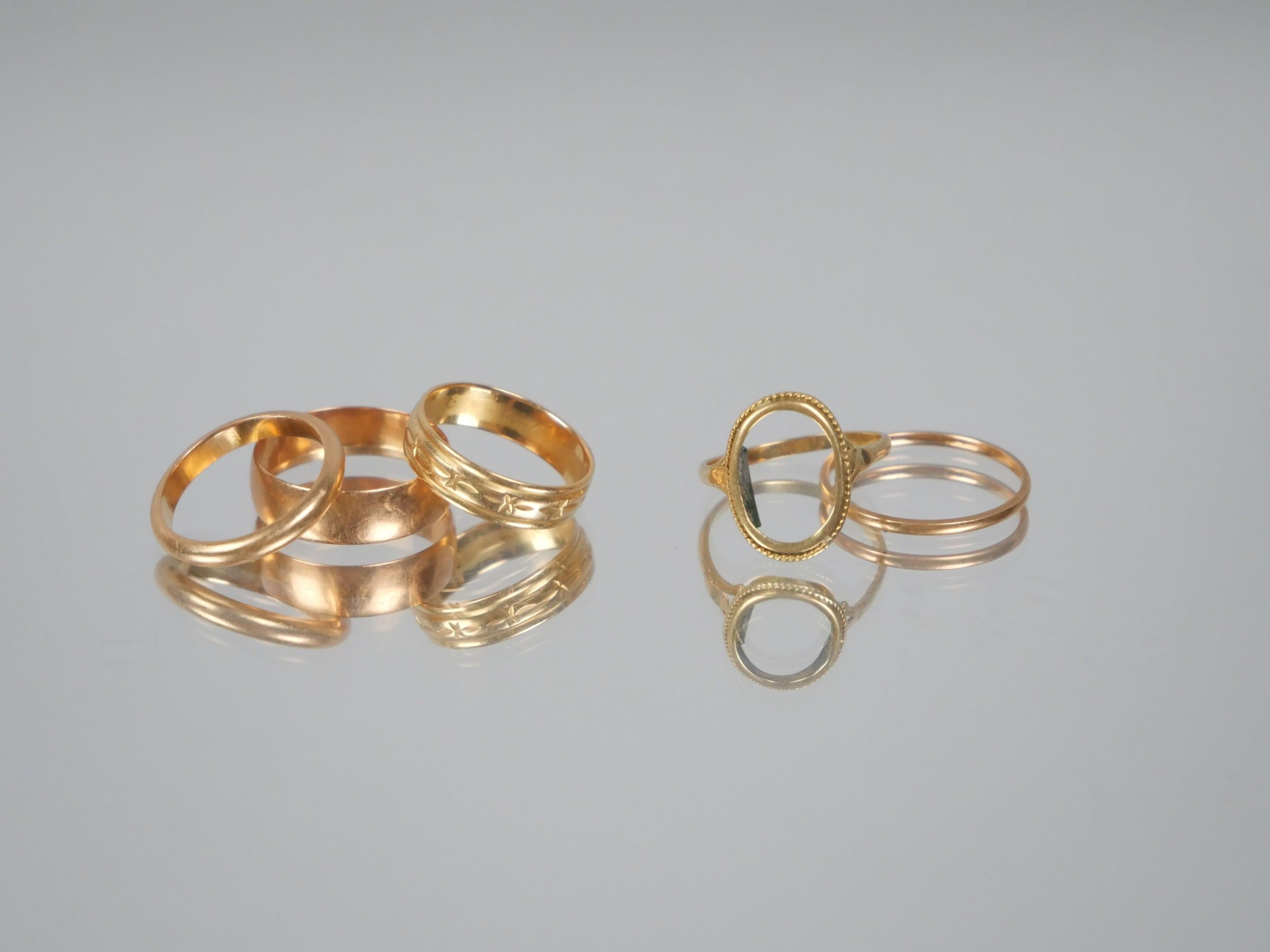 Four wedding rings and one ring setting in 750 thousandths yellow gold.