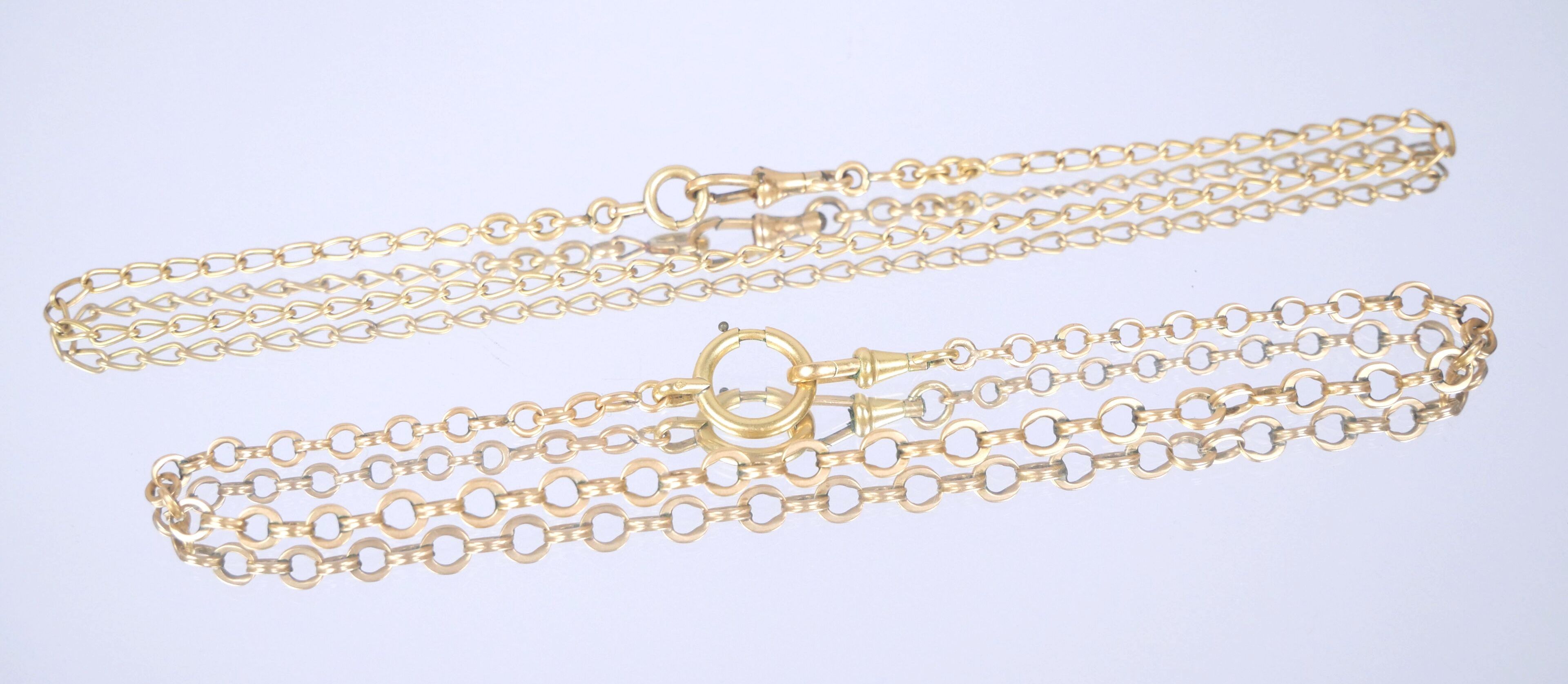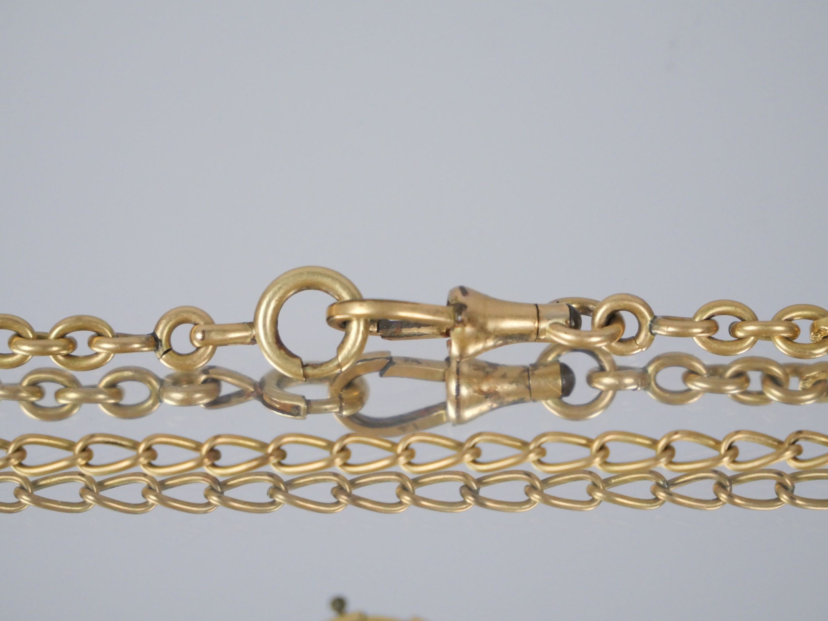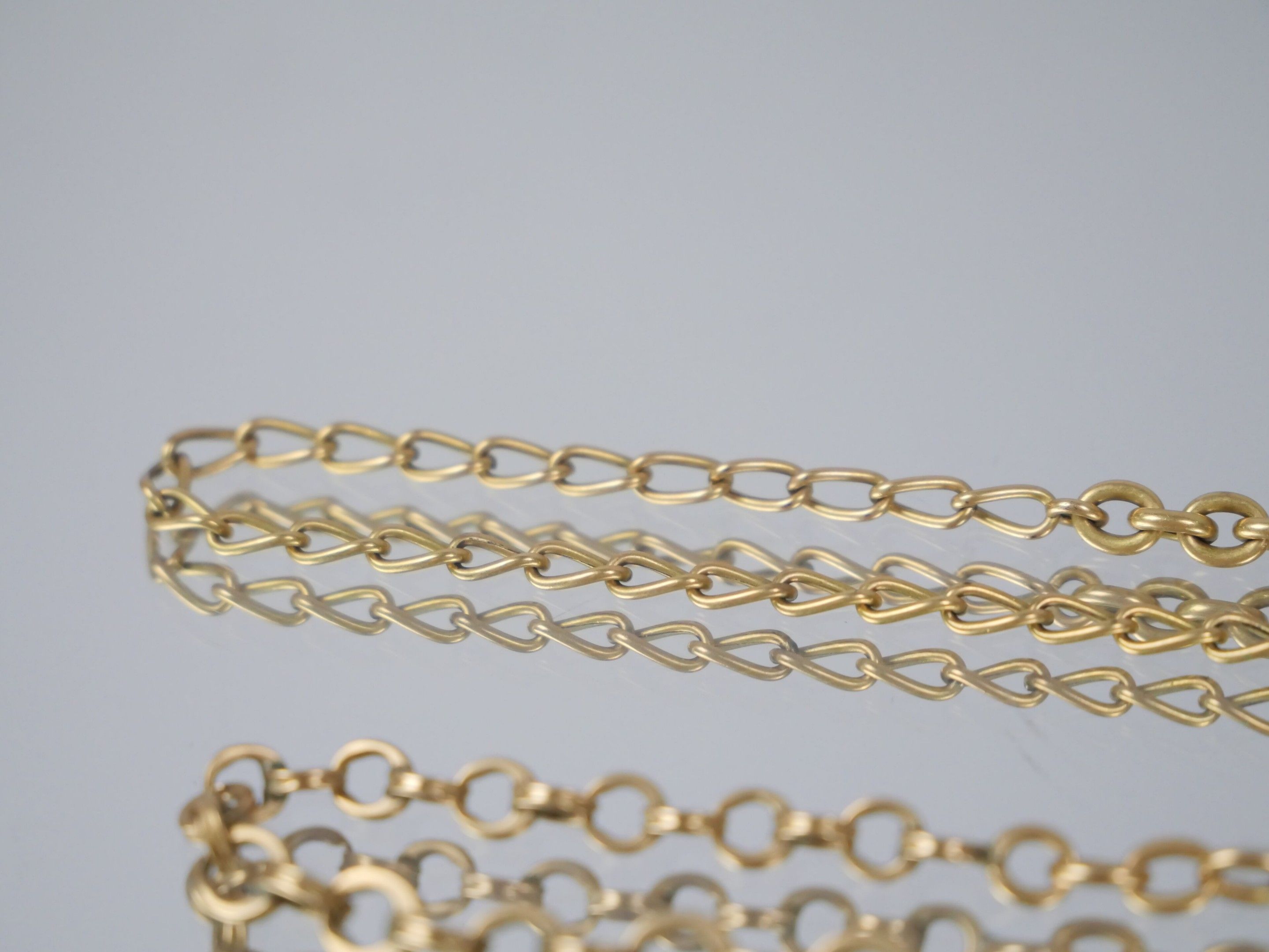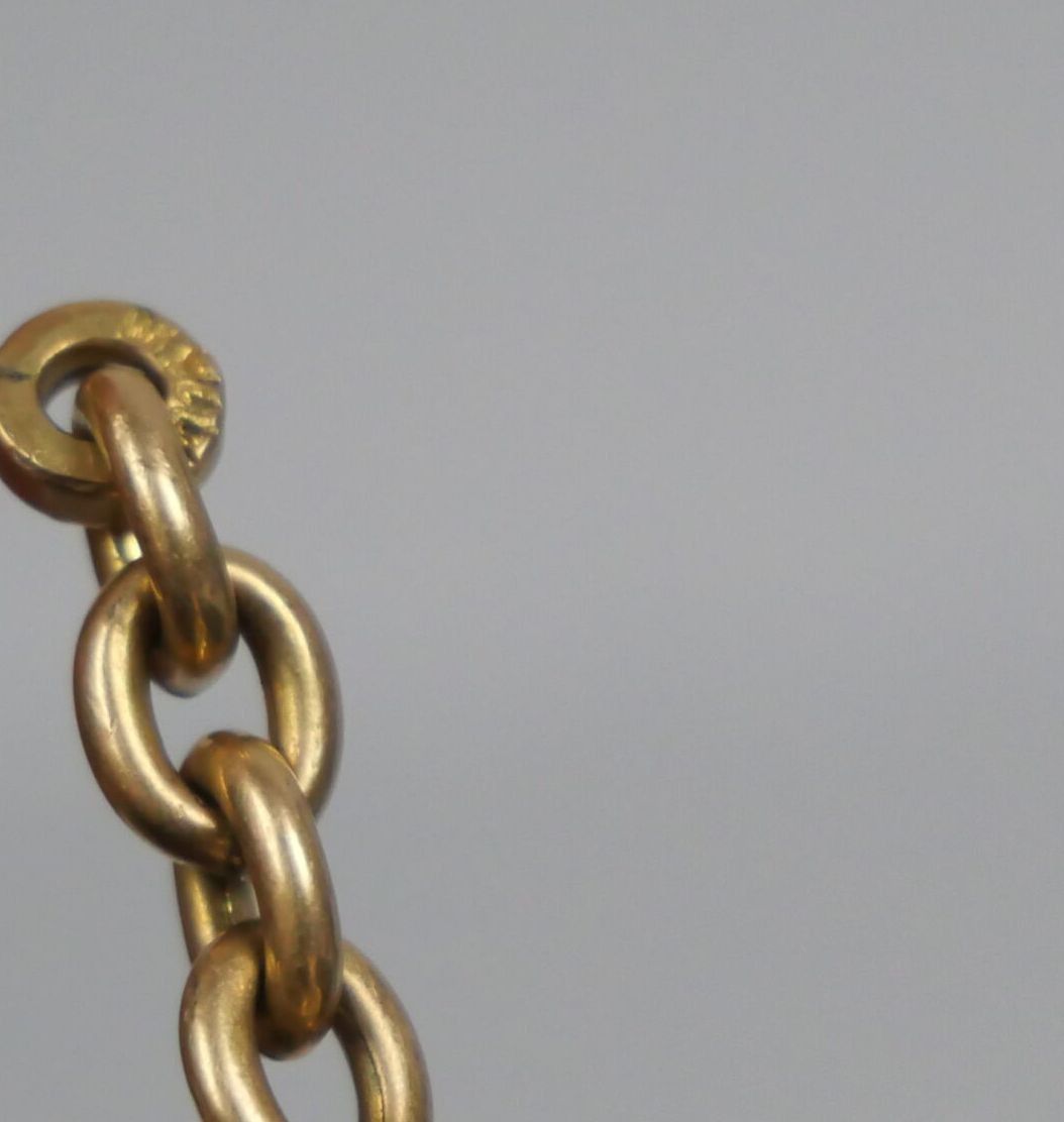 A gilt metal watch chain with curb chain link.