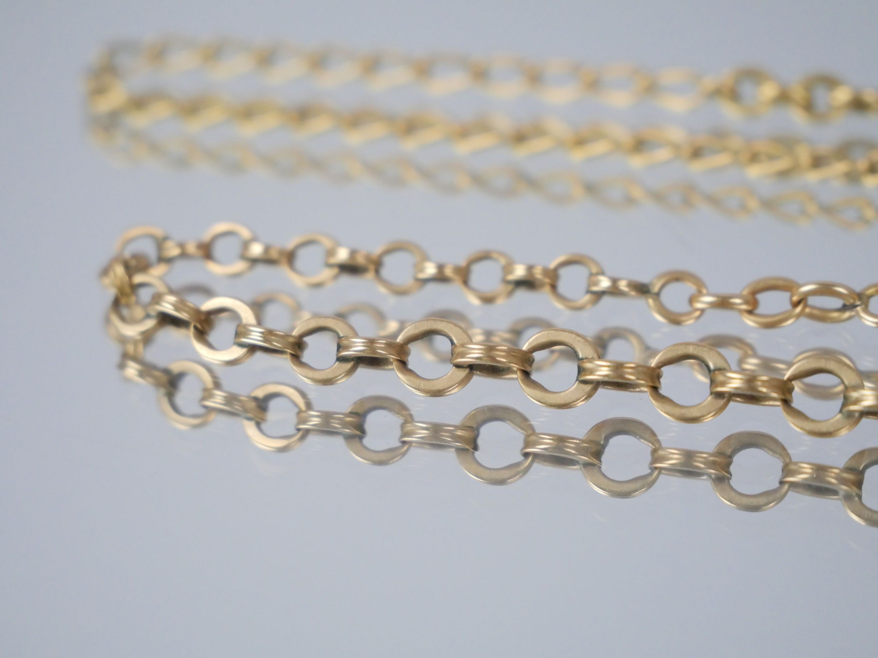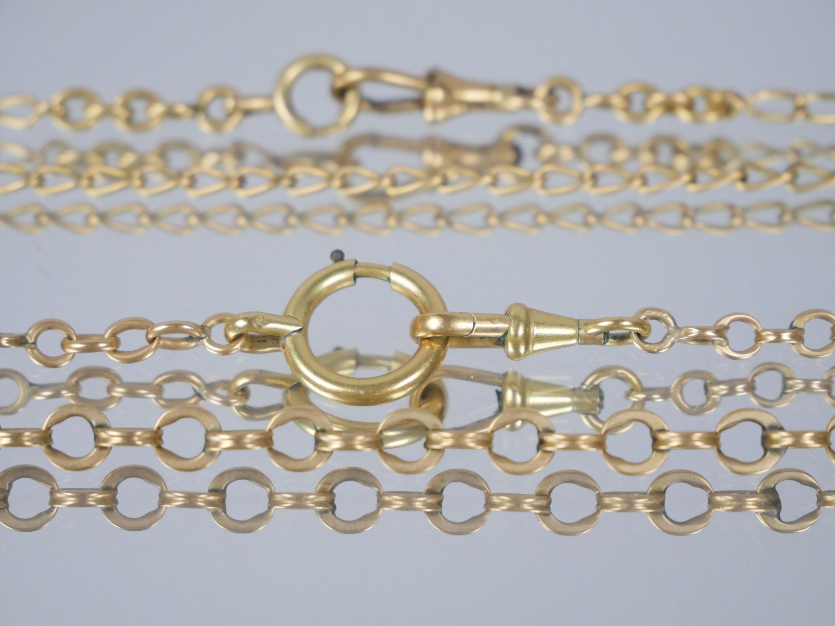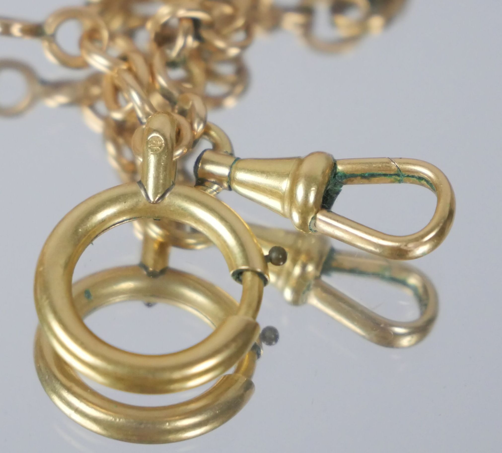 A gilt metal watch chain with curb chain link.