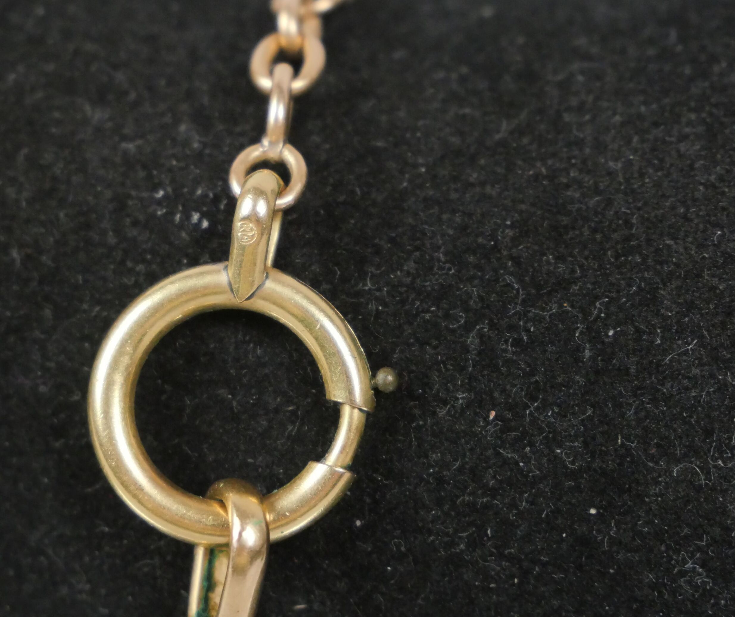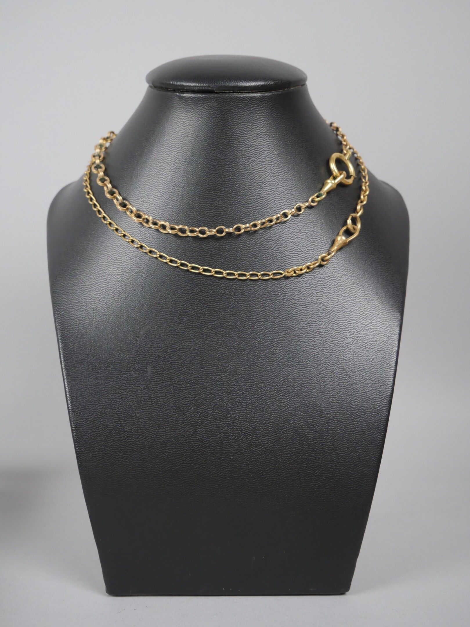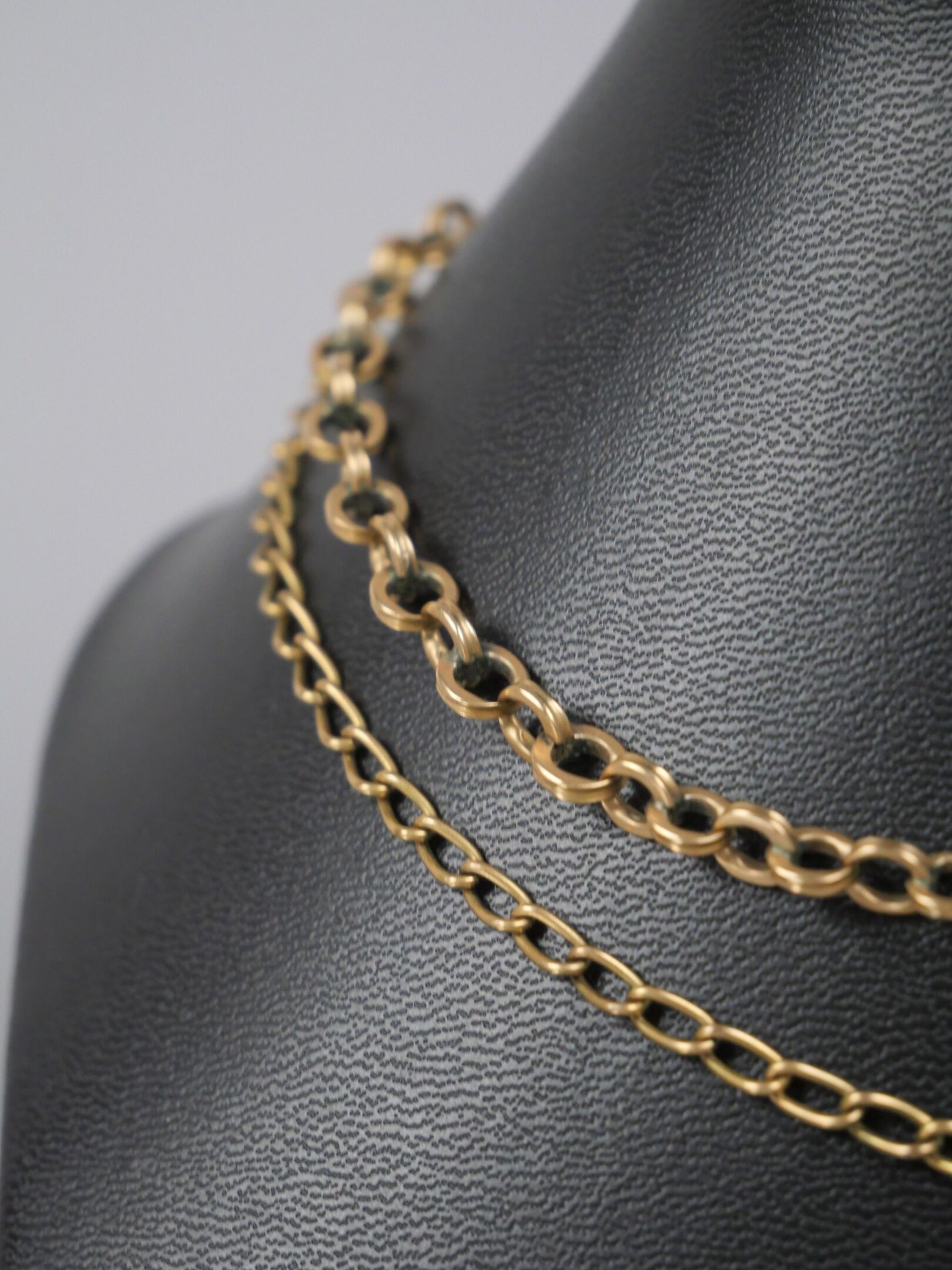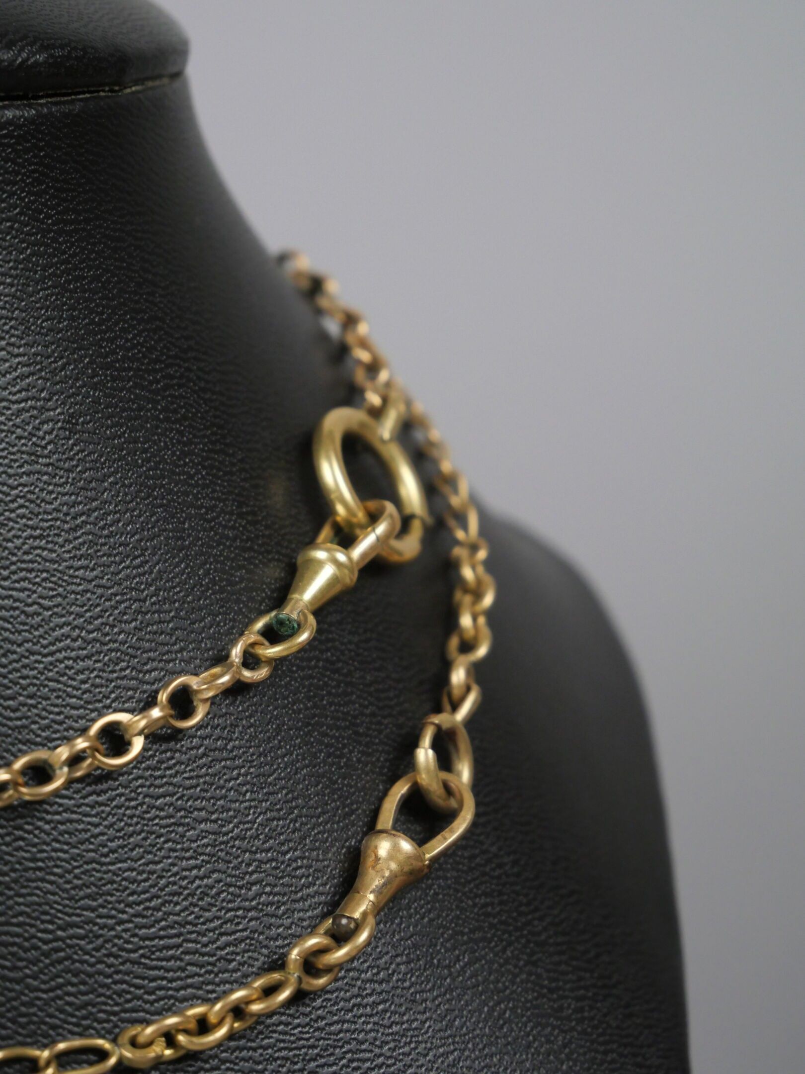 A gilt metal watch chain with curb chain link.