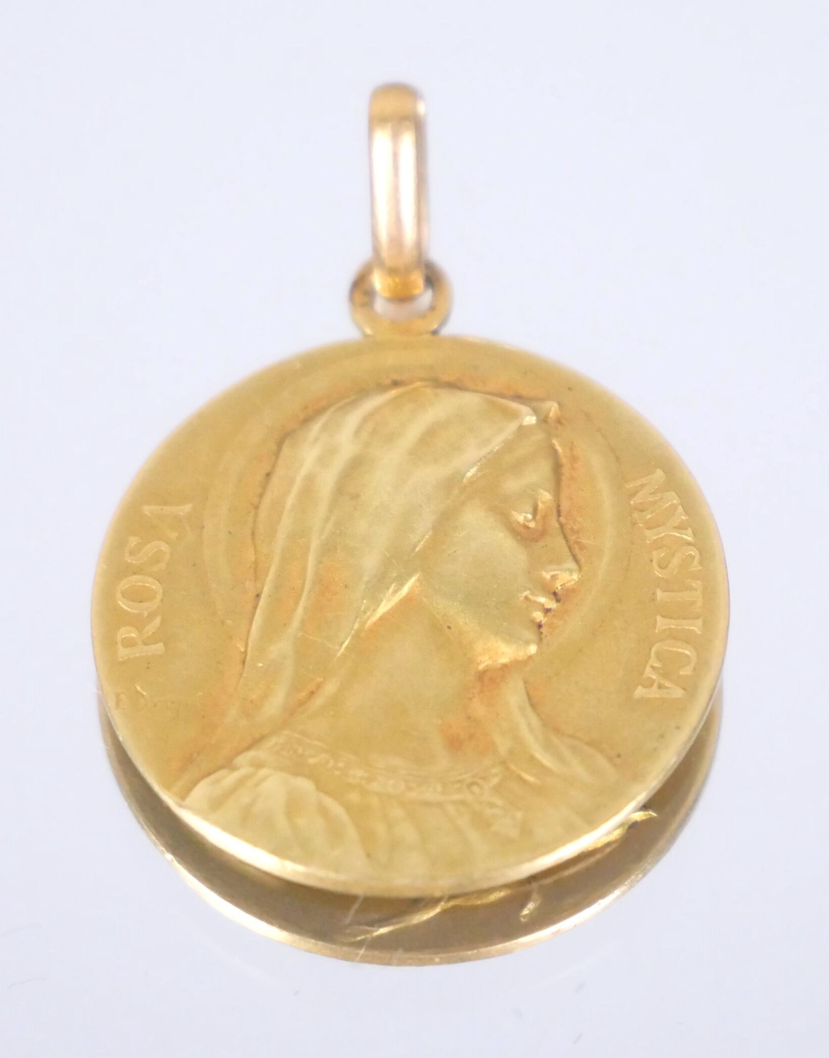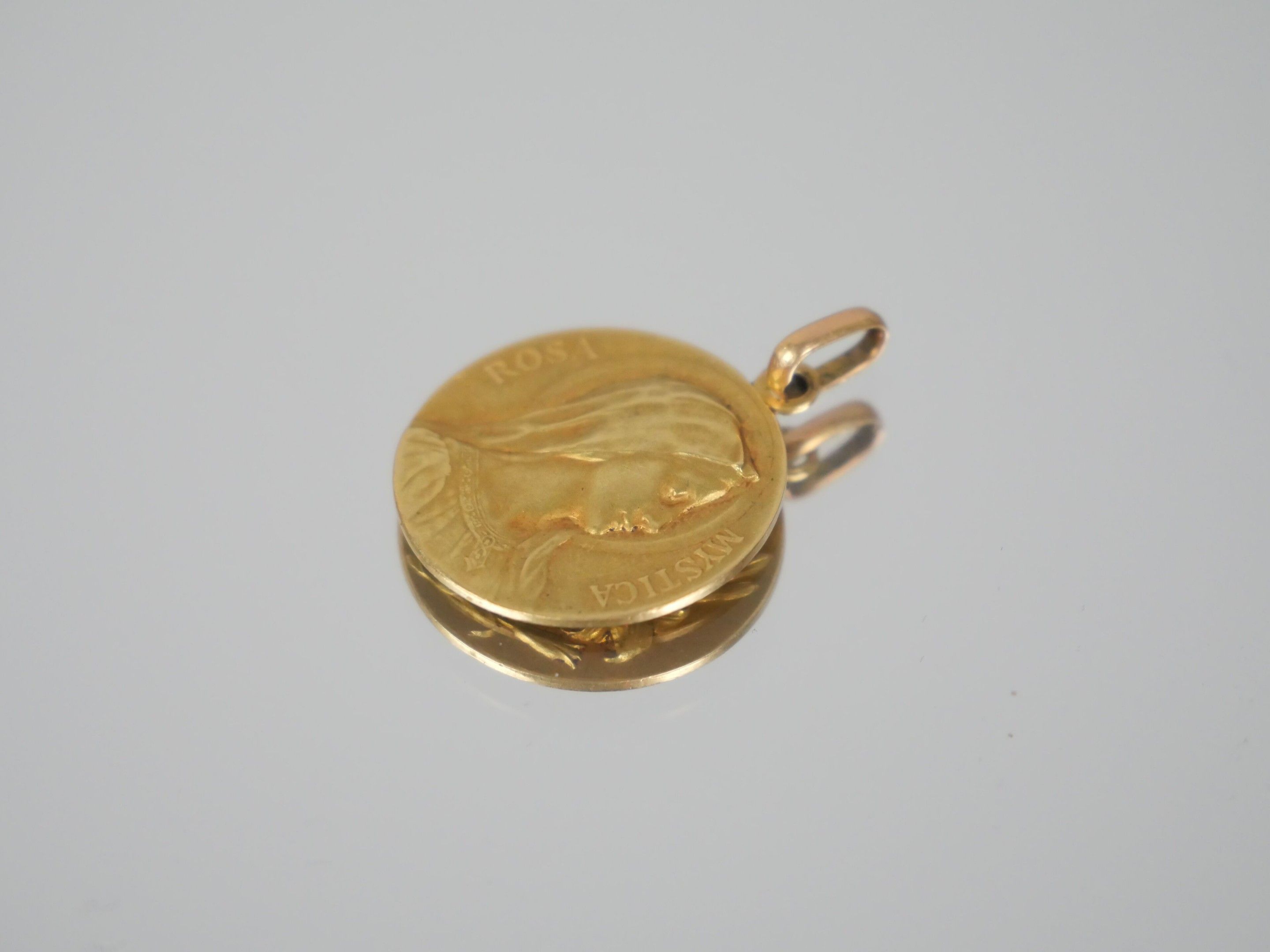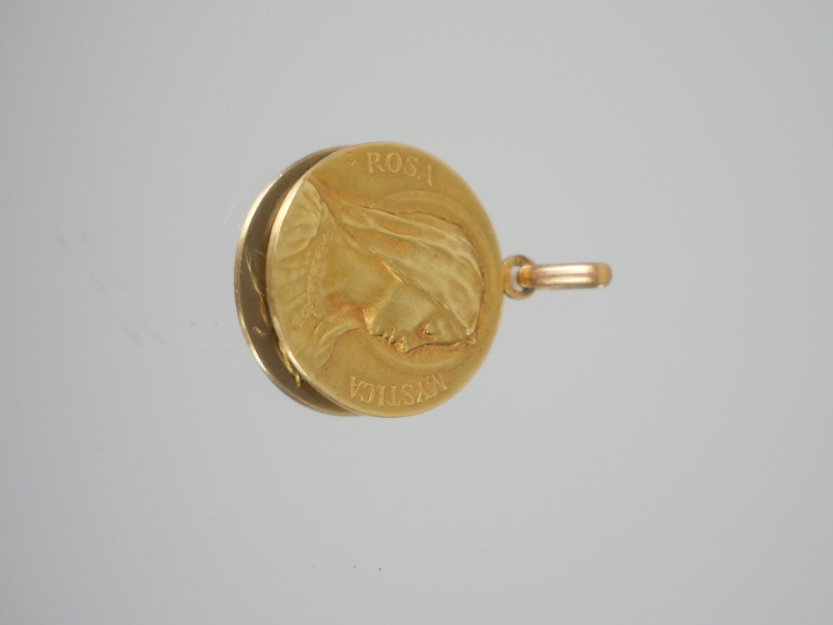 Religious medal in 750 thousandths yellow gold, the obverse bearing the effigy of the Virgin Mary in profile and the inscription "Rosa Mystica", the reverse decorated with flowering branches.