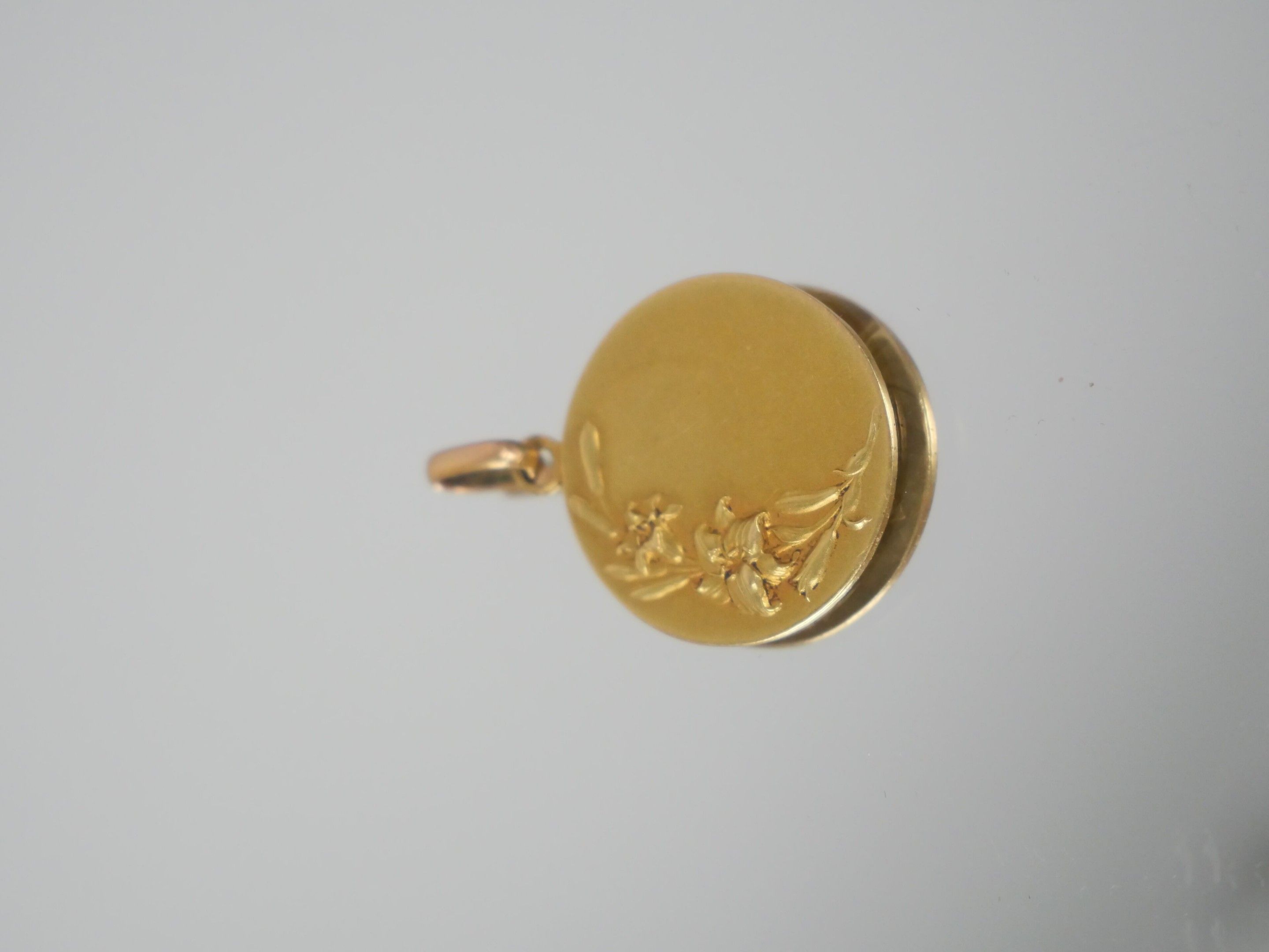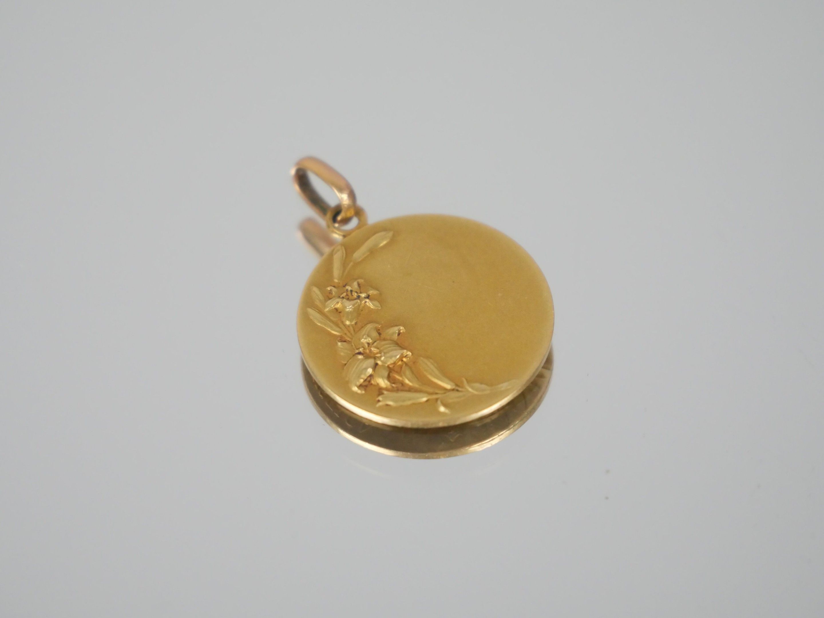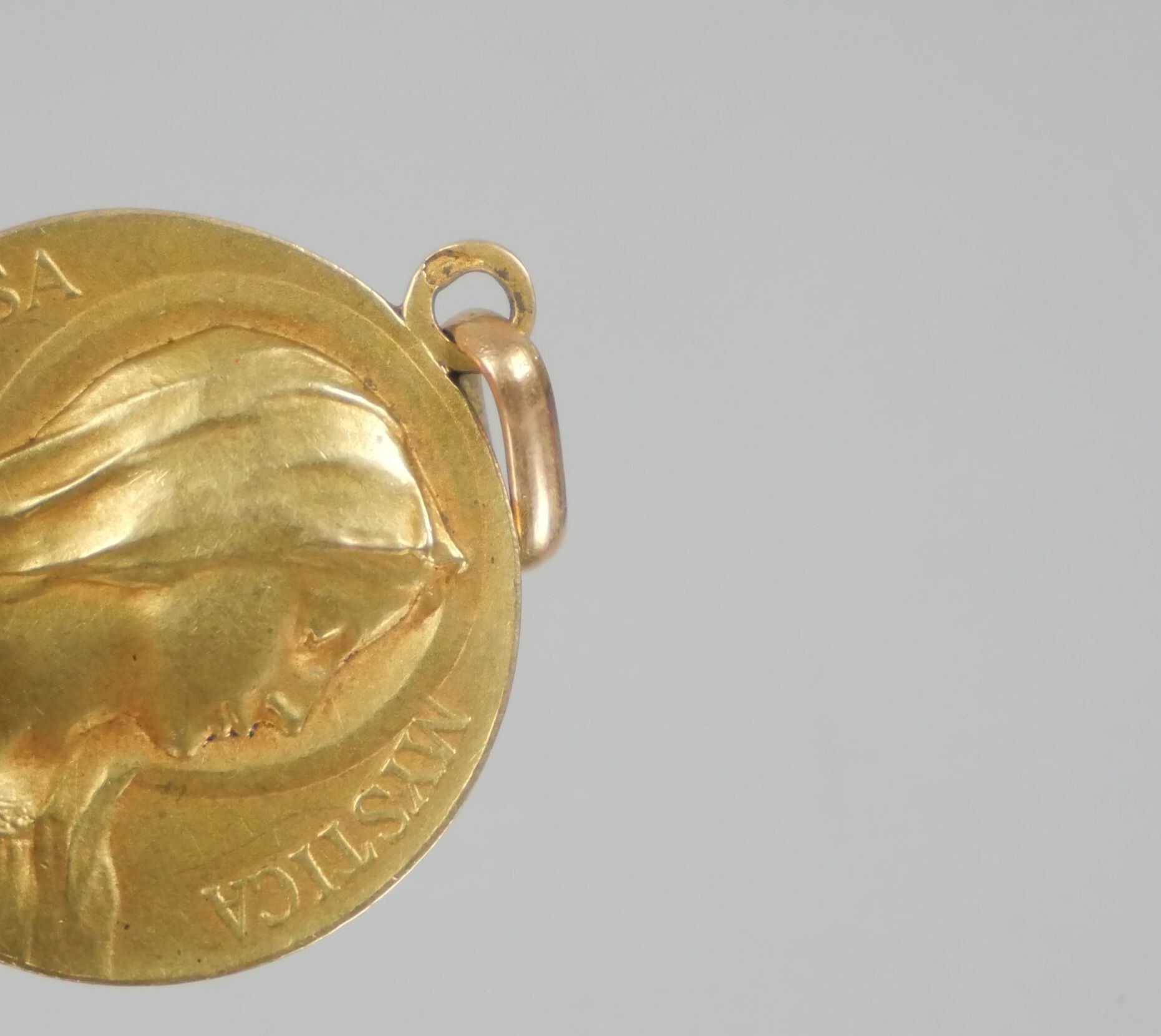 Religious medal in 750 thousandths yellow gold, the obverse bearing the effigy of the Virgin Mary in profile and the inscription "Rosa Mystica", the reverse decorated with flowering branches.
