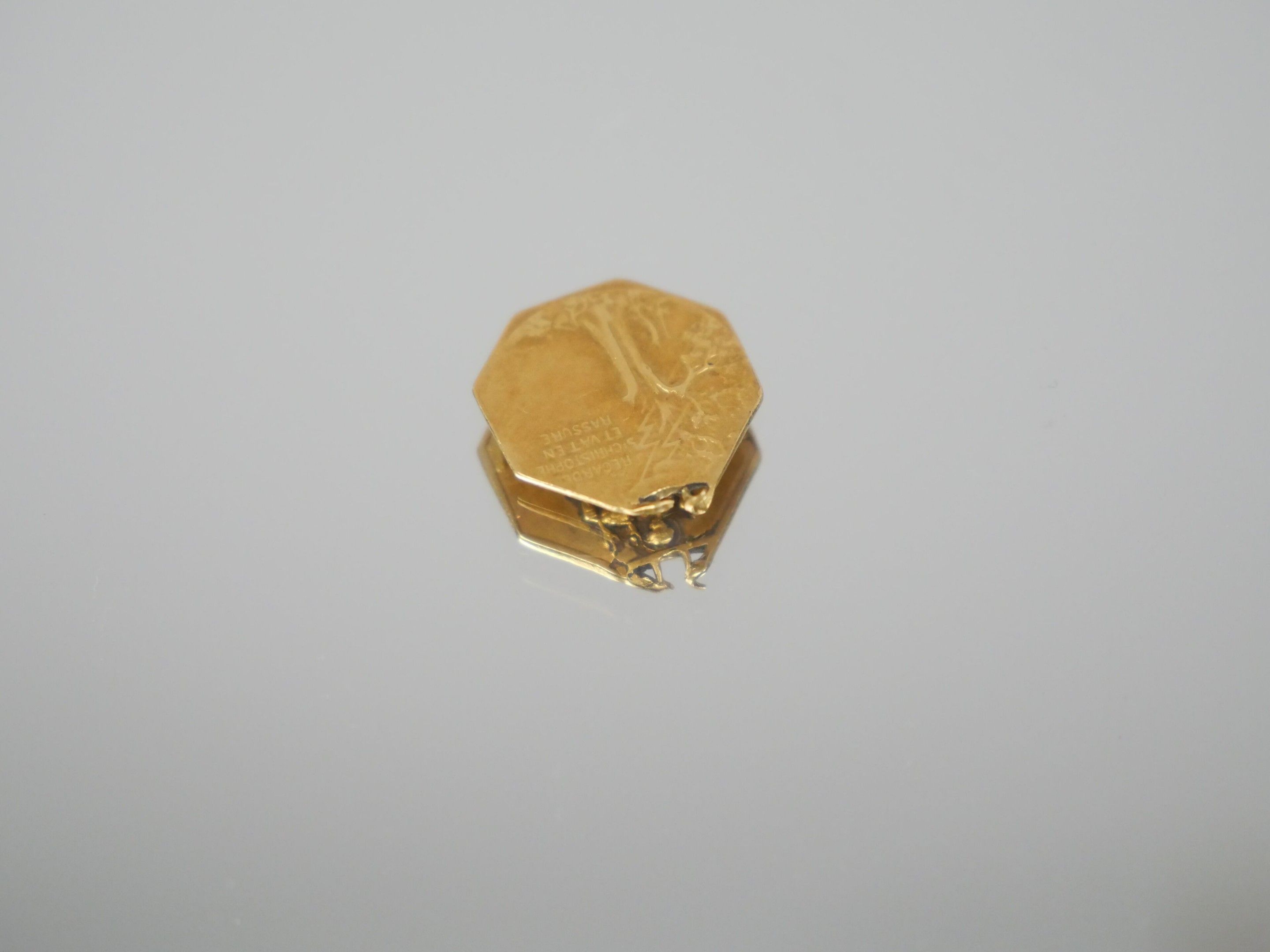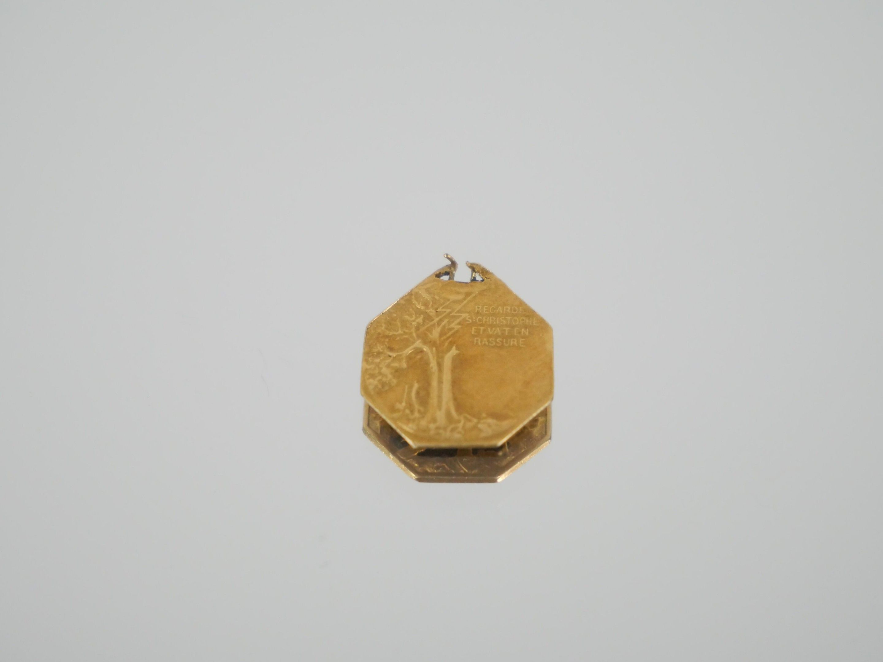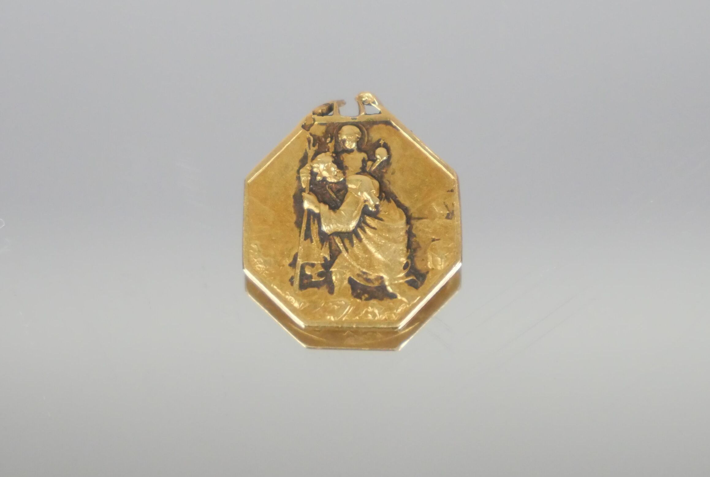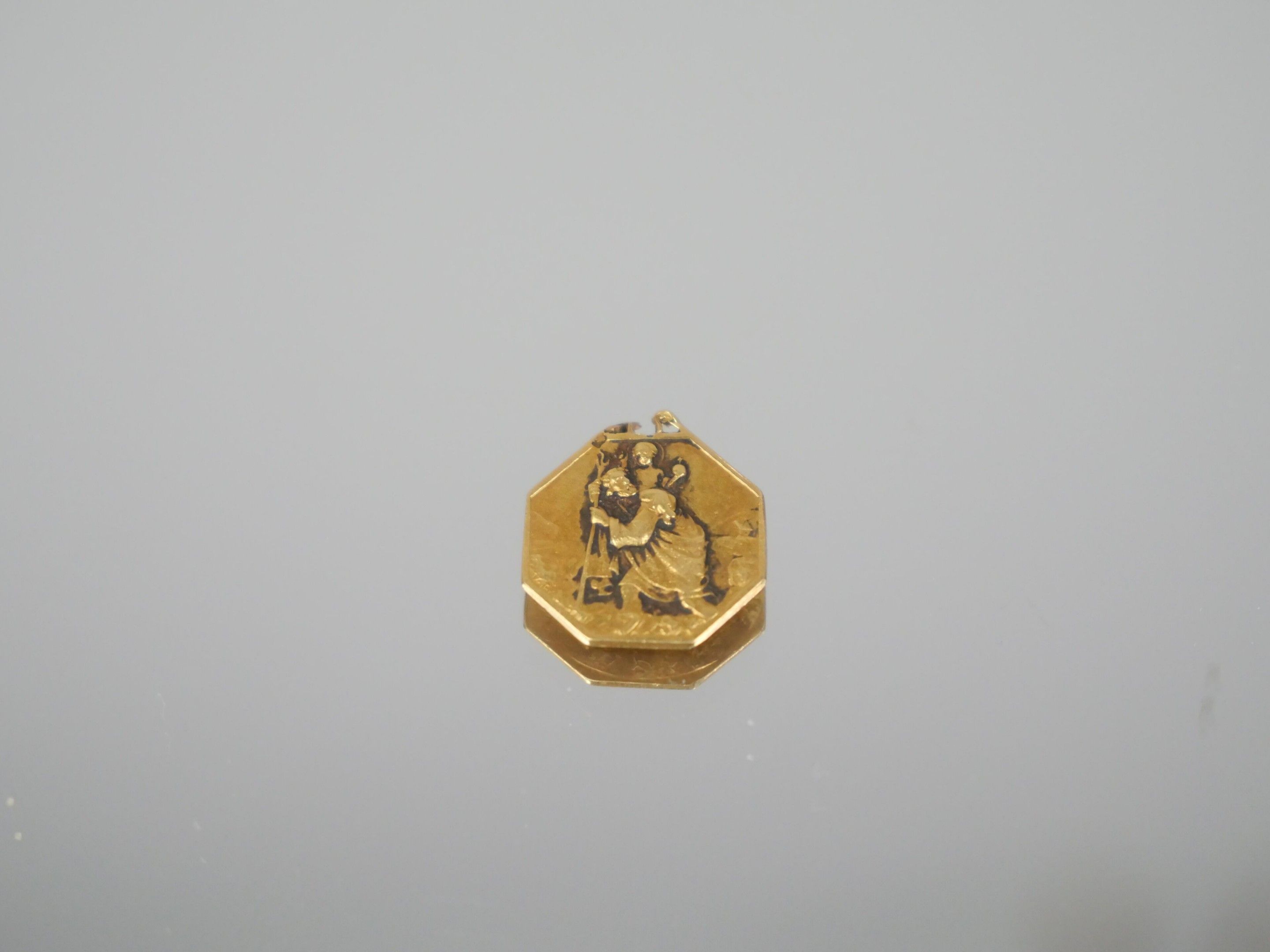 Octagonal religious medallion in 750 thousandths yellow gold, the obverse decorated with Saint Christophe in slight relief, the reverse engraved with the inscription "Regarde Saint Christophe et va t-en rassuré".