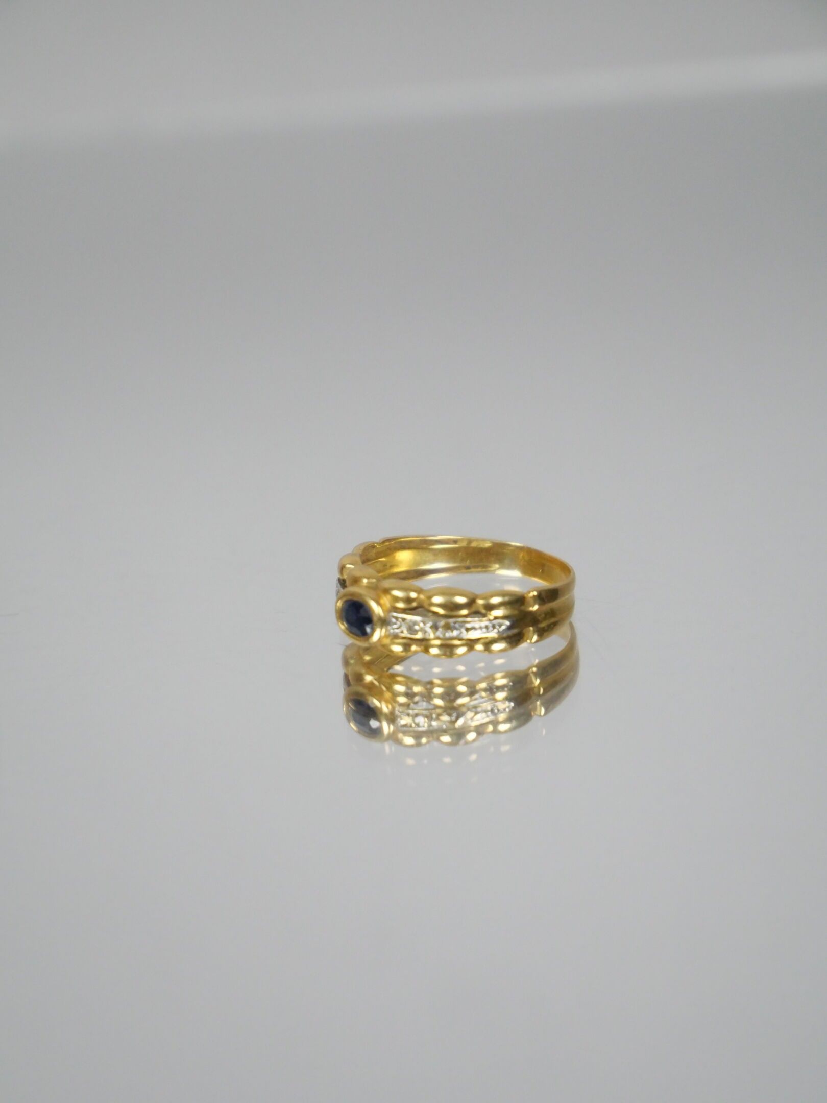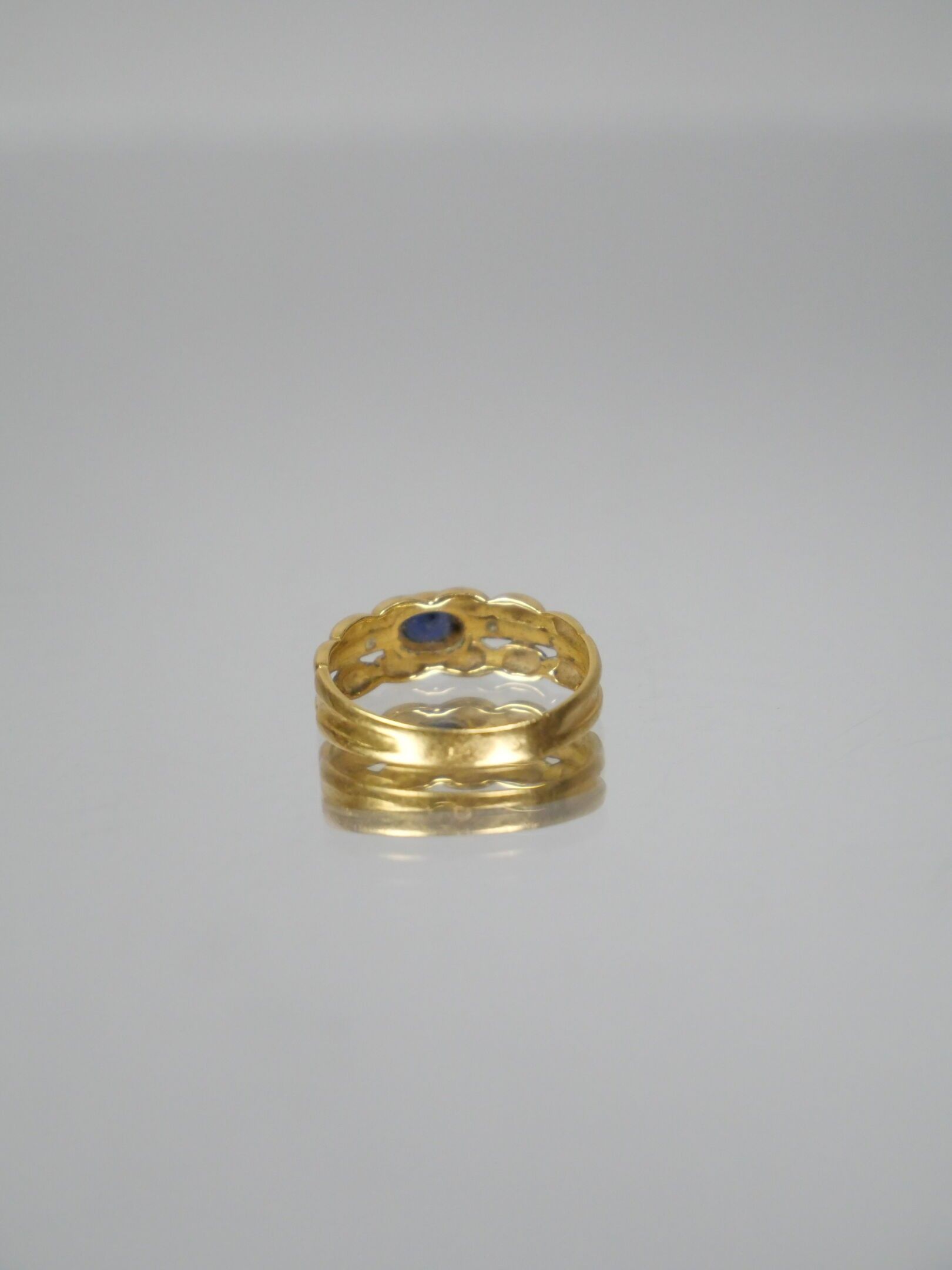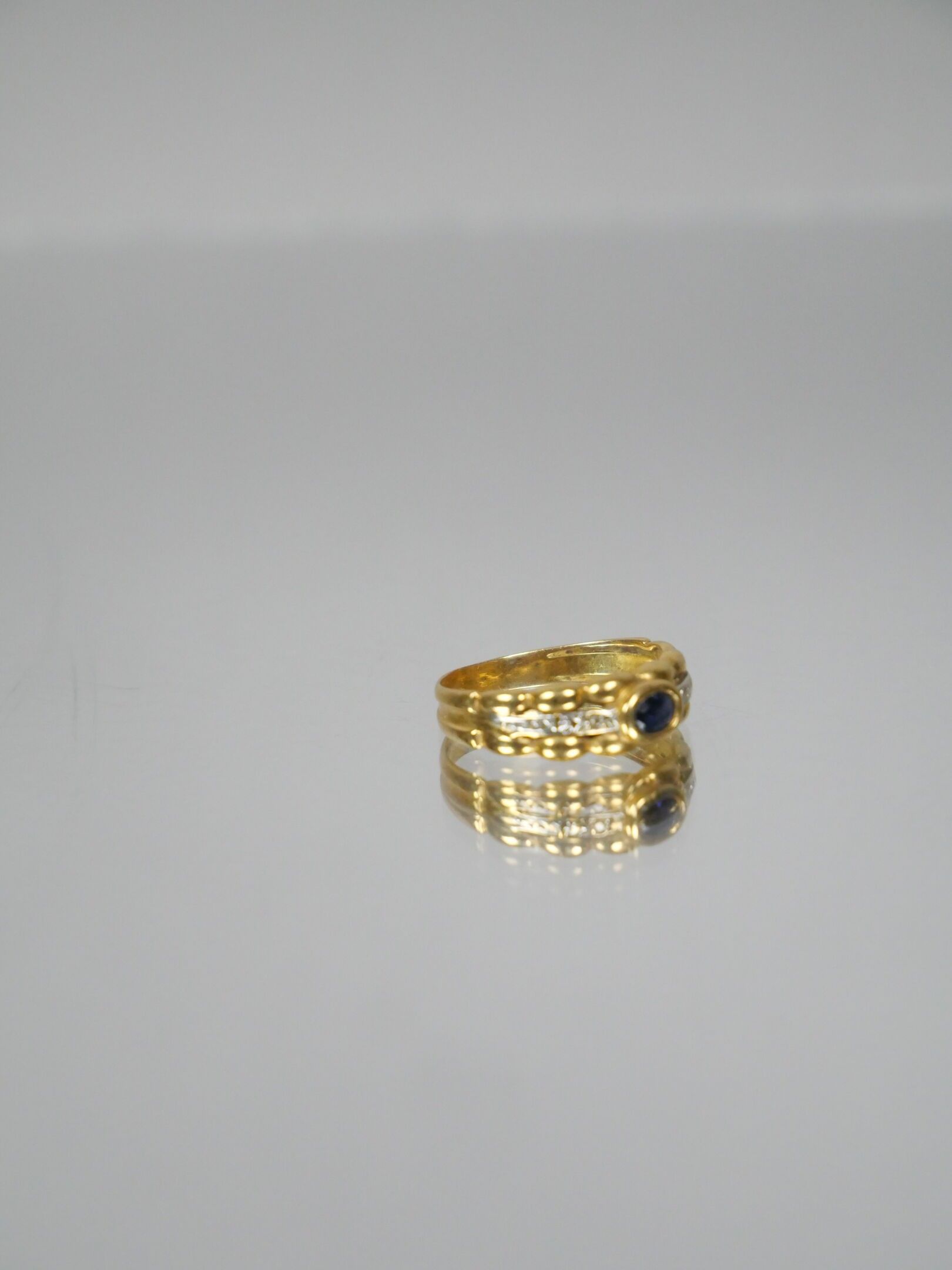 Wedding band ring in 750 thousandths yellow and white gold with gadrooned decoration, centred on an oval facetted blue sapphire in a closed setting, with small diamond chips.