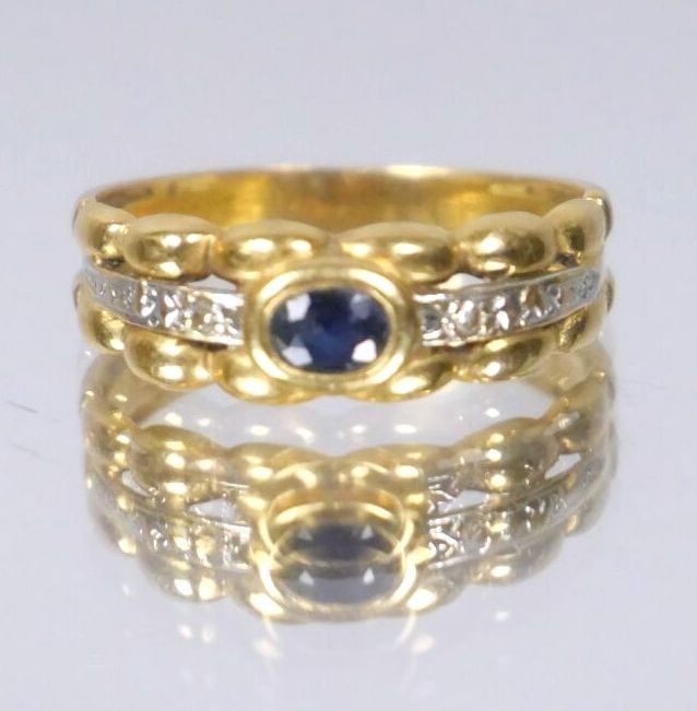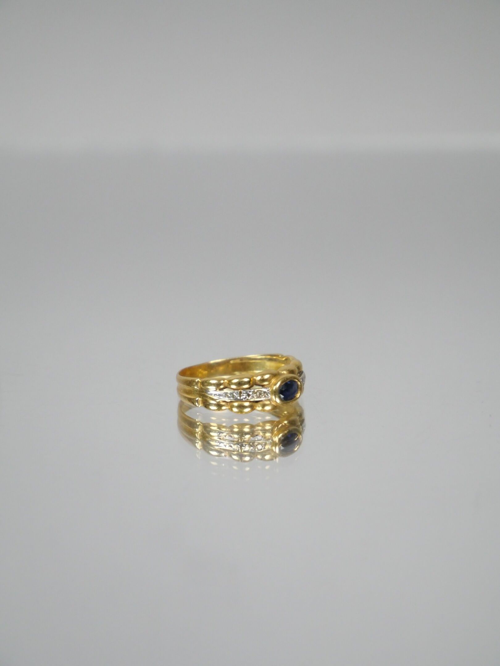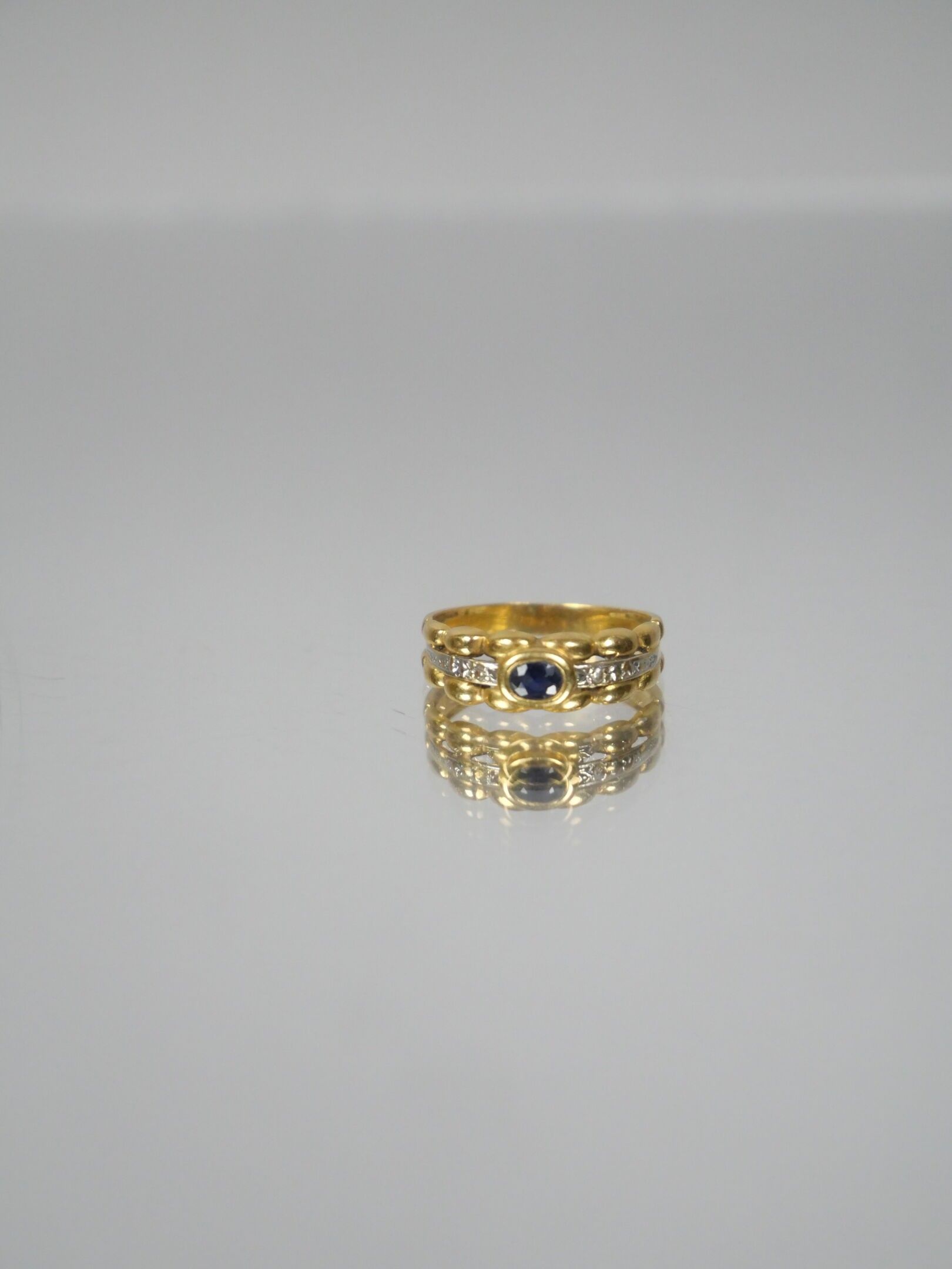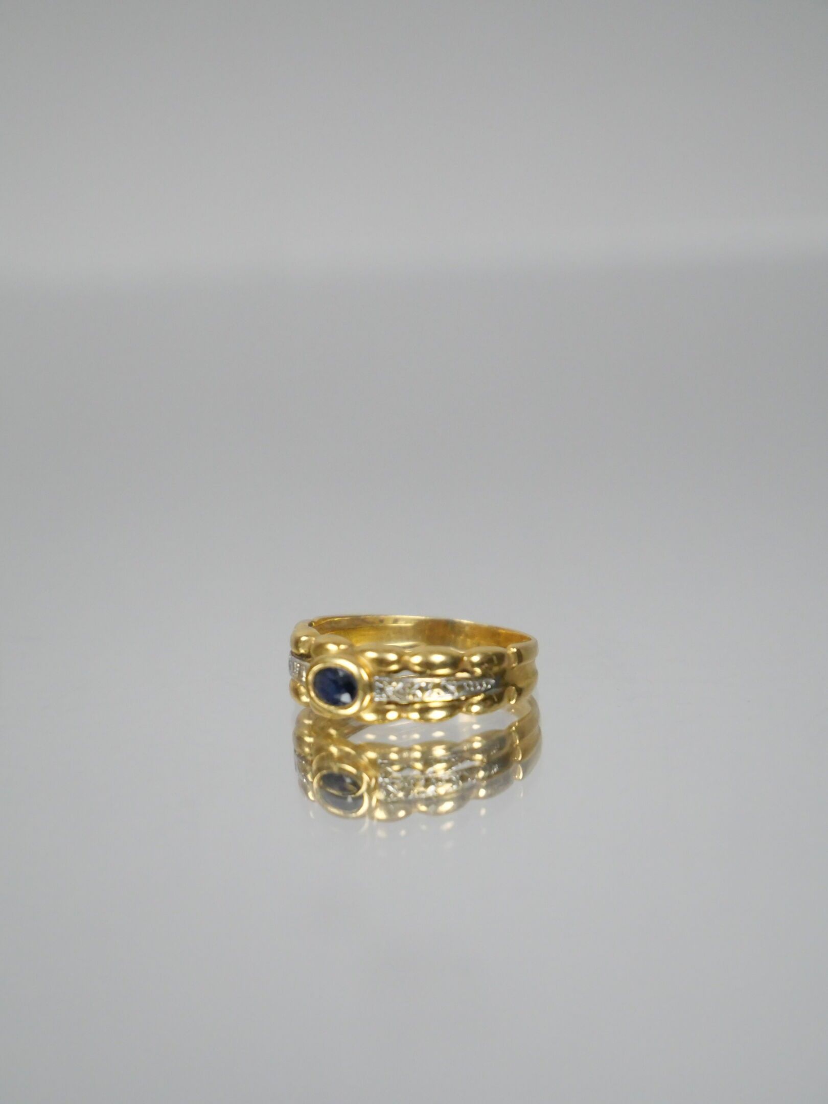Wedding band ring in 750 thousandths yellow and white gold with gadrooned decoration, centred on an oval facetted blue sapphire in a closed setting, with small diamond chips.