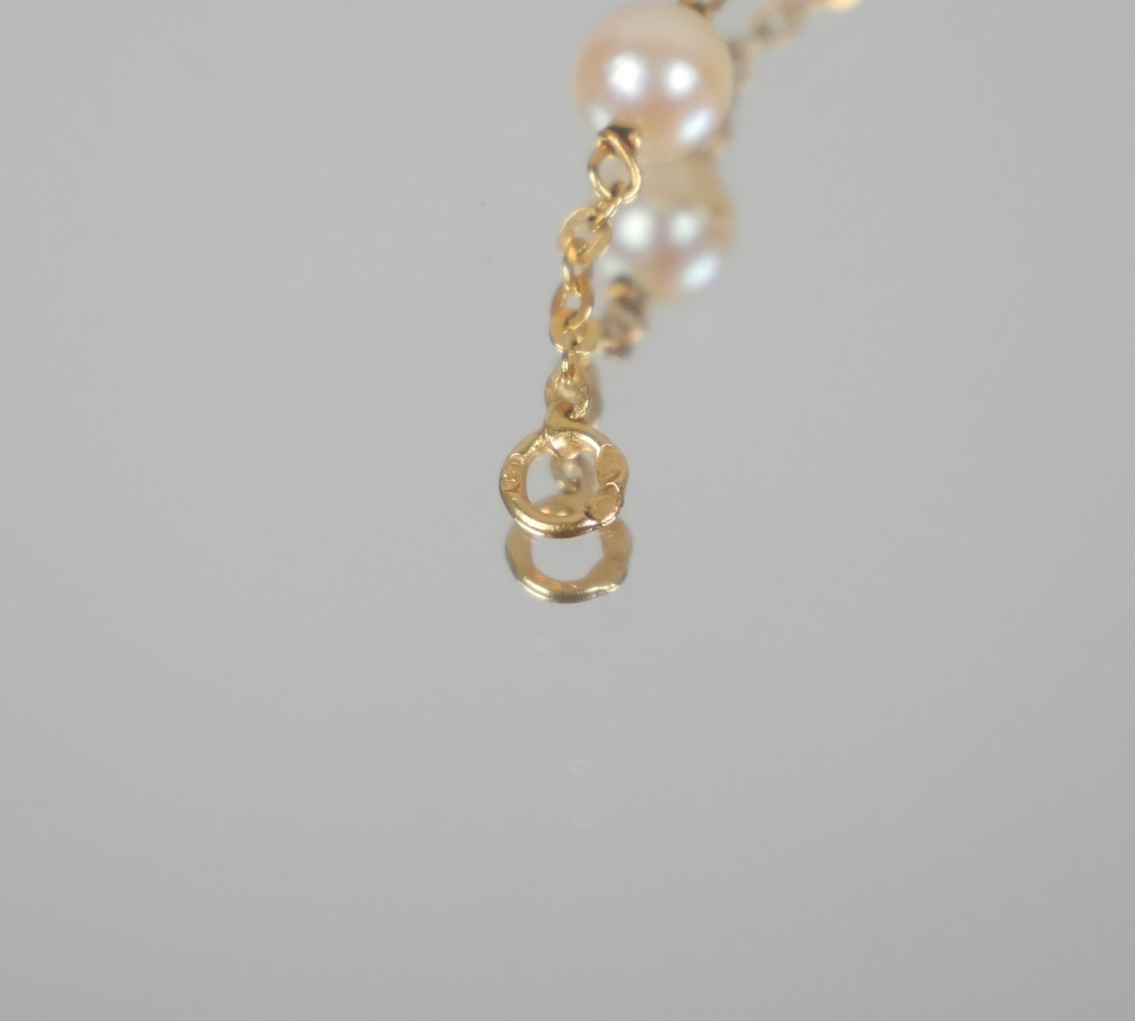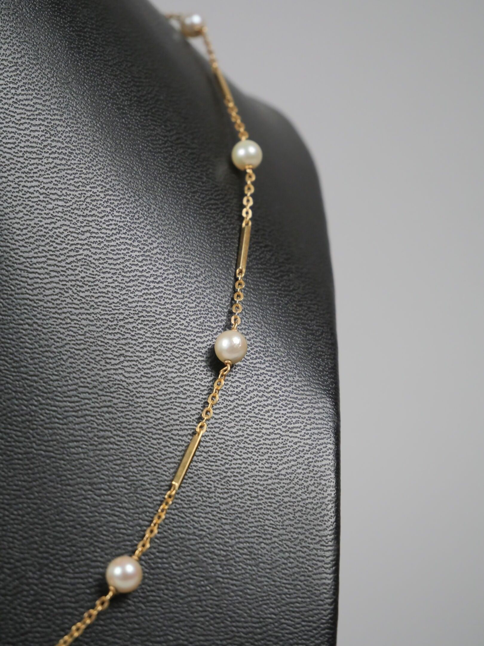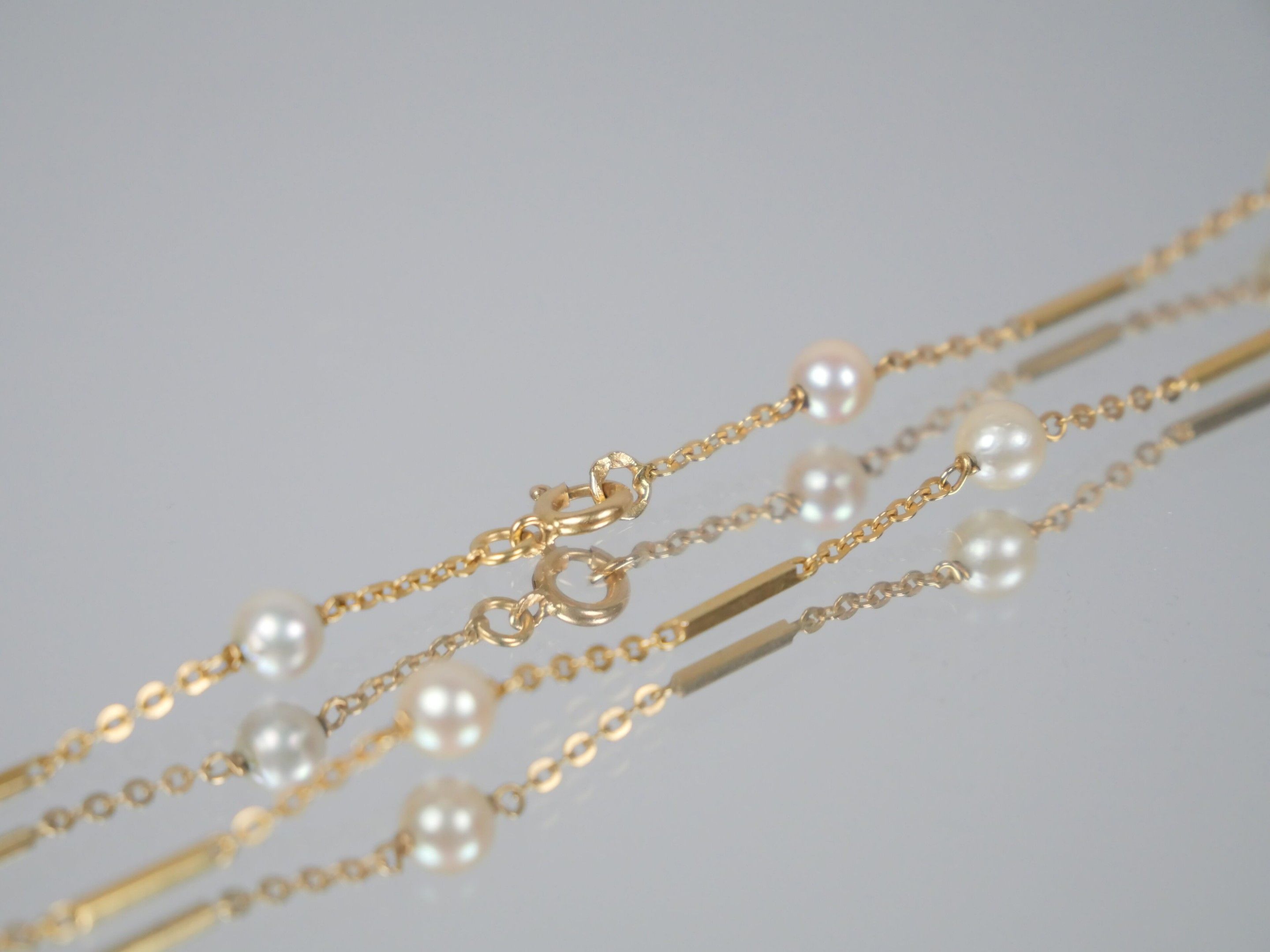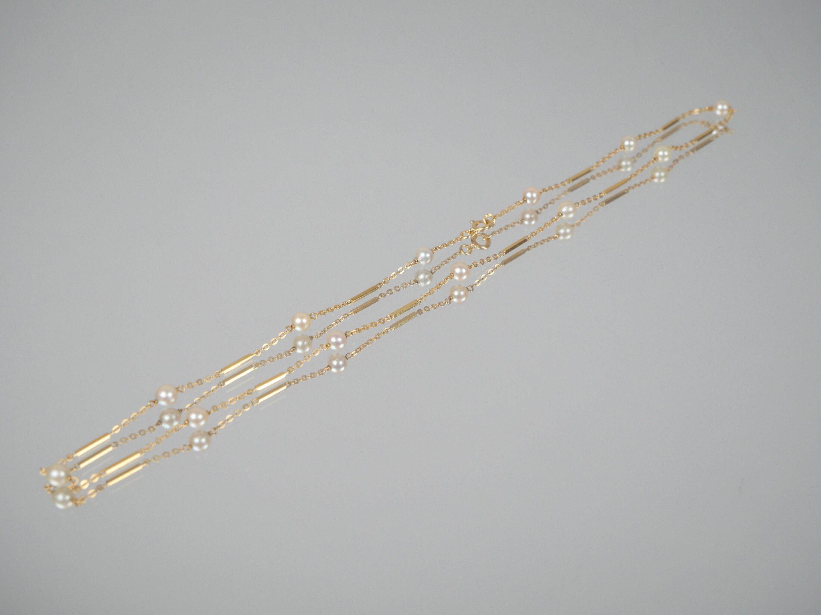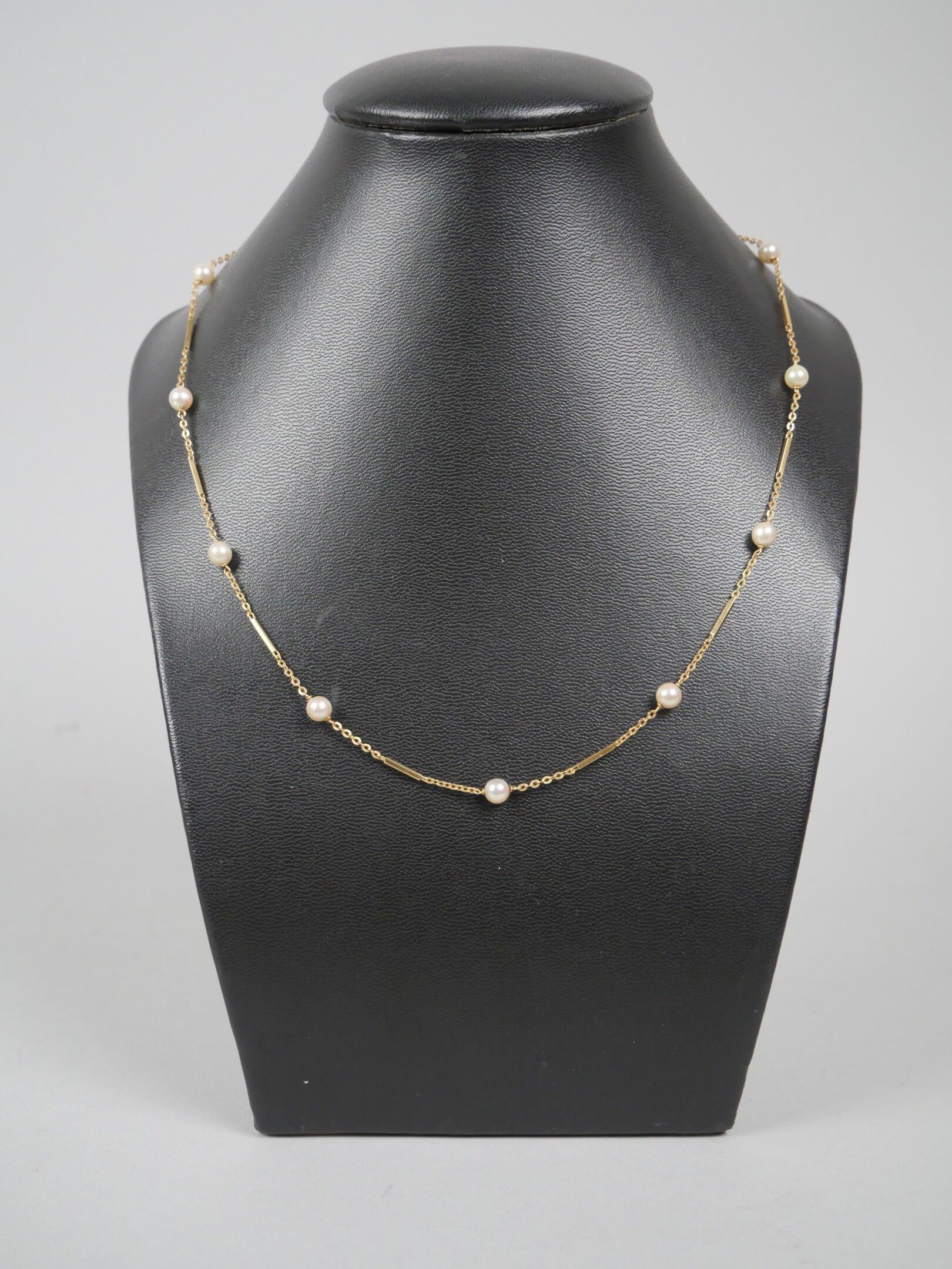 Necklace in 750 thousandths yellow gold with a barrette stitch decorated with twelve small cultured pearls.