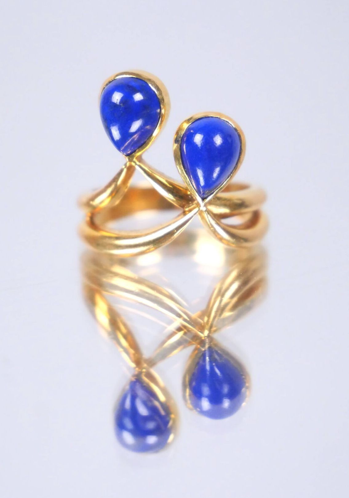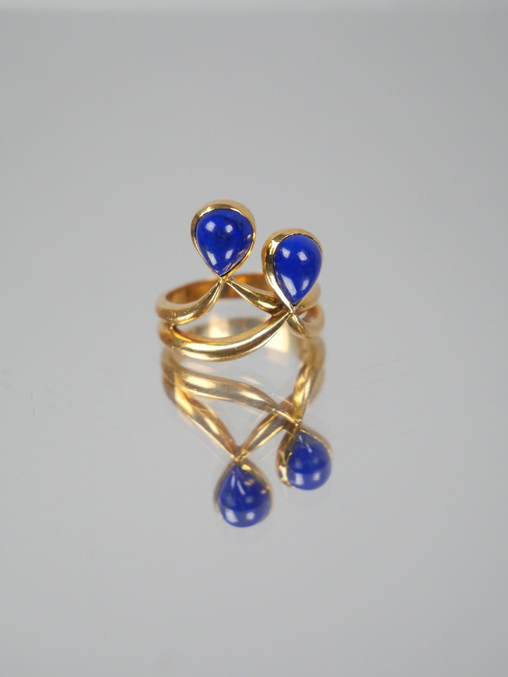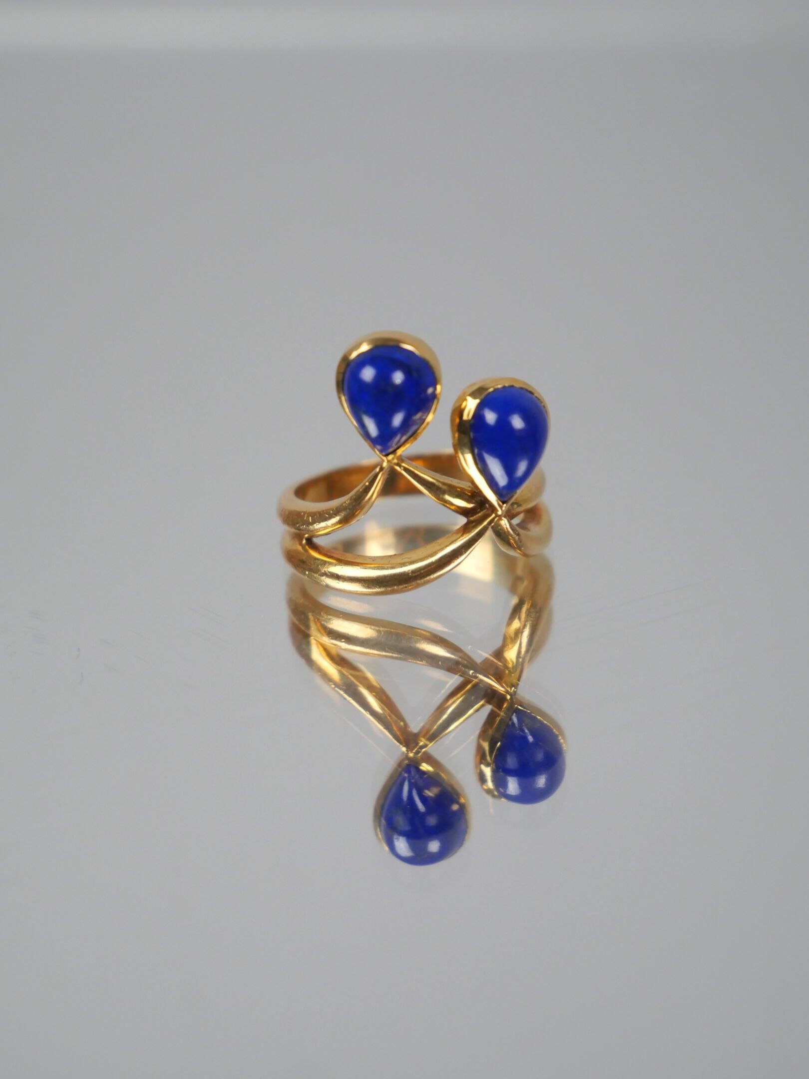 Ring in 750 thousandths yellow gold set with two pear-cut lapis lazuli style hard stones.