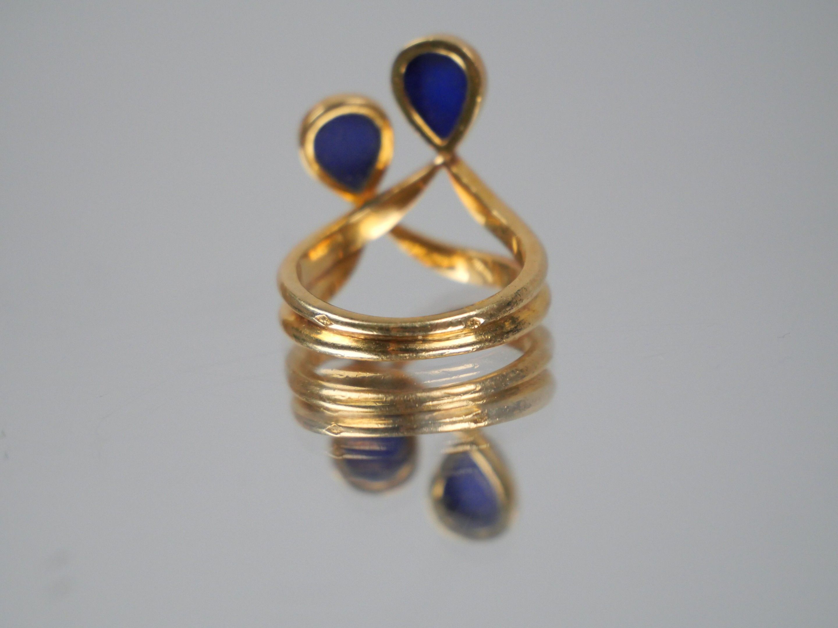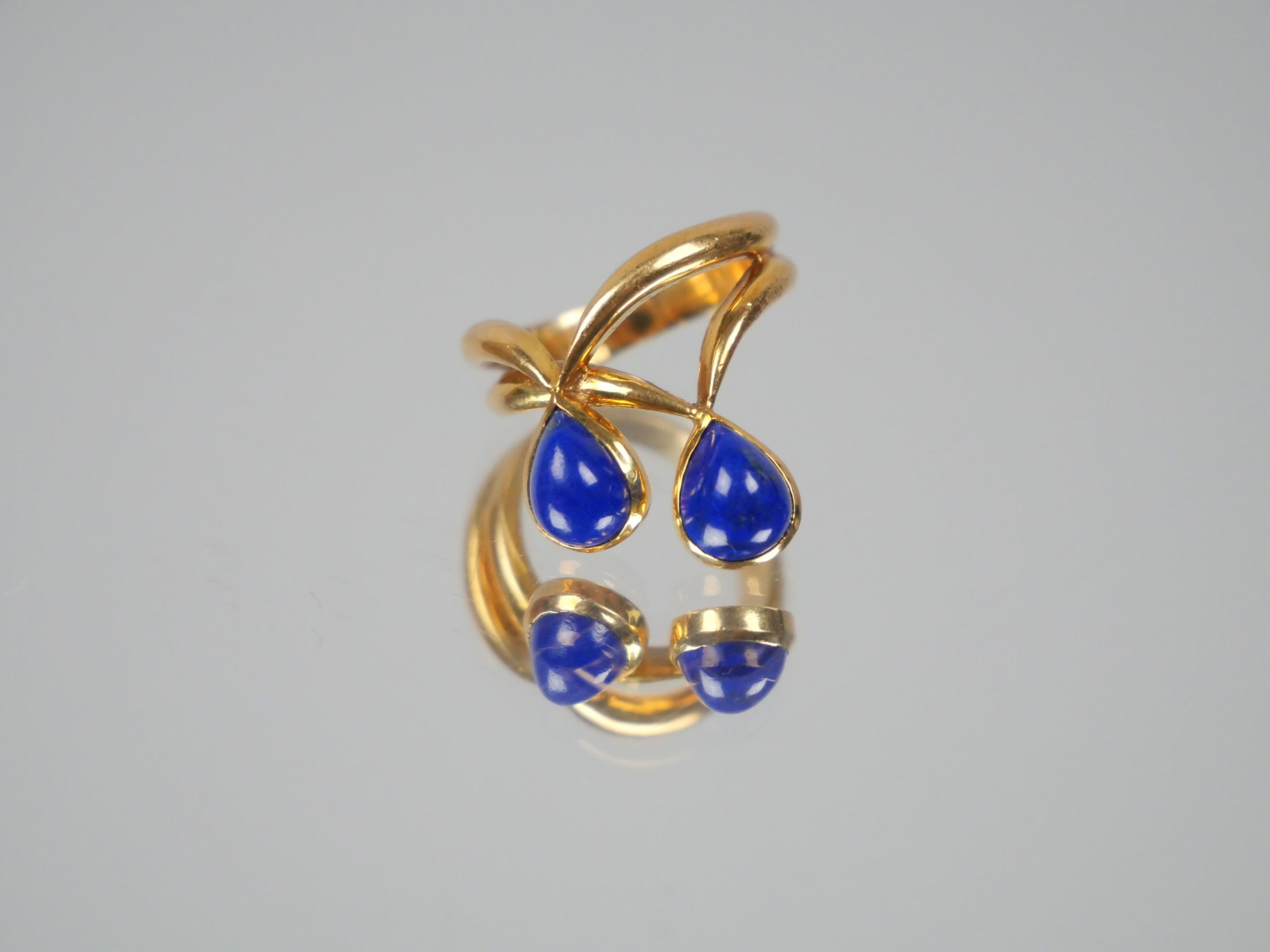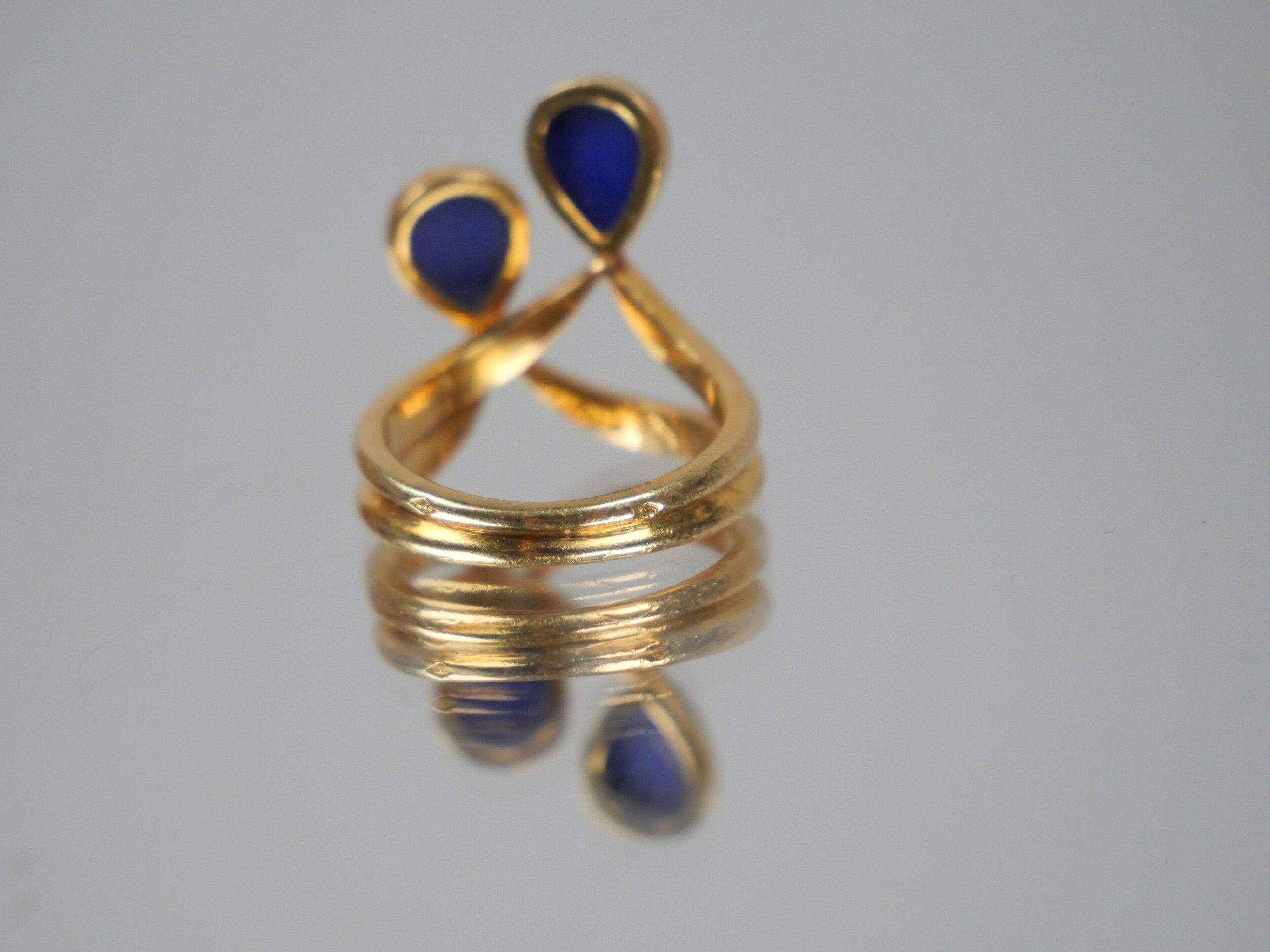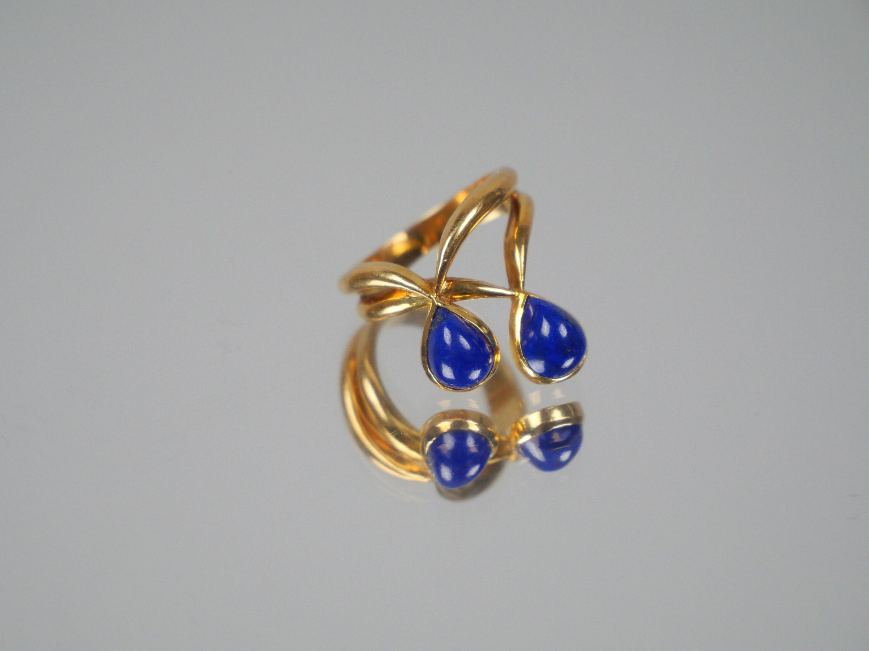Ring in 750 thousandths yellow gold set with two pear-cut lapis lazuli style hard stones.